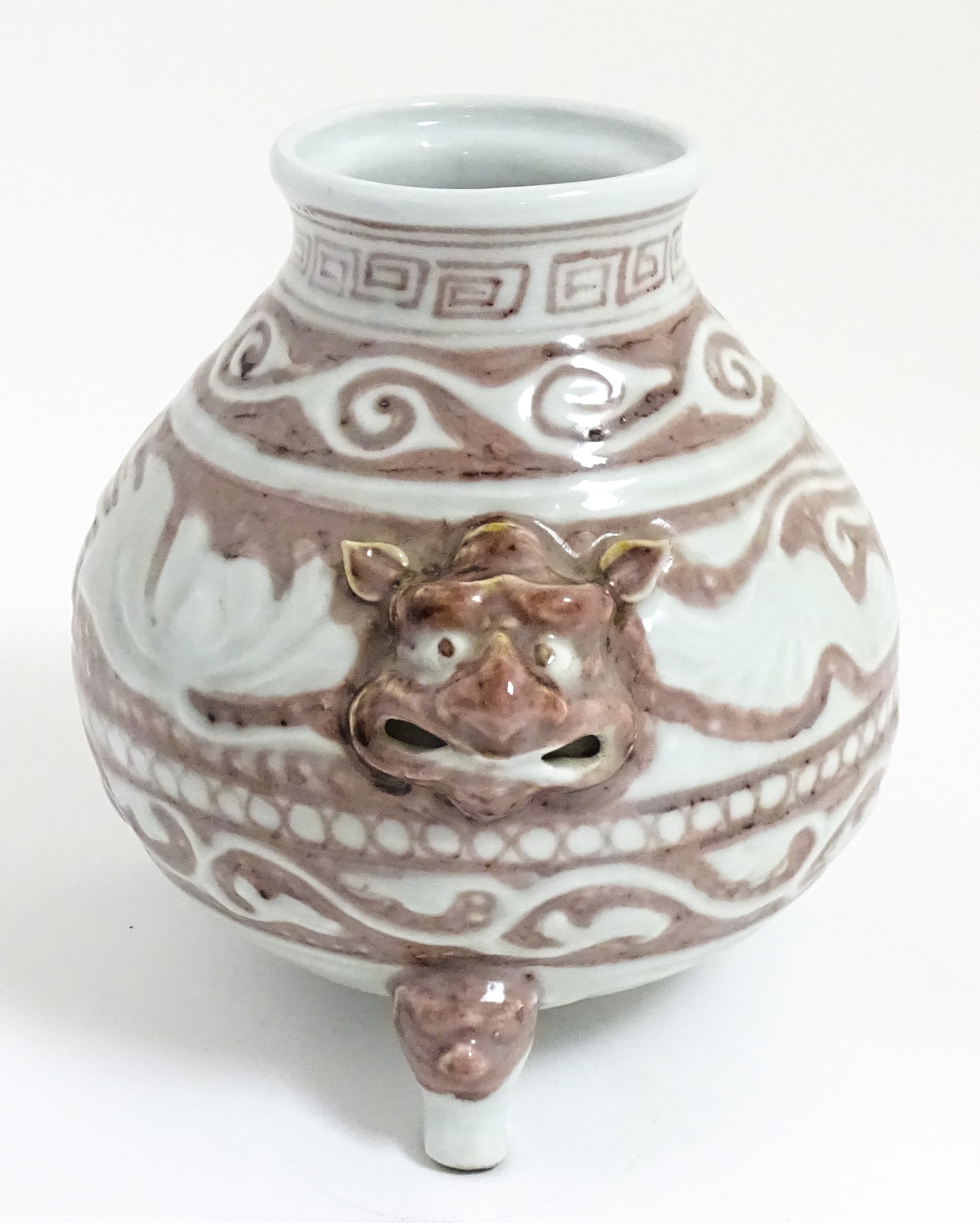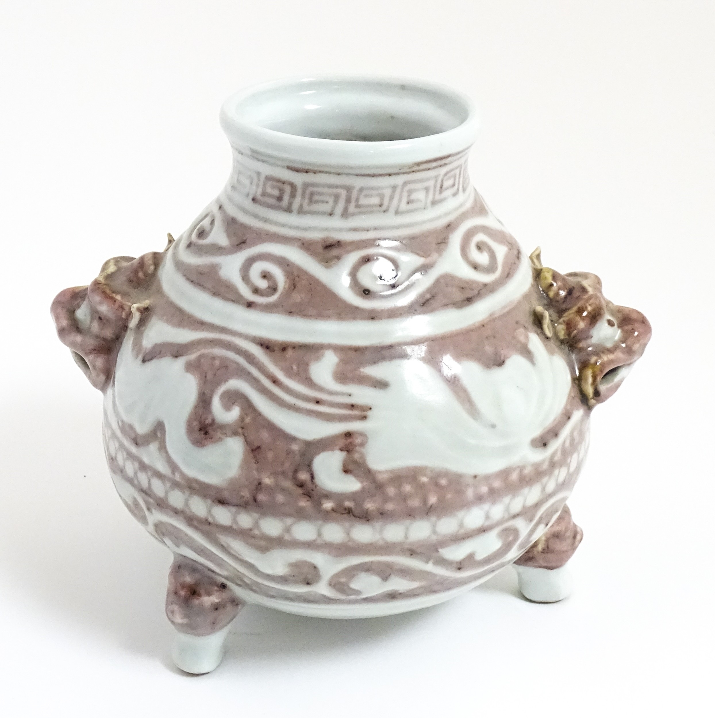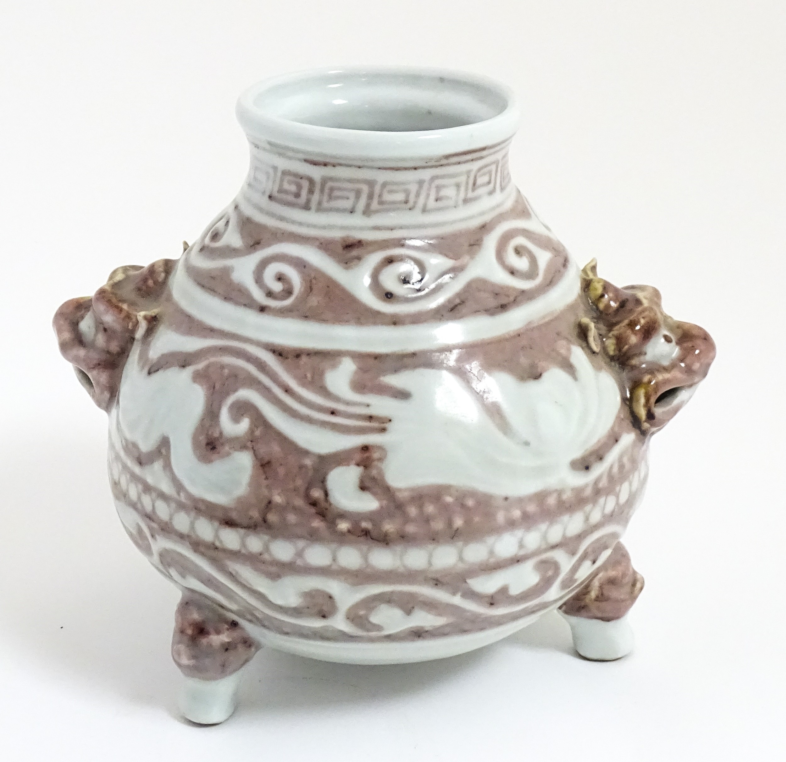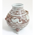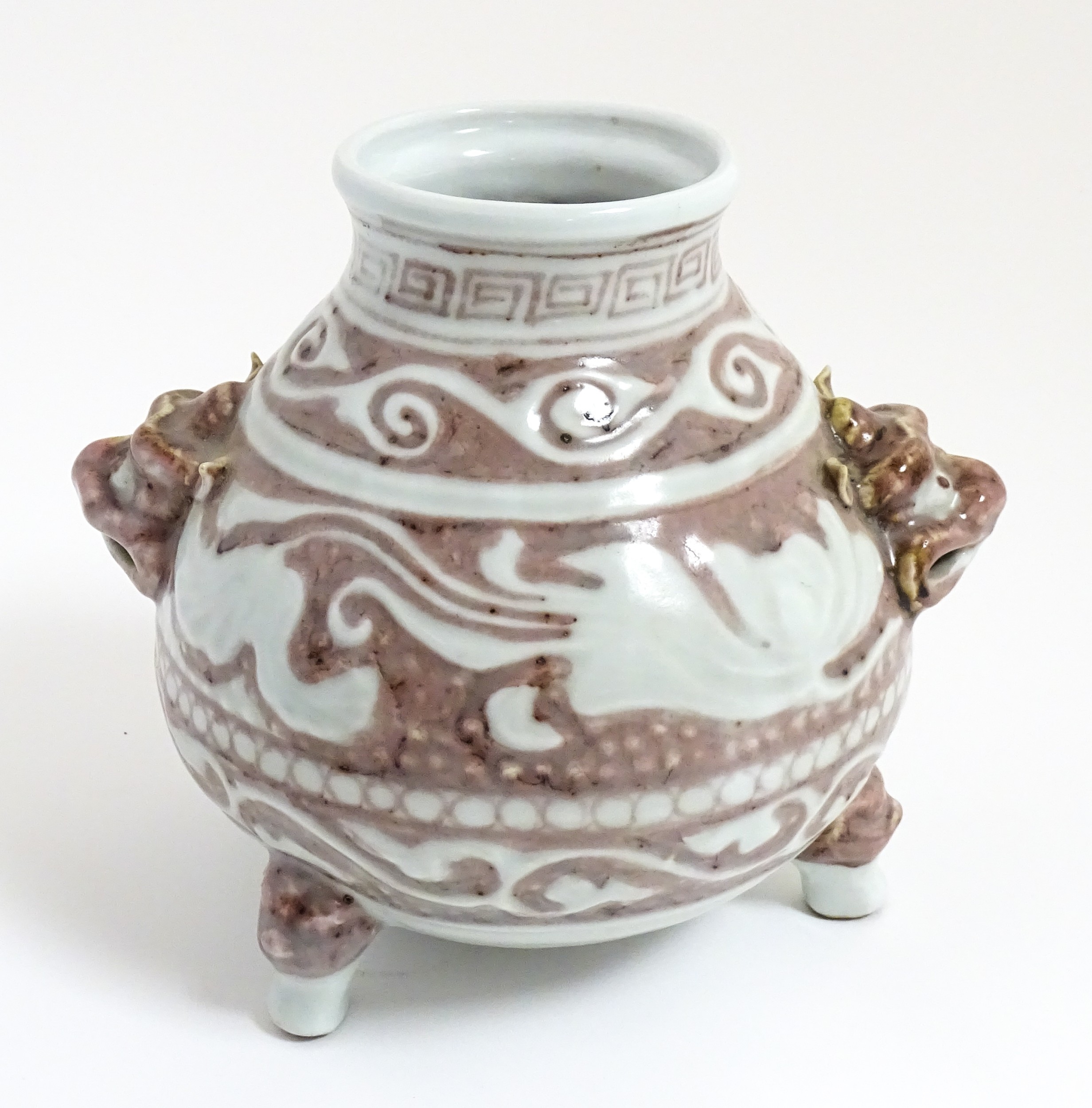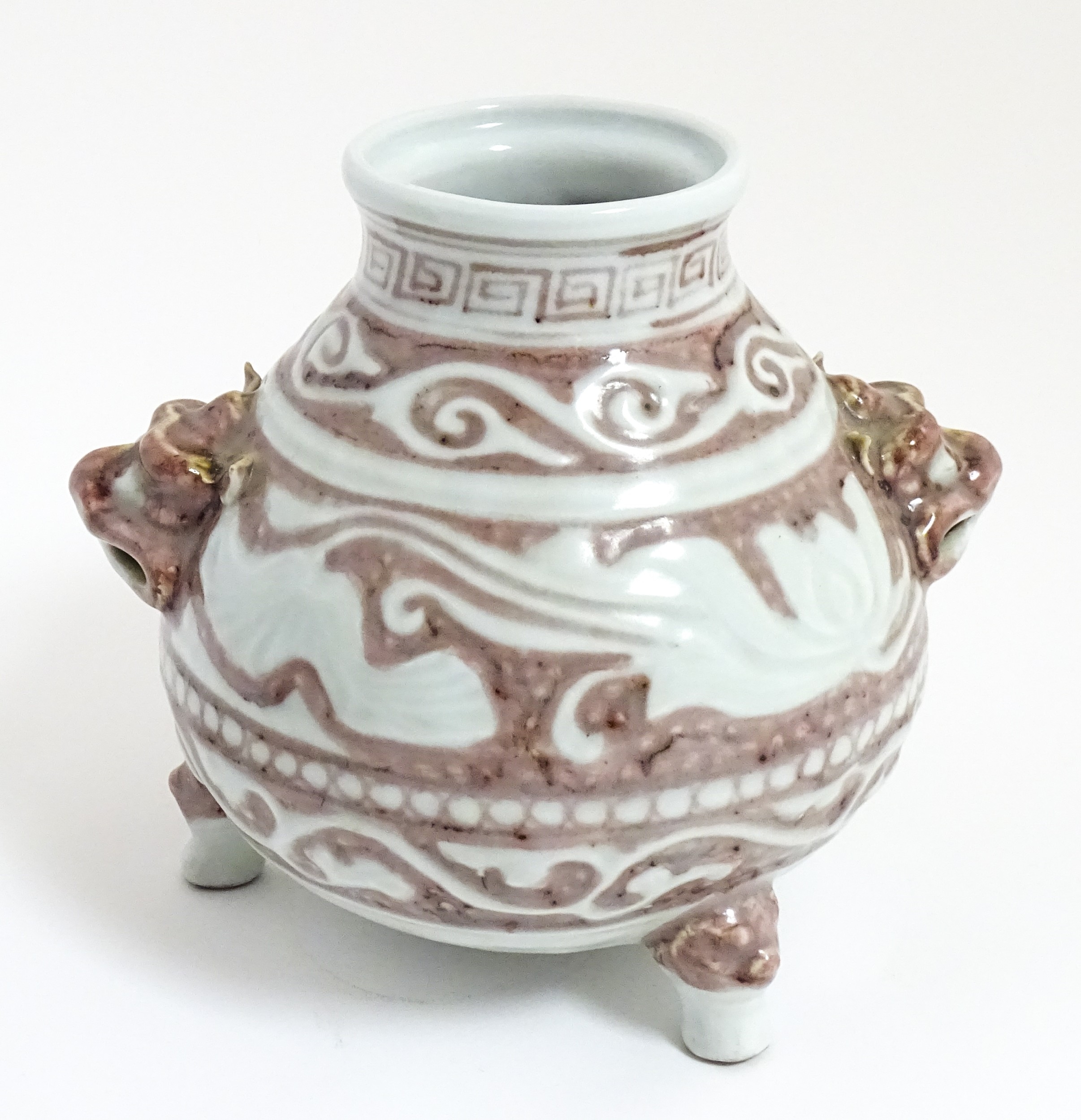 A Chinese red underglaze vase with twin animal mask handles and banded borders, raised on three feet. Character marks under. Approx. 7" high