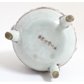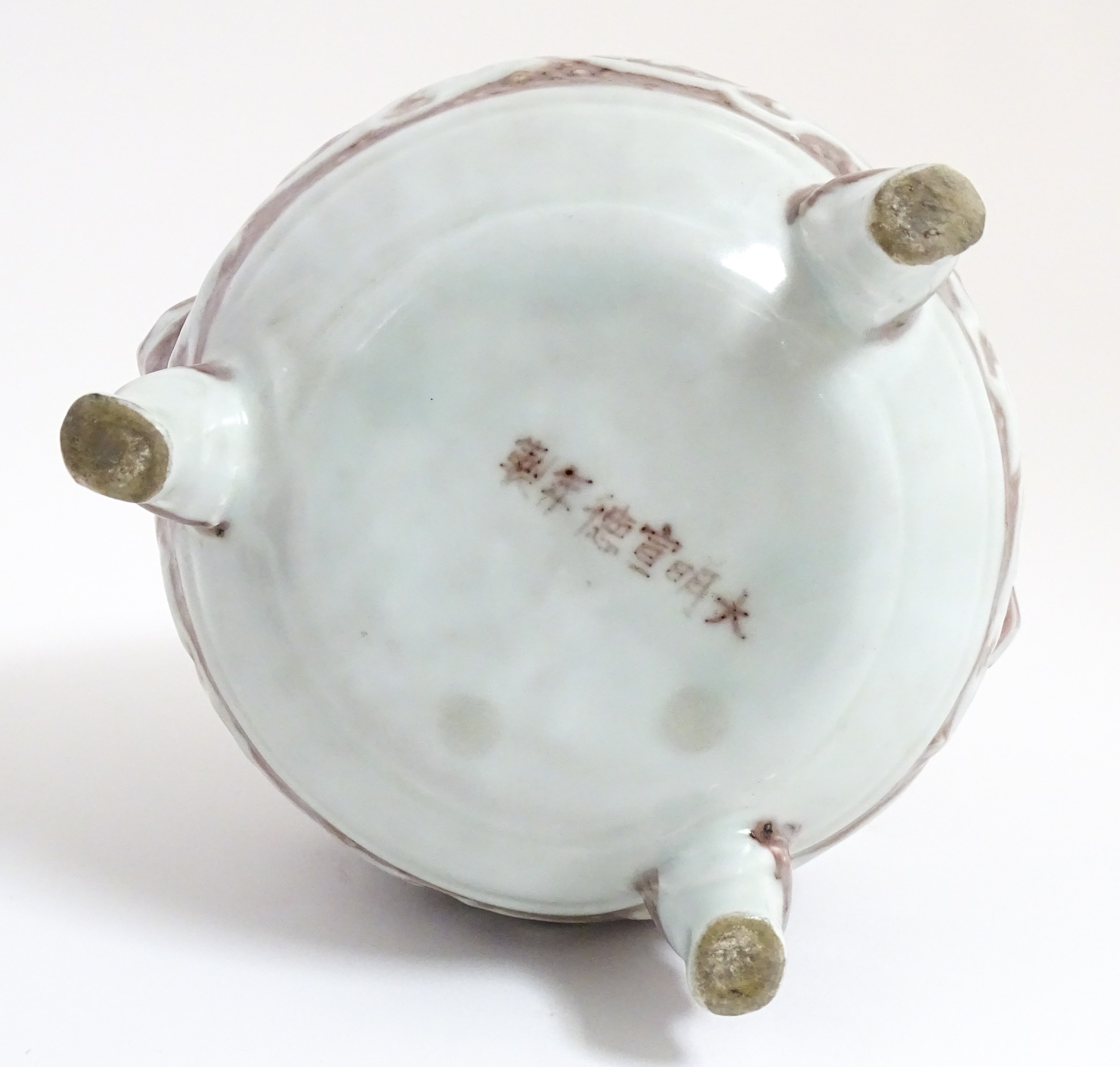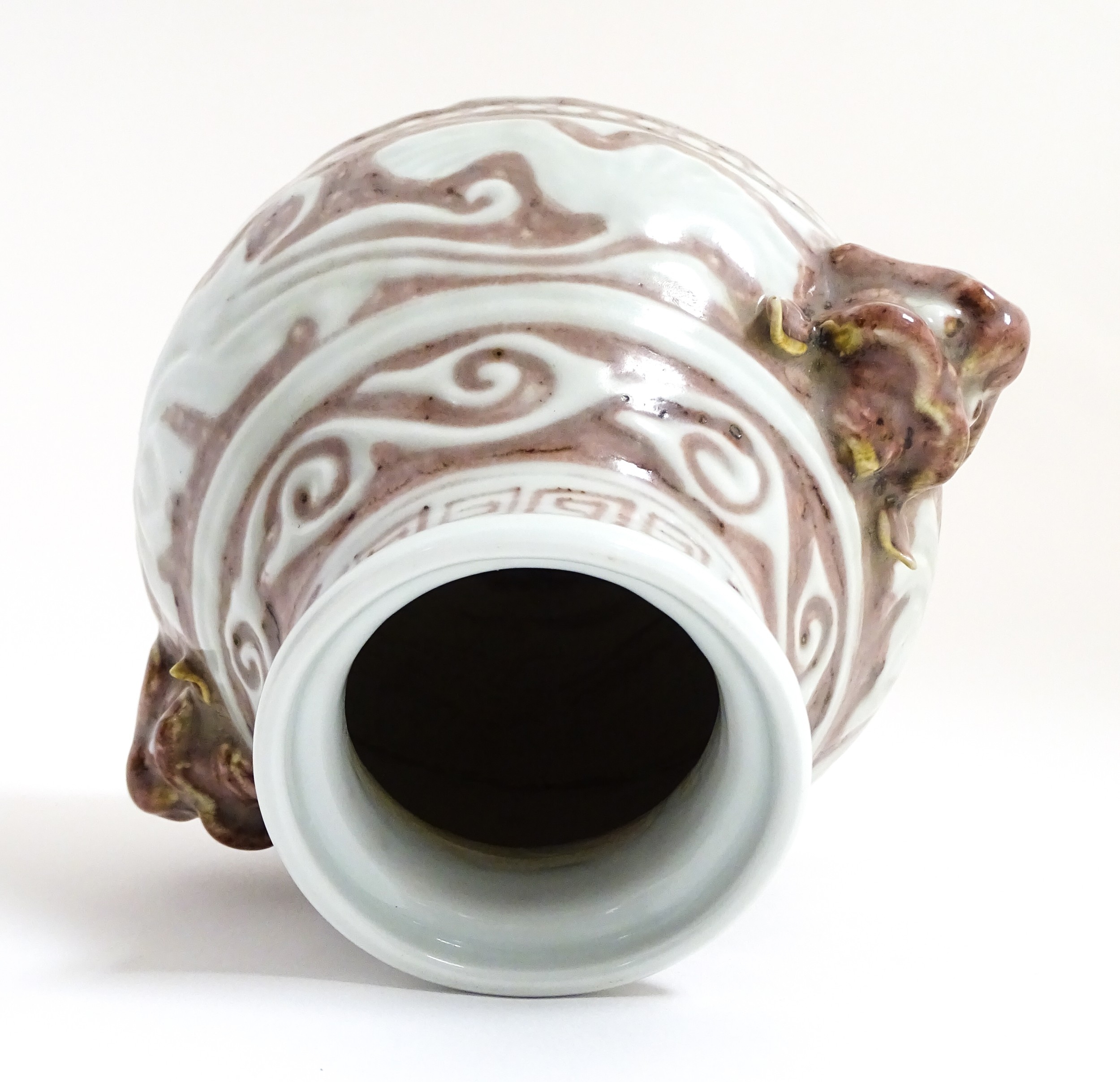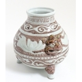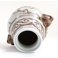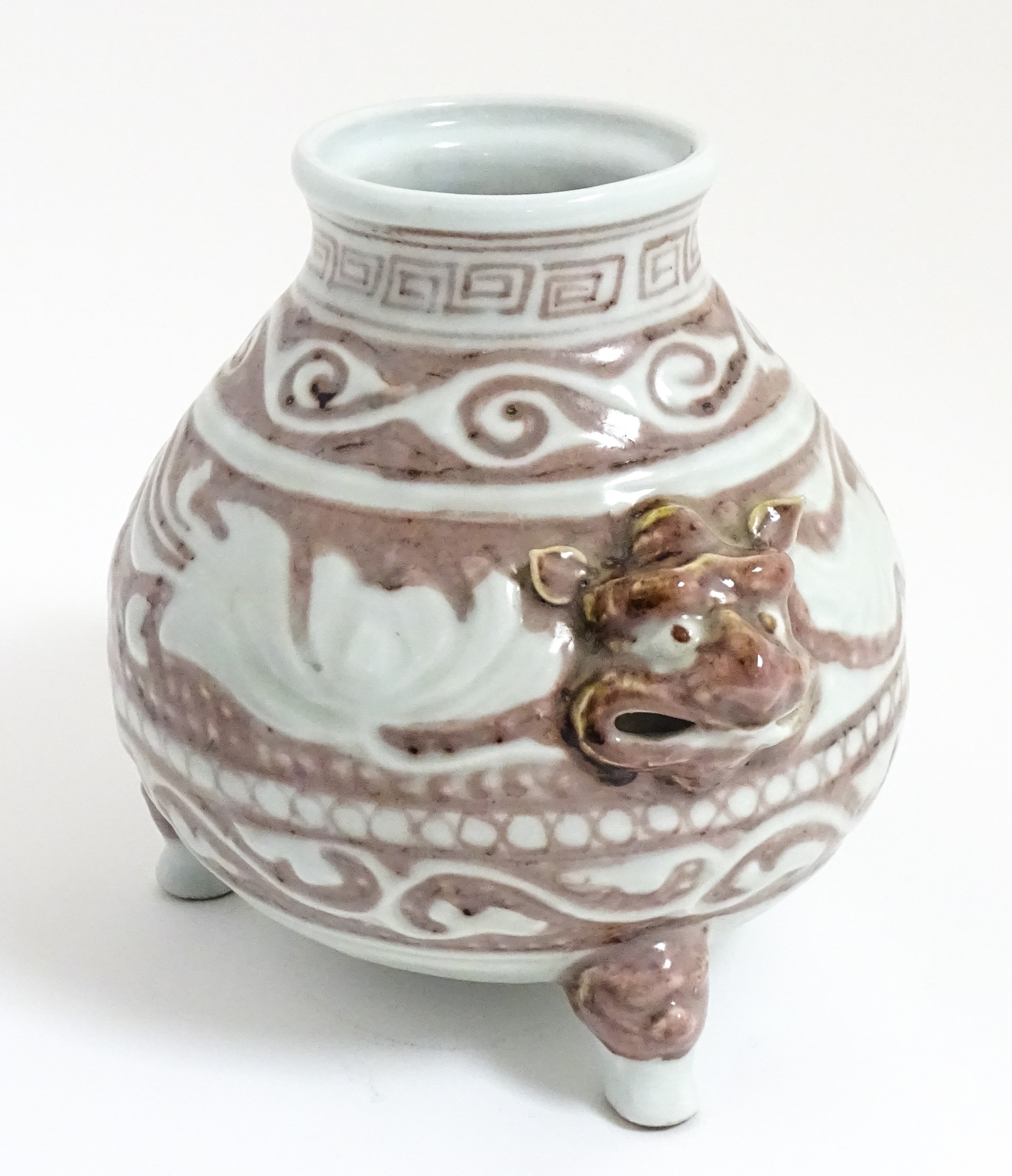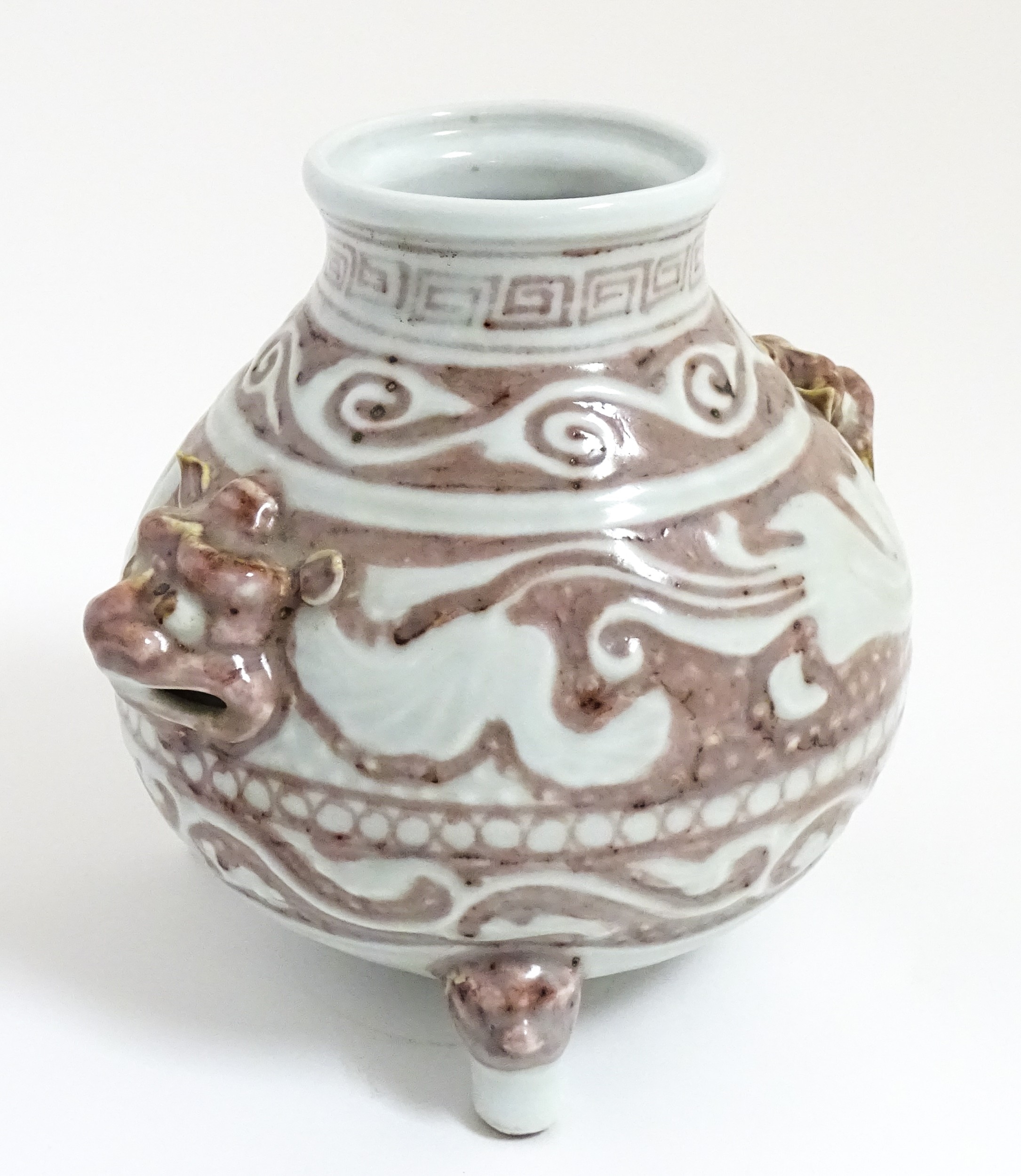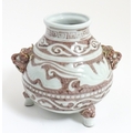 A Chinese red underglaze vase with twin animal mask handles and banded borders, raised on three feet. Character marks under. Approx. 7" high