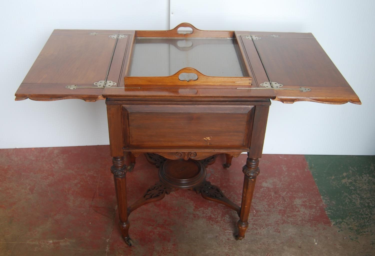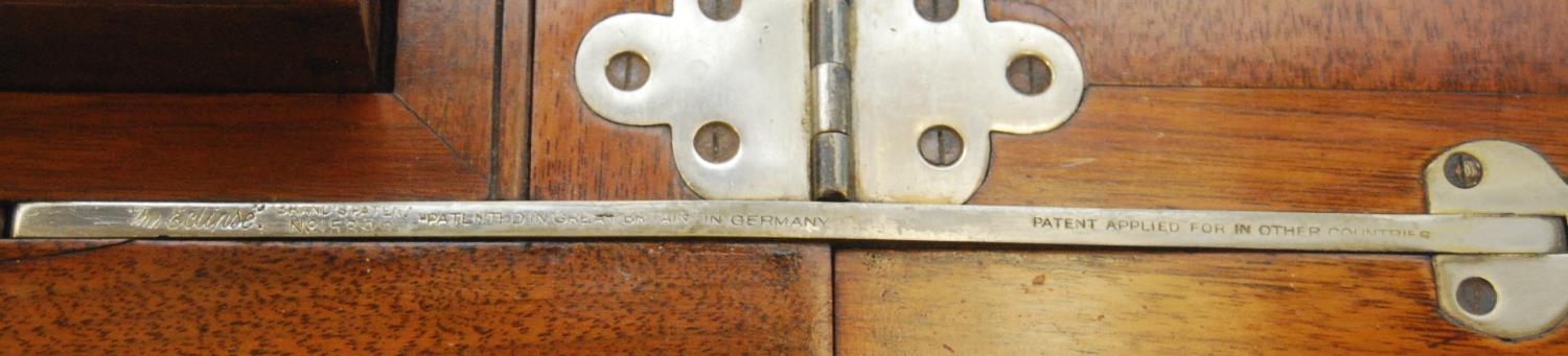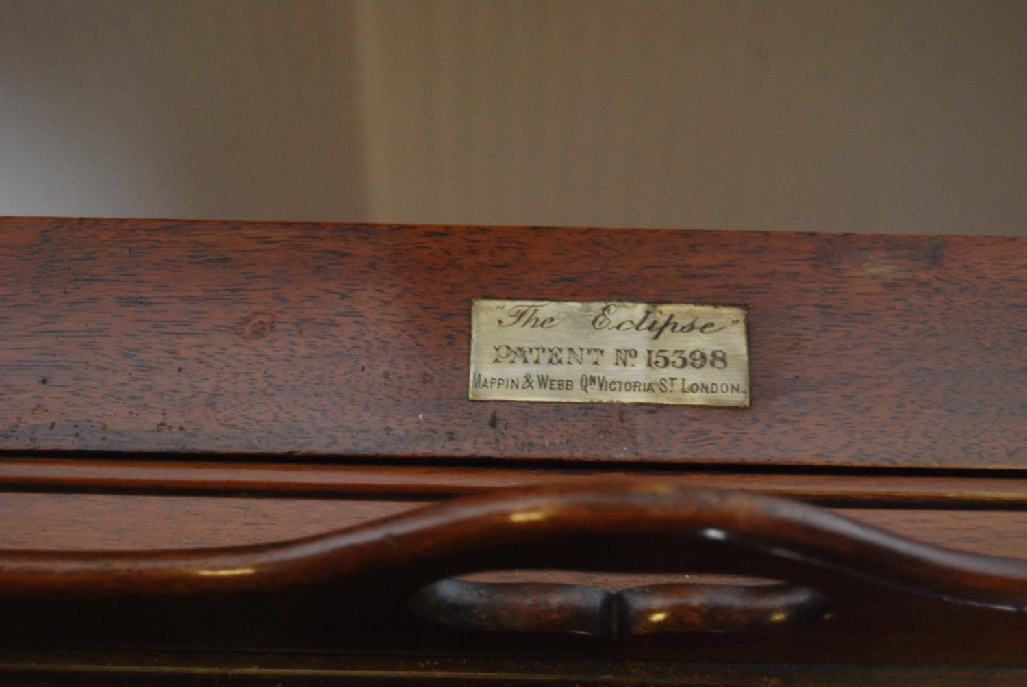 'The Eclipse' patent mahogany cocktail/drinks cabinet, patent no. 15398, the two-division top opening to reveal a pull-up drinks tray, with label for Mappin & Webb, Victoria Street, London, above a panelled frieze and fretwork under stretchers and a saucer-shaped centre, on turned supports with brass castors, 76cm high, 111cm wide and 61cm deep.