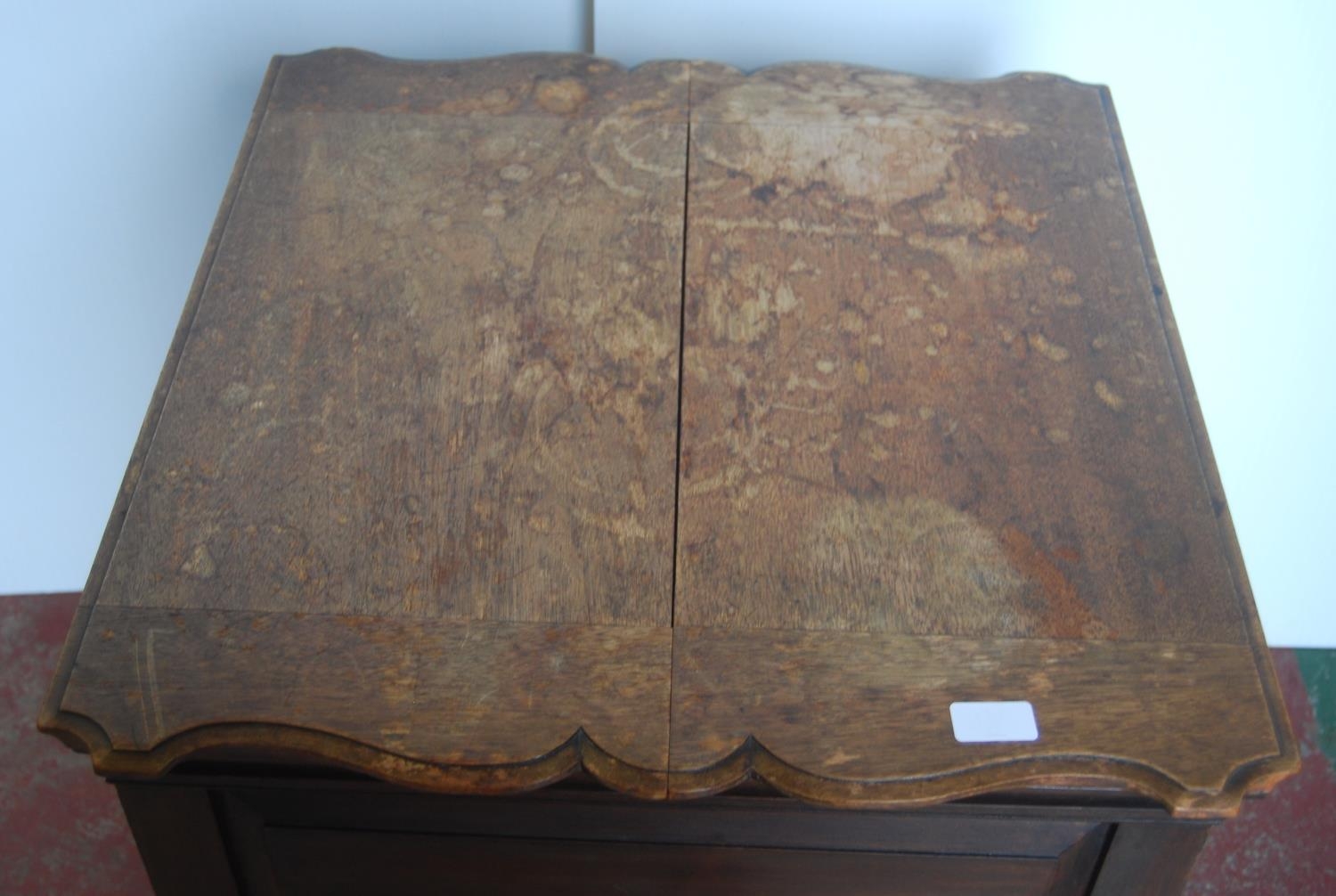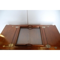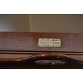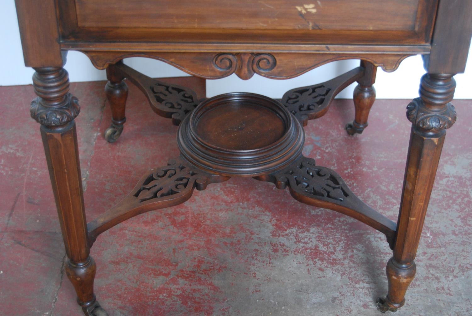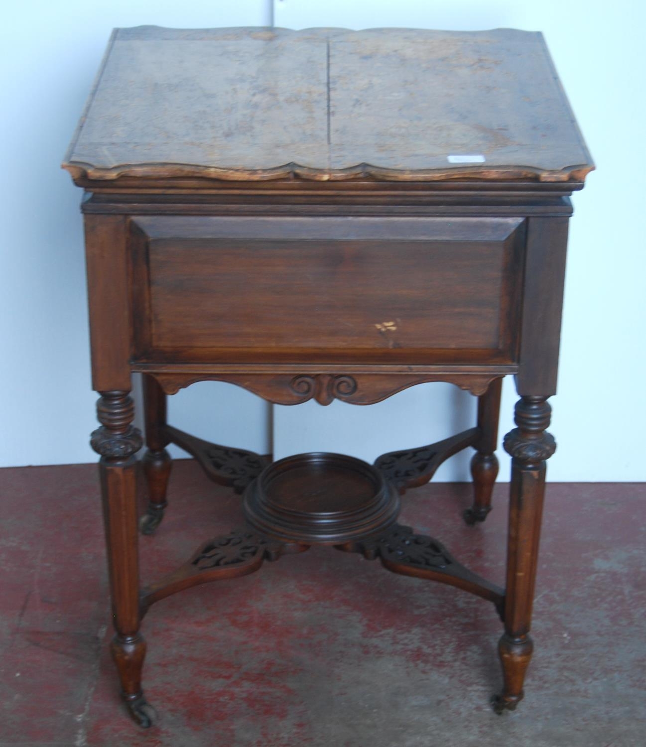 'The Eclipse' patent mahogany cocktail/drinks cabinet, patent no. 15398, the two-division top opening to reveal a pull-up drinks tray, with label for Mappin & Webb, Victoria Street, London, above a panelled frieze and fretwork under stretchers and a saucer-shaped centre, on turned supports with brass castors, 76cm high, 111cm wide and 61cm deep.