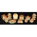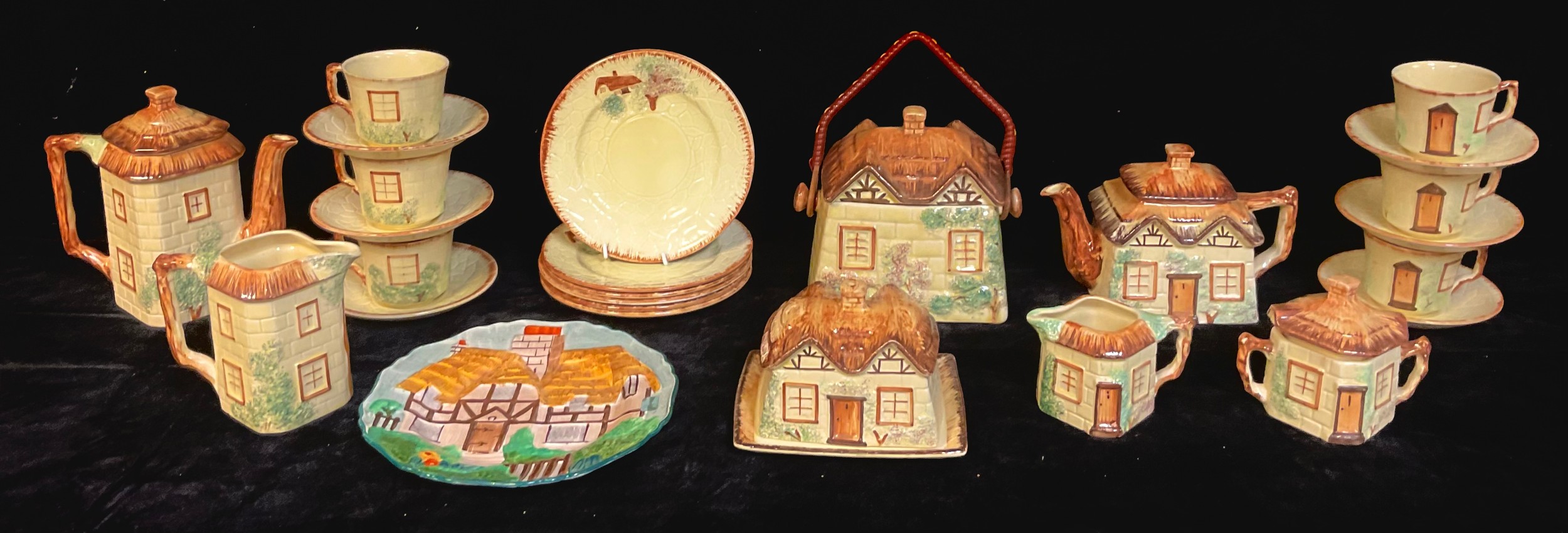 A Staffordshire English thatched cottage teapot, six cups, saucers and plates, biscuit barrel, butter dish, etc; qty