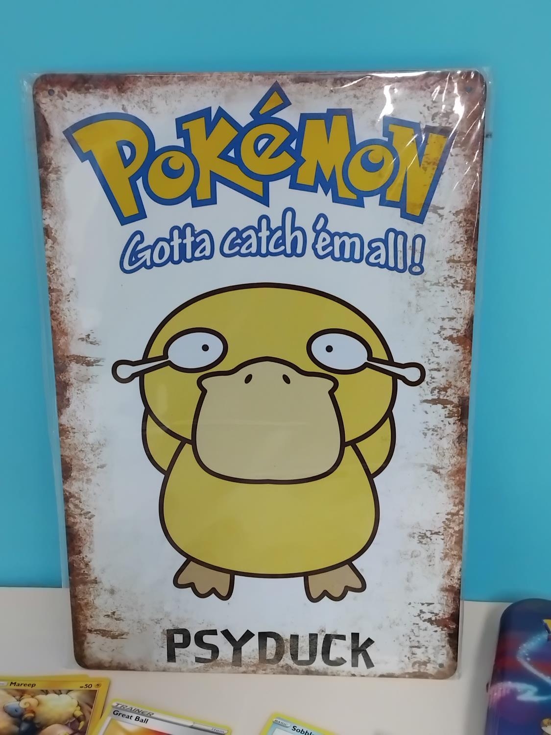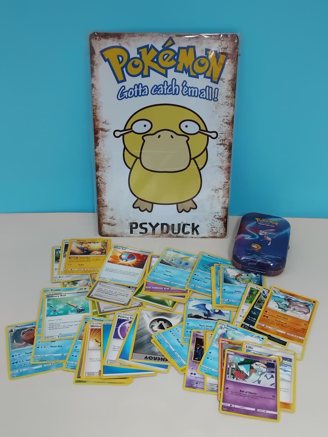 Quantity of Pokemon Trading Cards in Pokemon Tin plus Tin Sign. 30cm x 20cm.