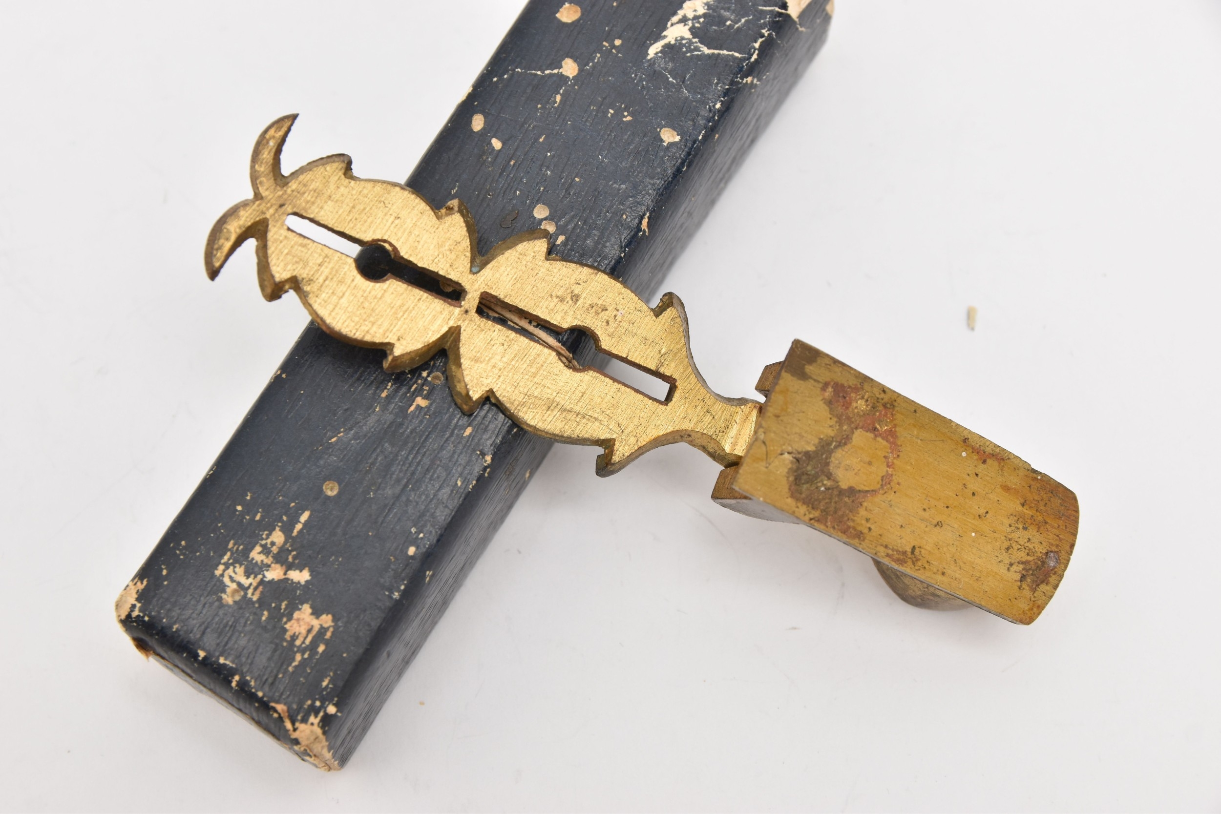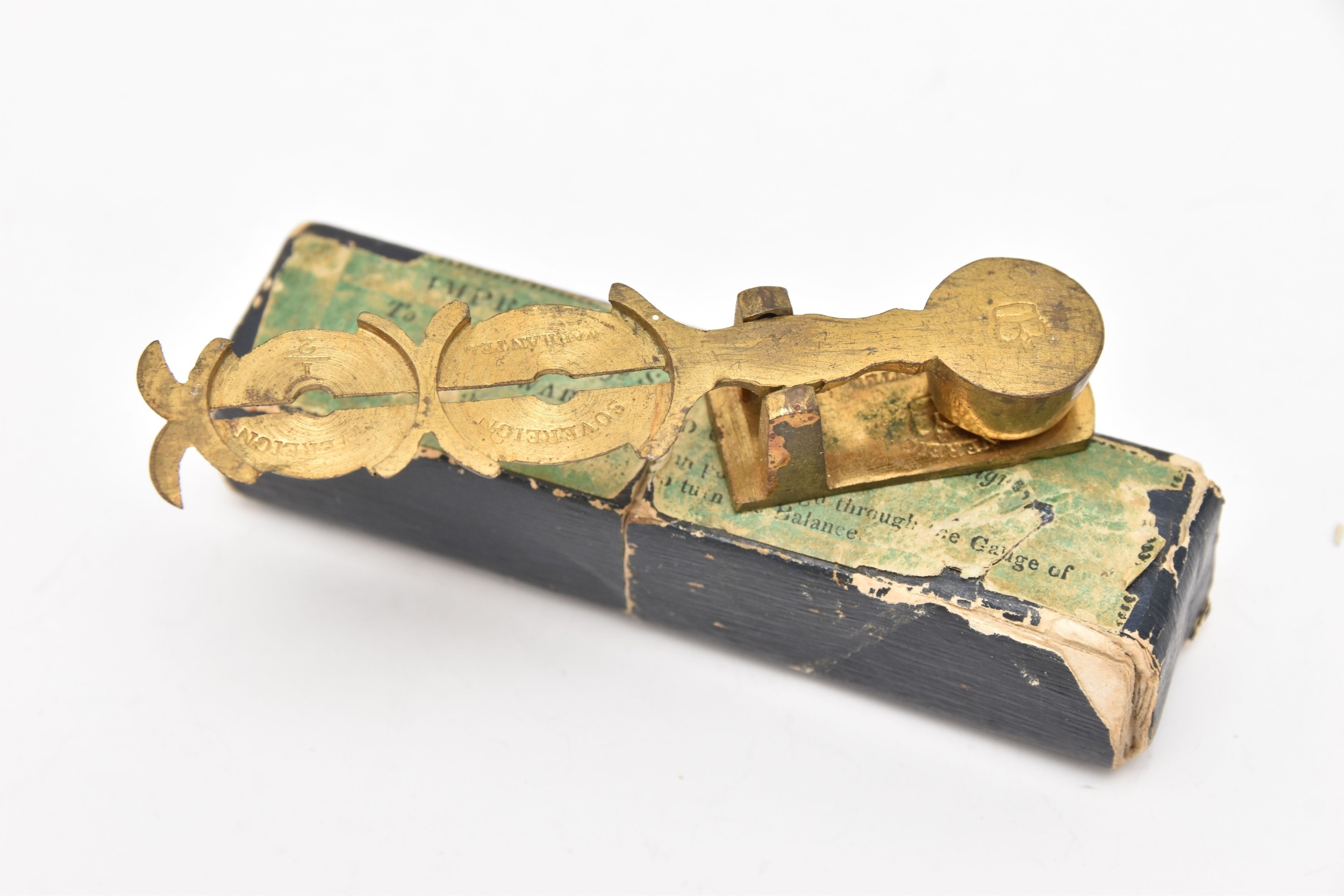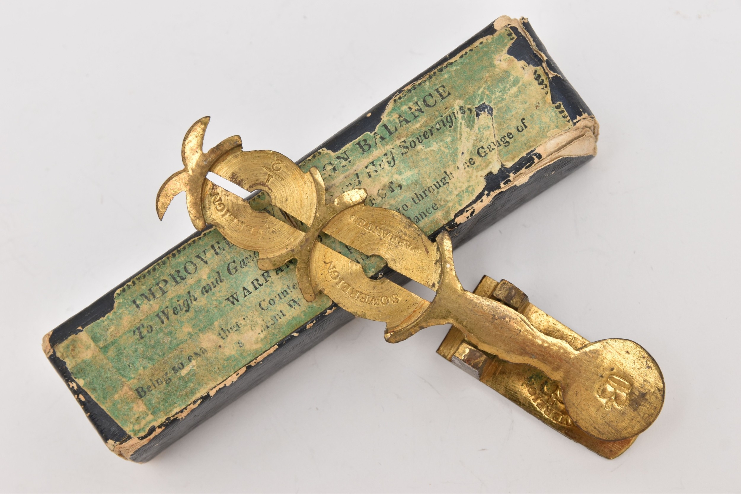 A CASED SOVEREIGN AND HALF SOVEREIGN SCALES, brass scales with blue outer box, wear to sticker