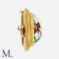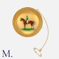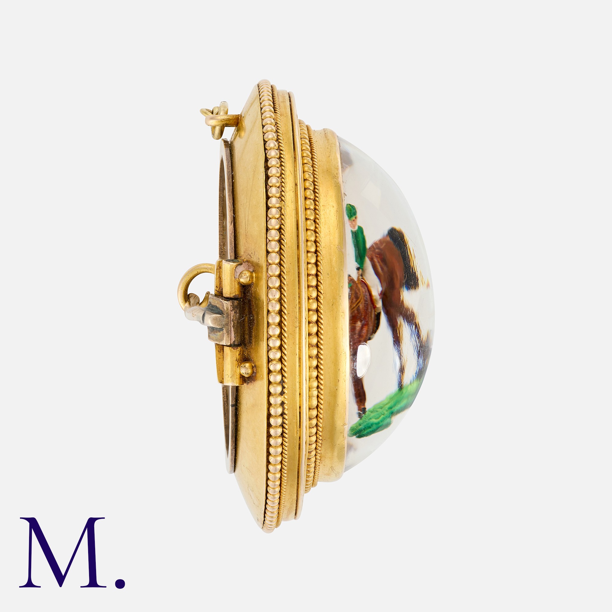 A Large Antique Essex Crystal Intaglio Brooch in yellow gold, set with a carved essex crystal intaglio reverse carved and painted, depicting a horse and jockey, in an intricate wirework and granular gold border, with a glazed locket compartment to the reverse. Unmarked, tests indicate 15 carat gold.