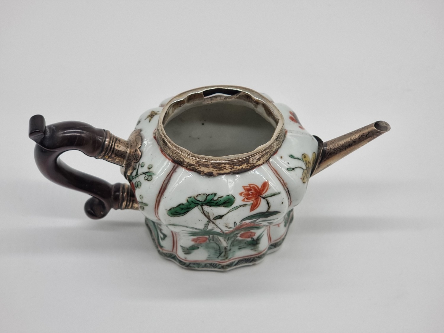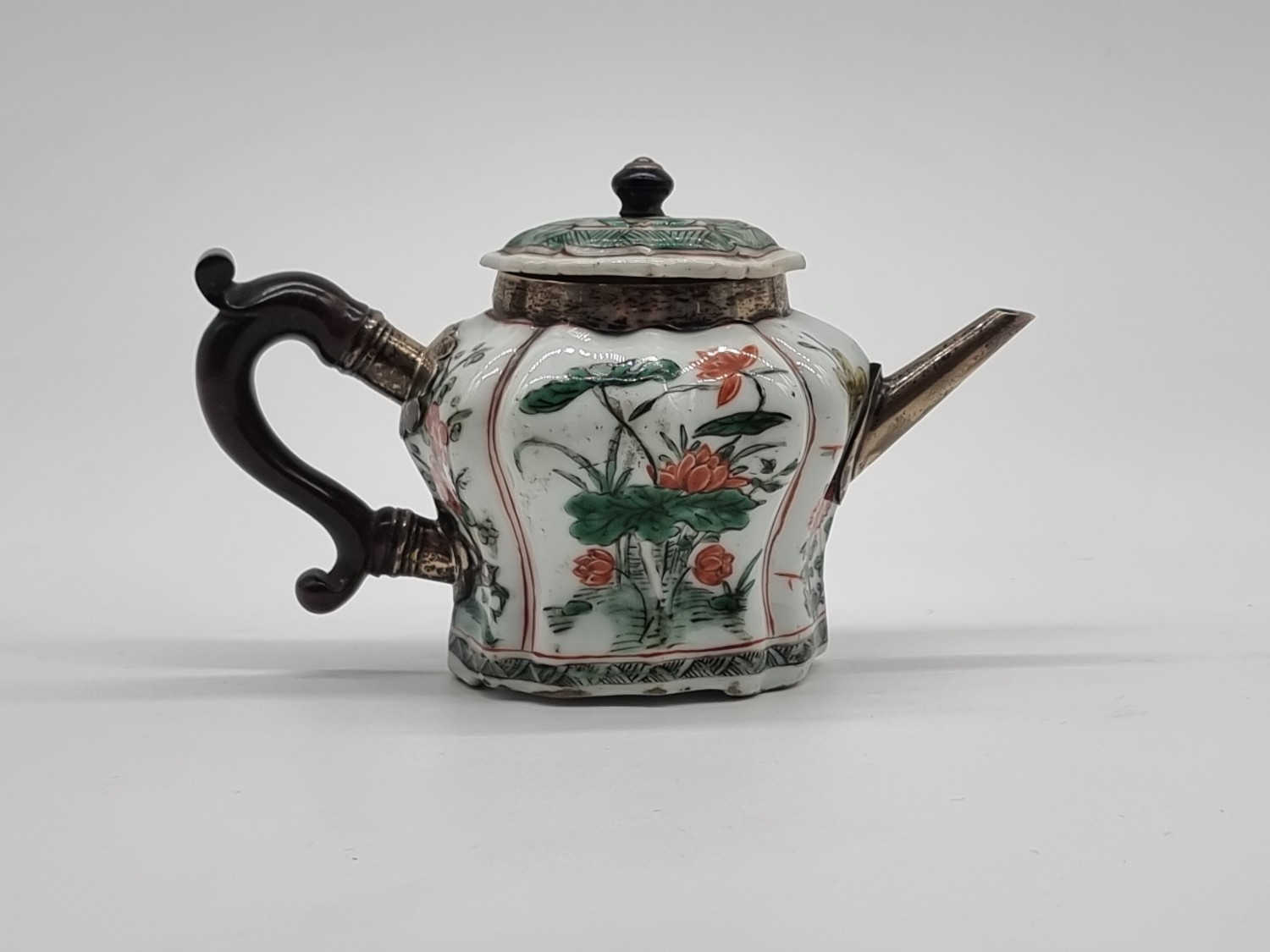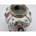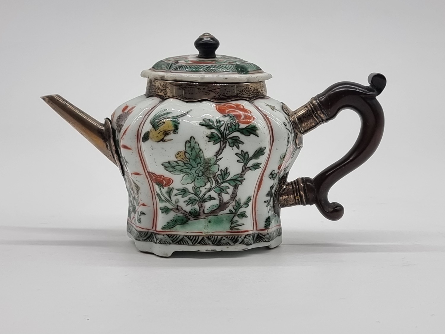 A Chinese famille vert and white metal mounted teapot and cover, probably Kangxi, 10.5cm high, (alterations).