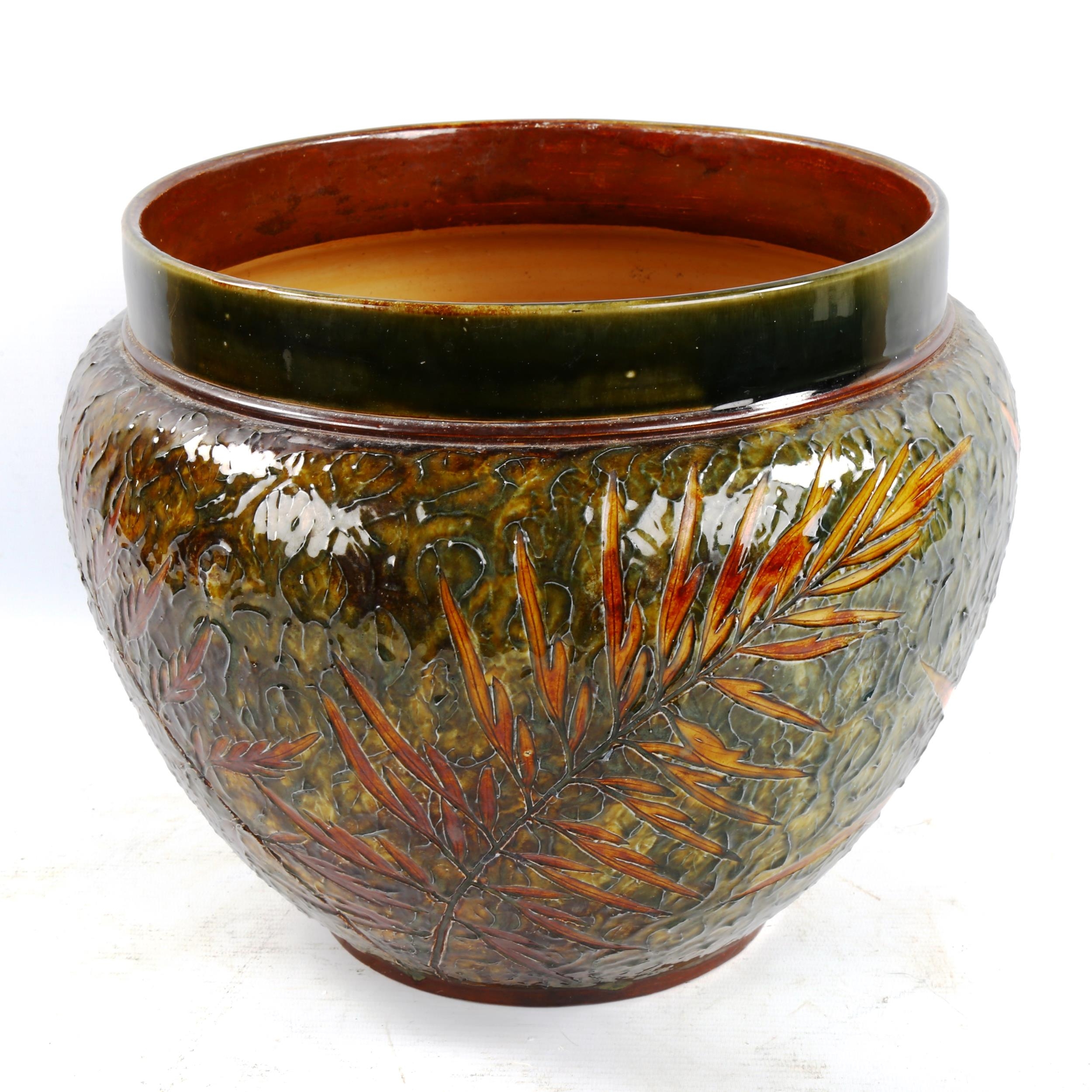 An arts and crafts era Doulton Lambeth jardiniere, "Autumn Leaves" decoration, makers marks to base, height 26cm