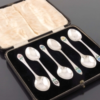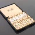Bernard Cuzner for Liberty and Co. a set of six Arts and Crafts silver coffee spoons, Birmingham 1933, planished and engraved with stylised wheat or fuchsia motifs to the terminals, in original Liberty box, 10cm long, 1.69zt (6)