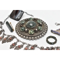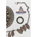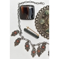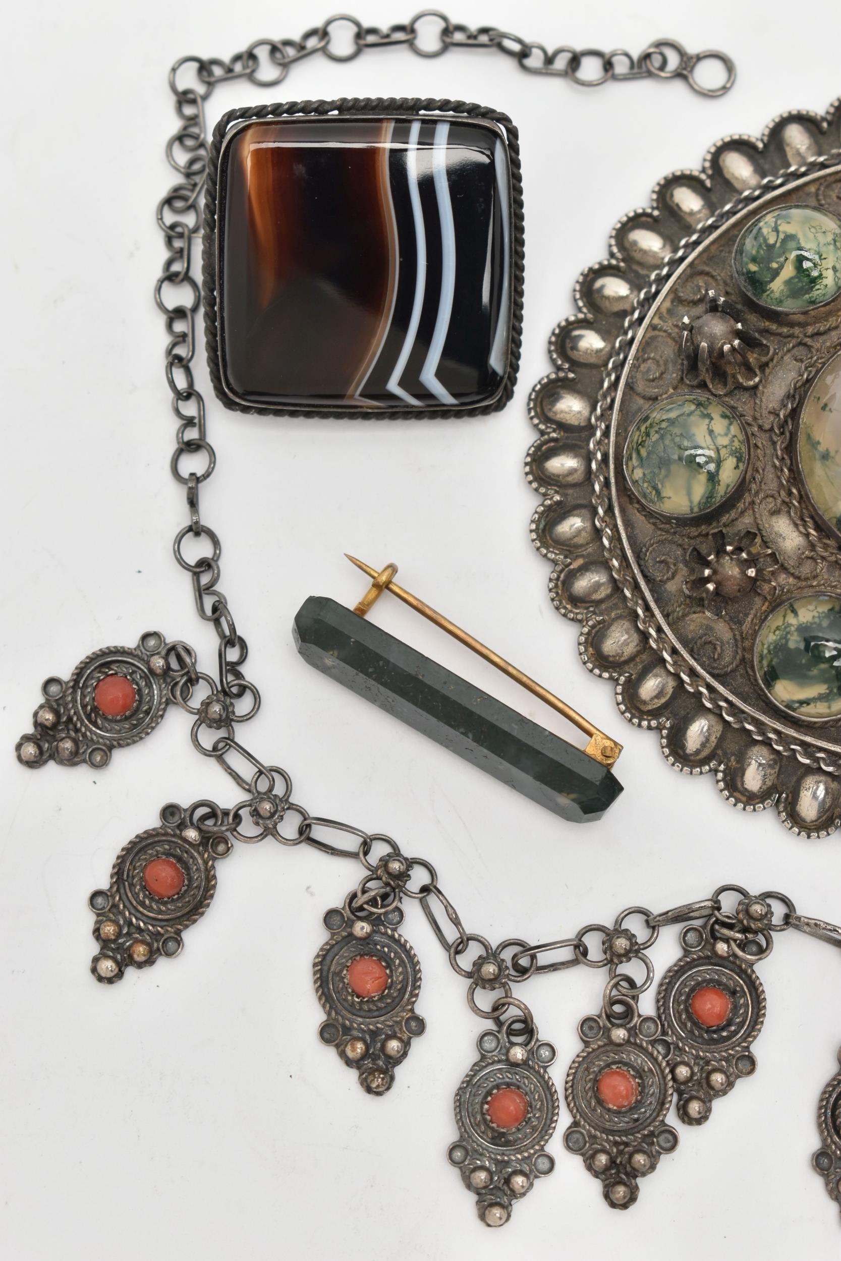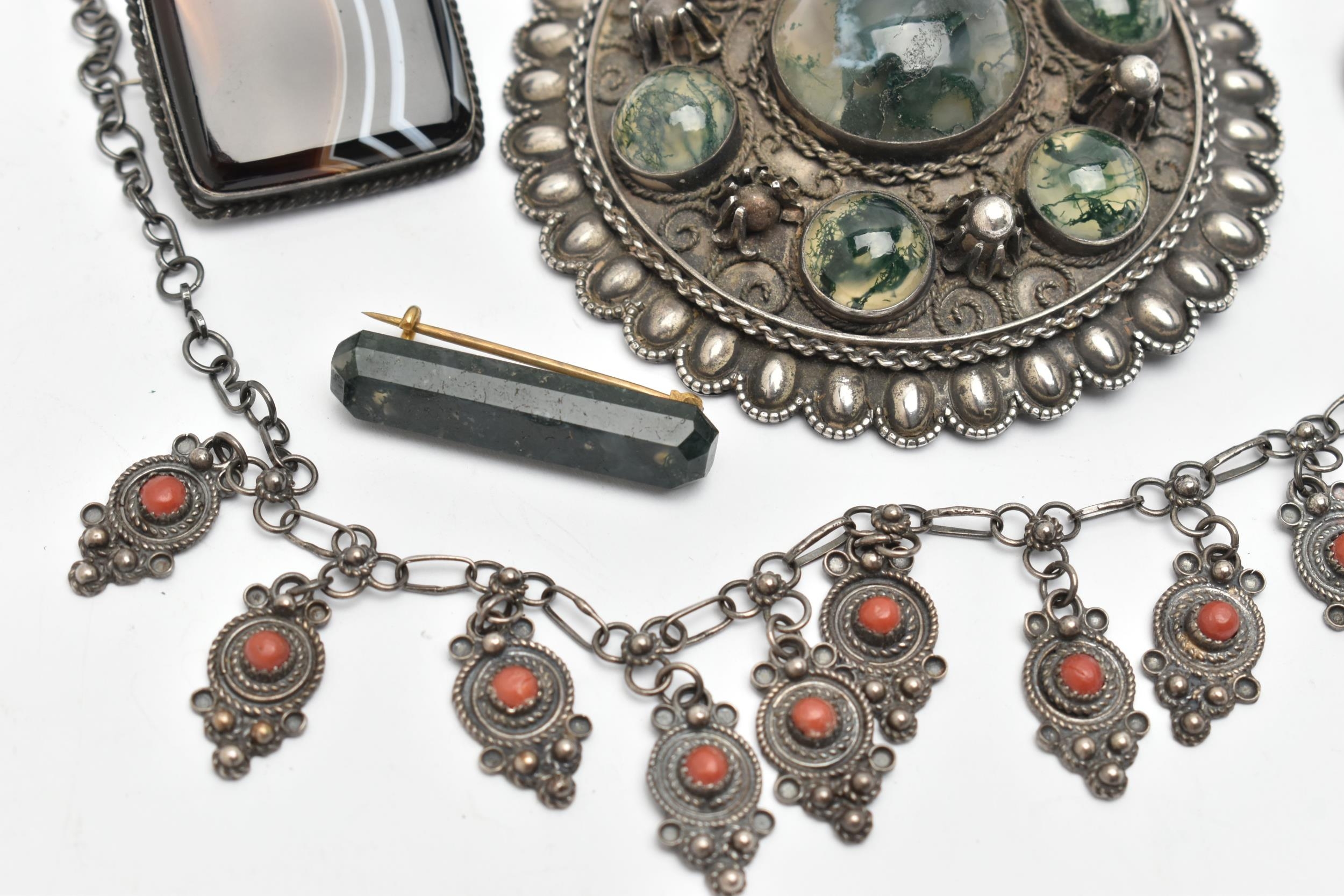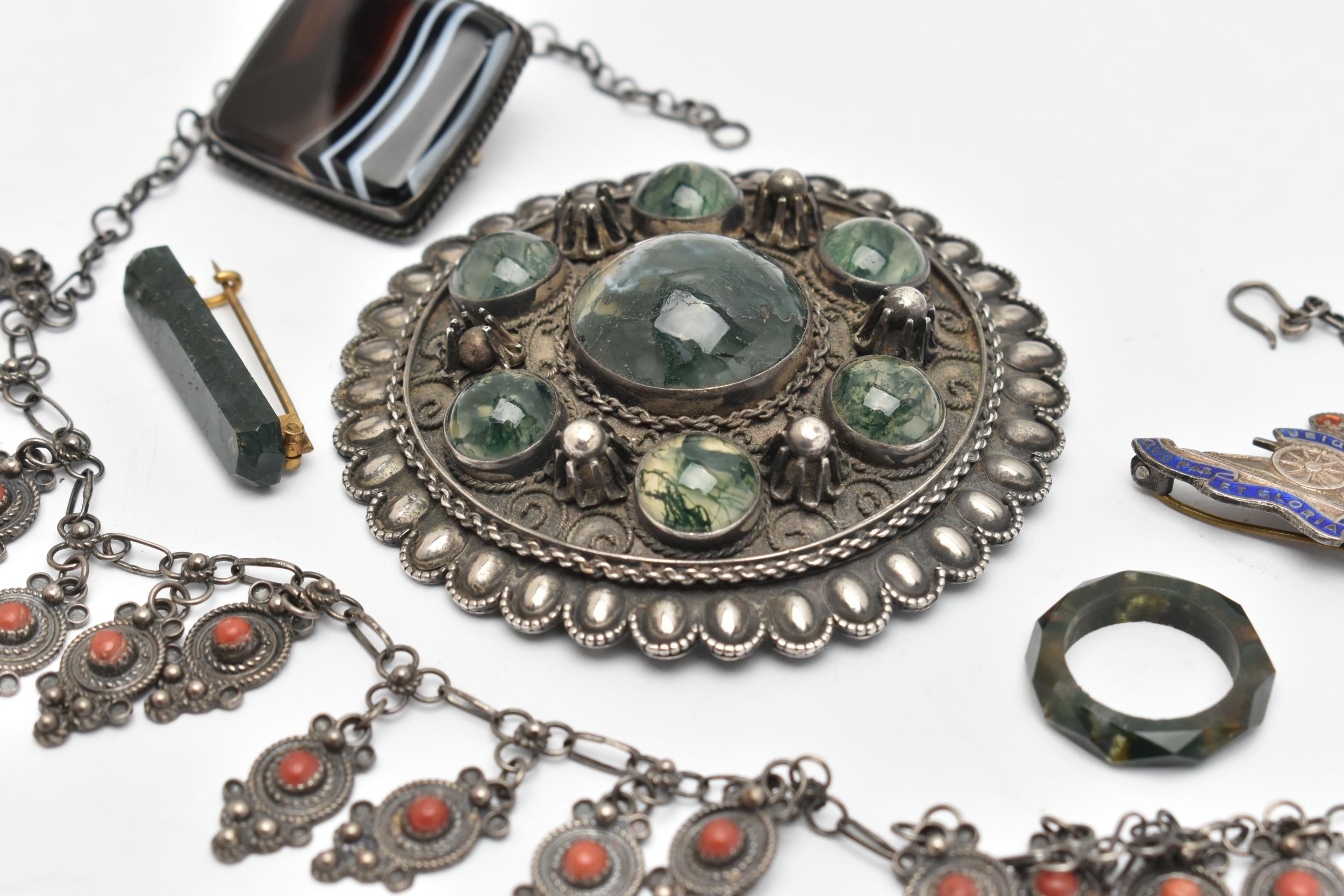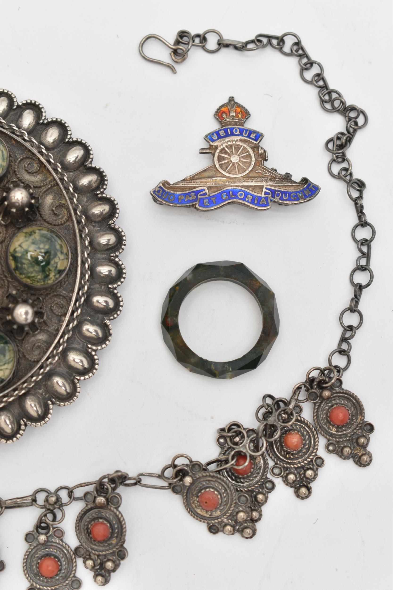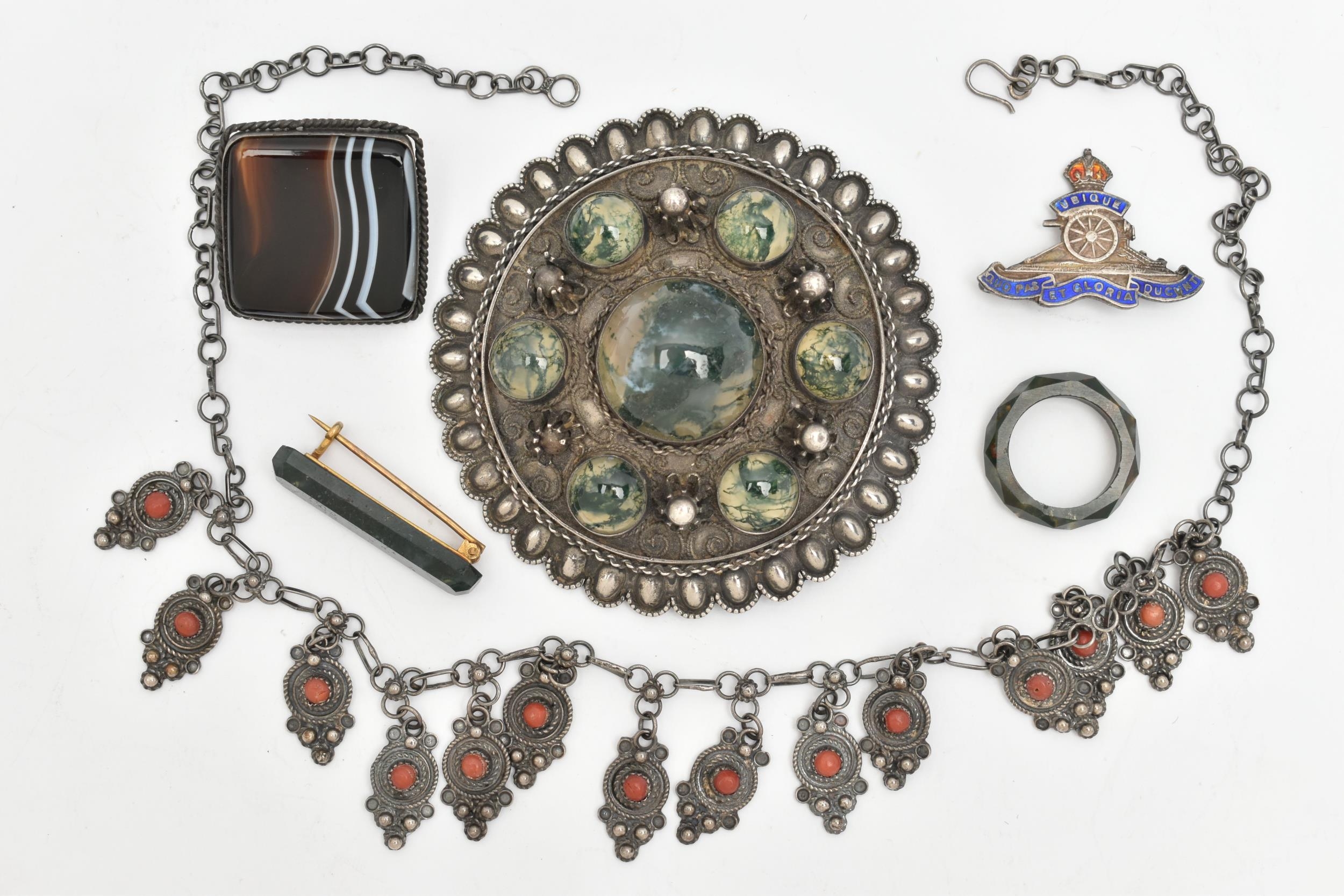 SIX ITEMS OF JEWELLERY, to include a carved and faceted moss agate ring, a polished moss agate brooch, a banded agate brooch of a square form, collet set into a white metal mount with brooch pin, a large white metal buckle set with moss agate cabochons, unmarked, a white metal necklace and a white metal and enamel Royal Artillery brooch