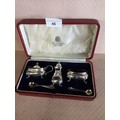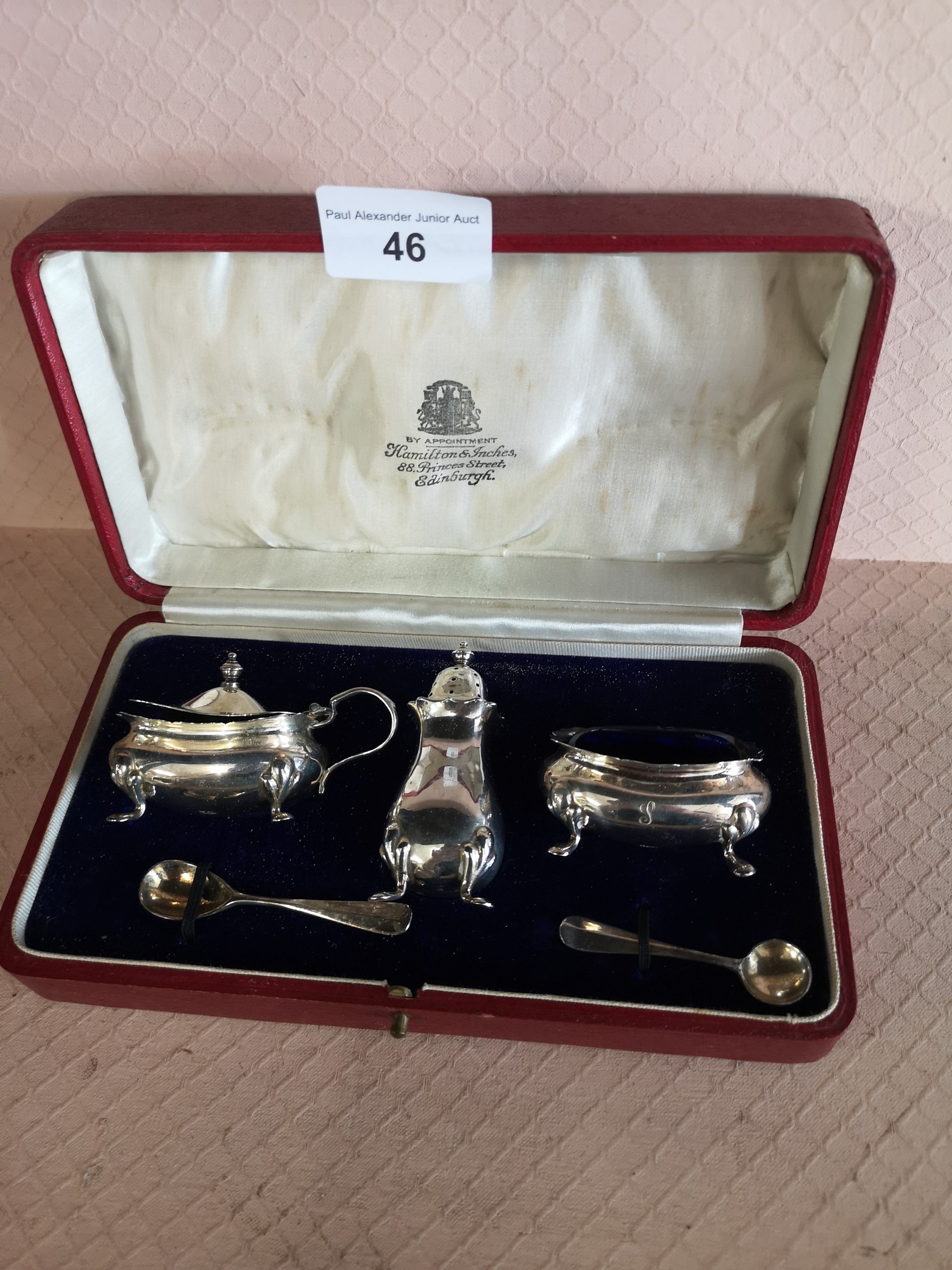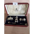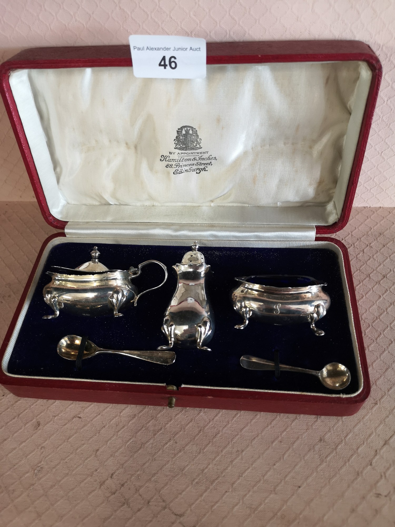 Silver Hall marked Edinburgh cruet set makers Hamilton and inches in original box.