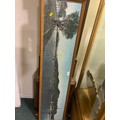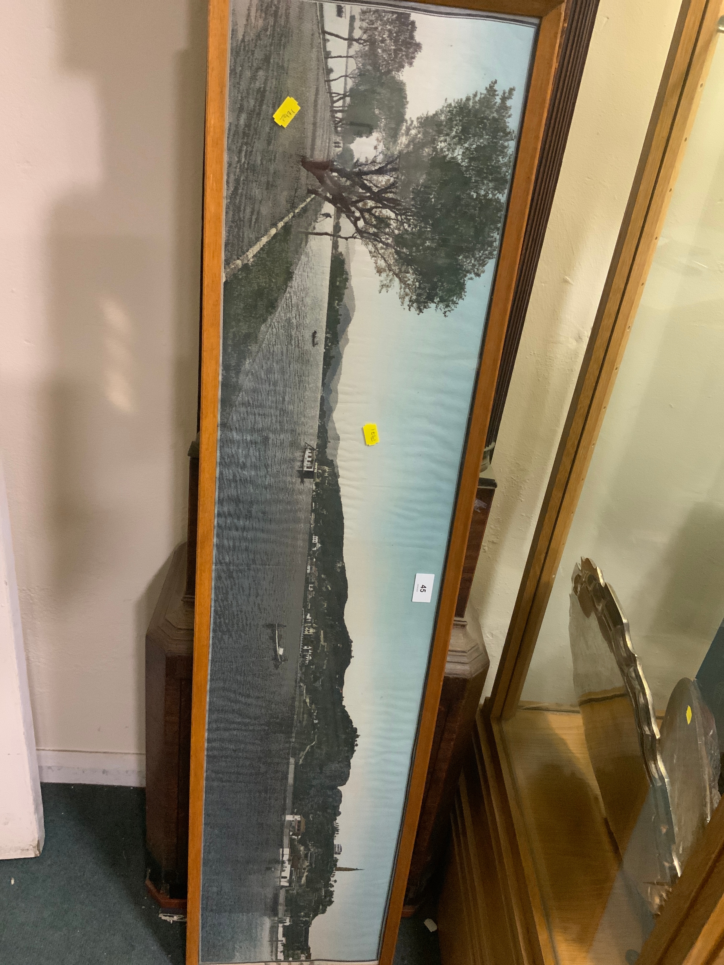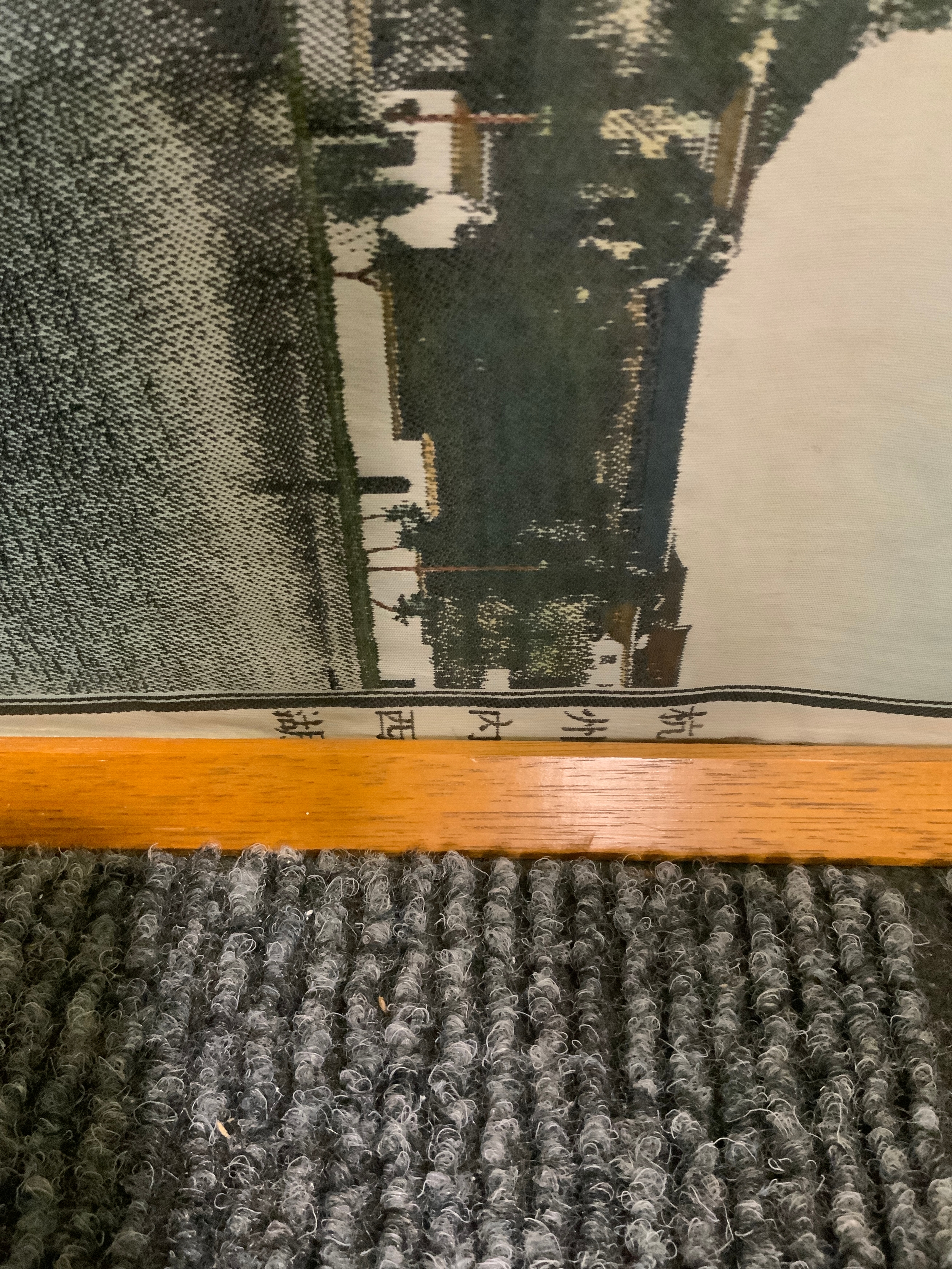A long silkwork depicting a lake scene possibly Japanese with characters to the end, 26 x 122 cm