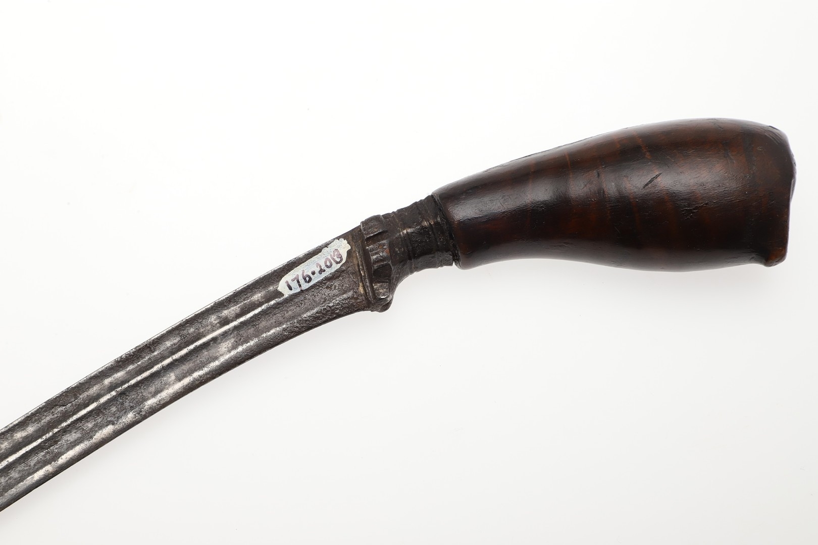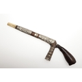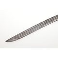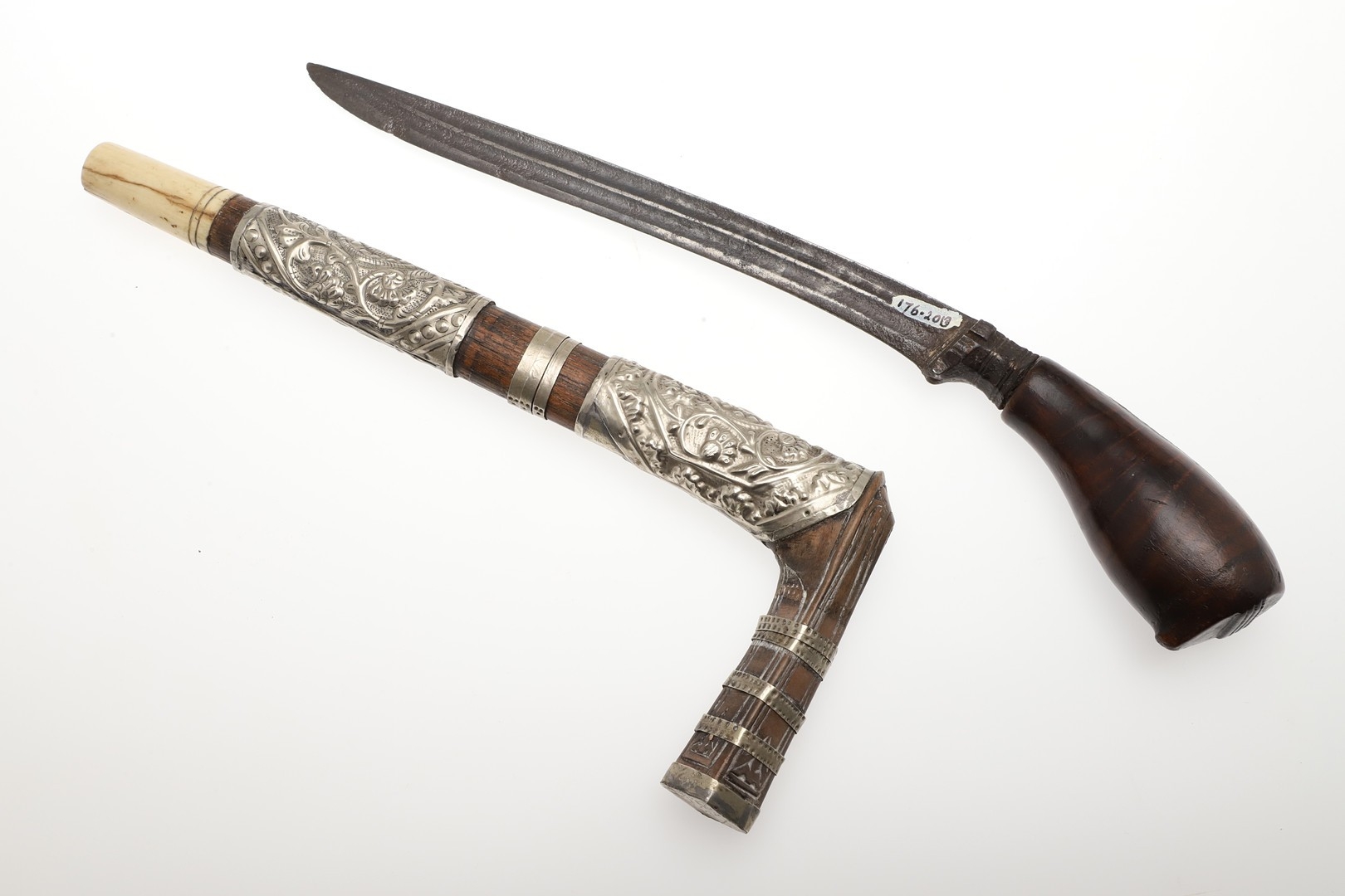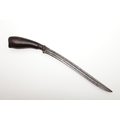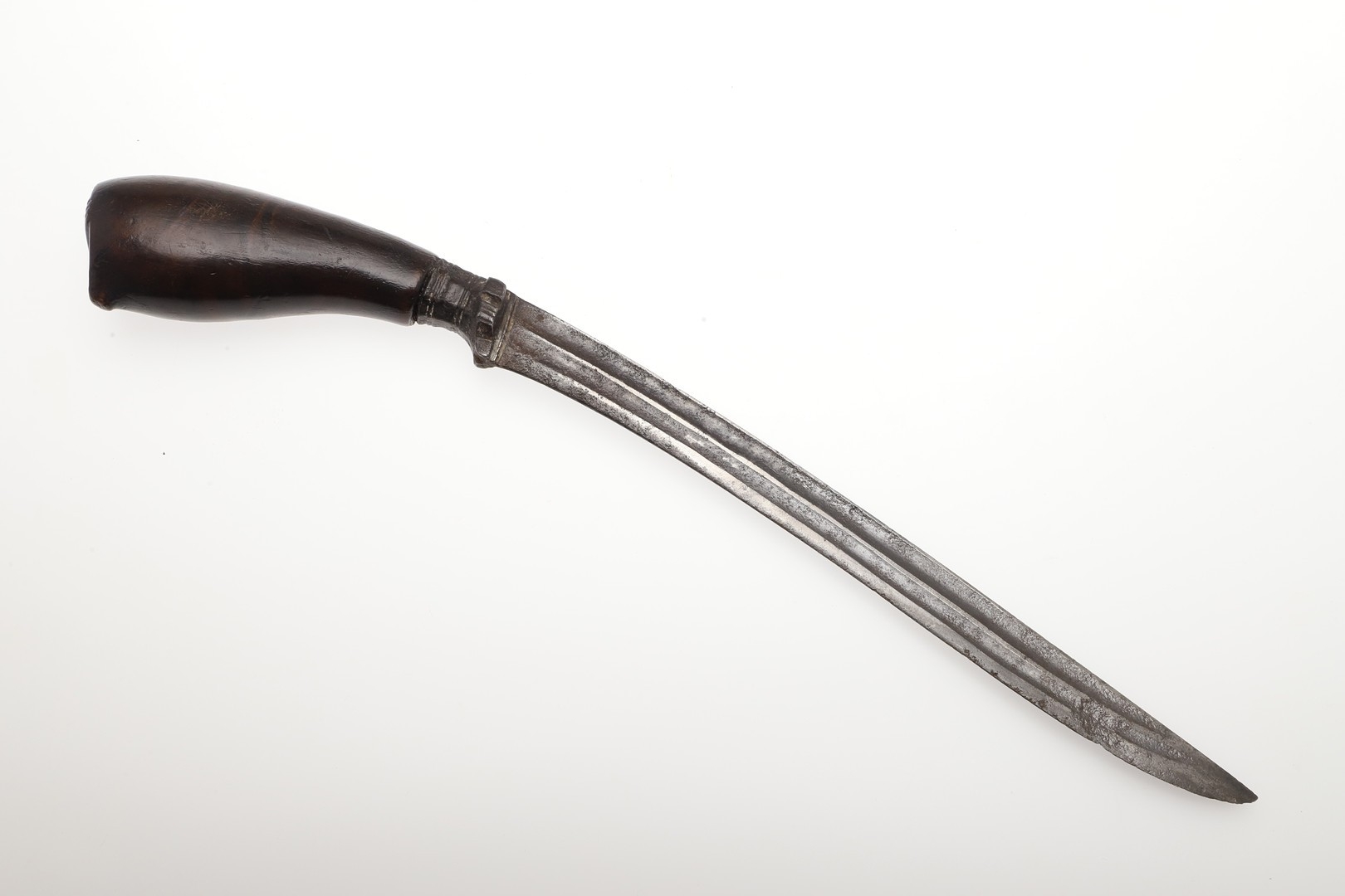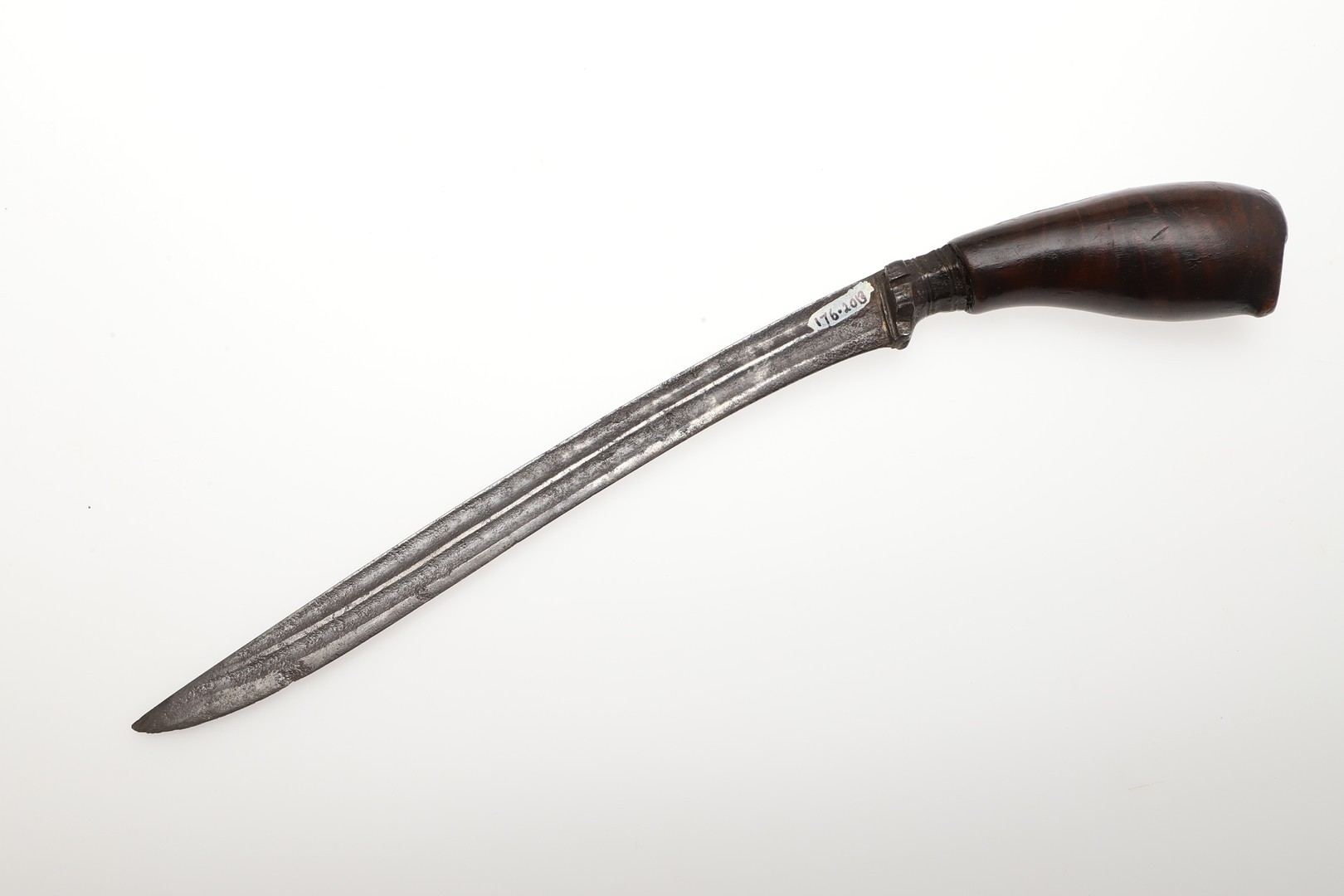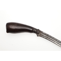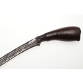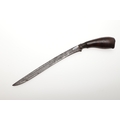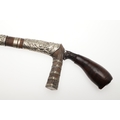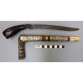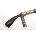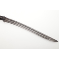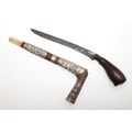 A SUMATRAN TUMBOK LADA DAGGER AND SCABBARD. Having a 20 cm curved blade with serpentine cutting edge and two long fullers. On a rounded wooden hilt with carved end. The scabbard with a decoratively carved spur at right angles, further decorated with four bands and an end plate of silver. The body of the scabbard similarly decorated and with bone end piece. 33 cm.