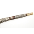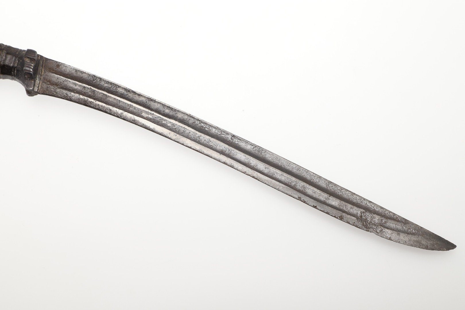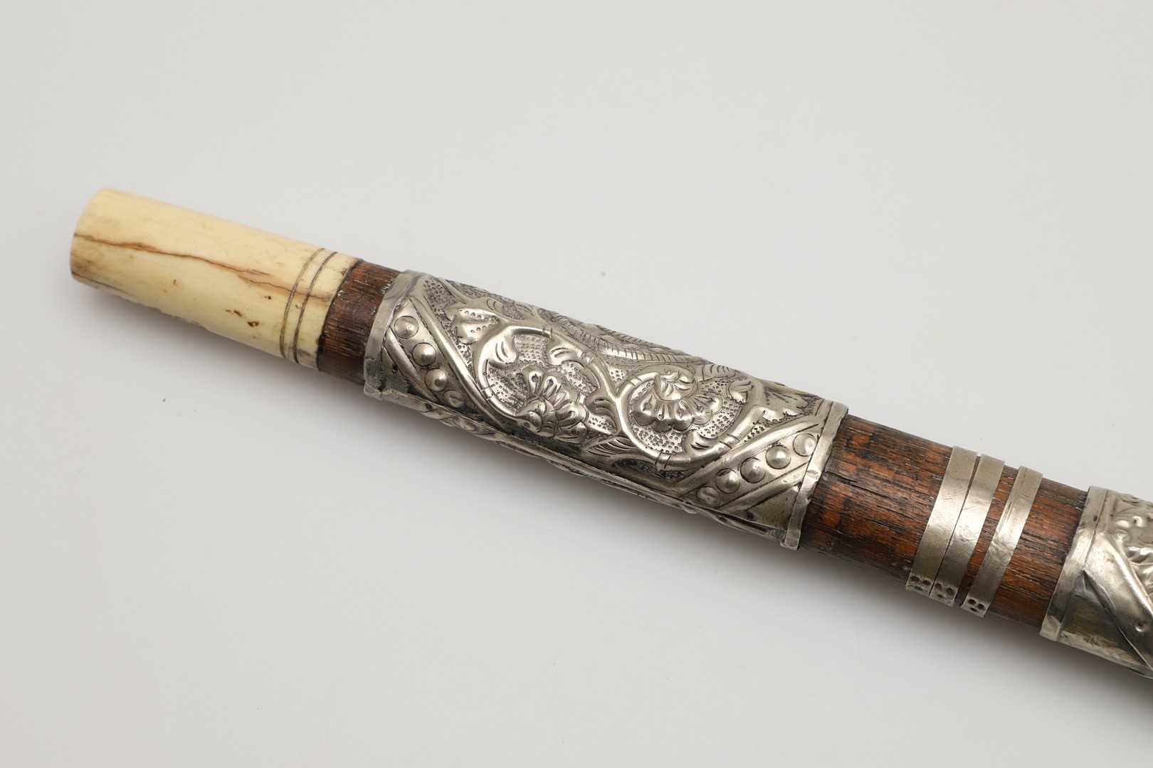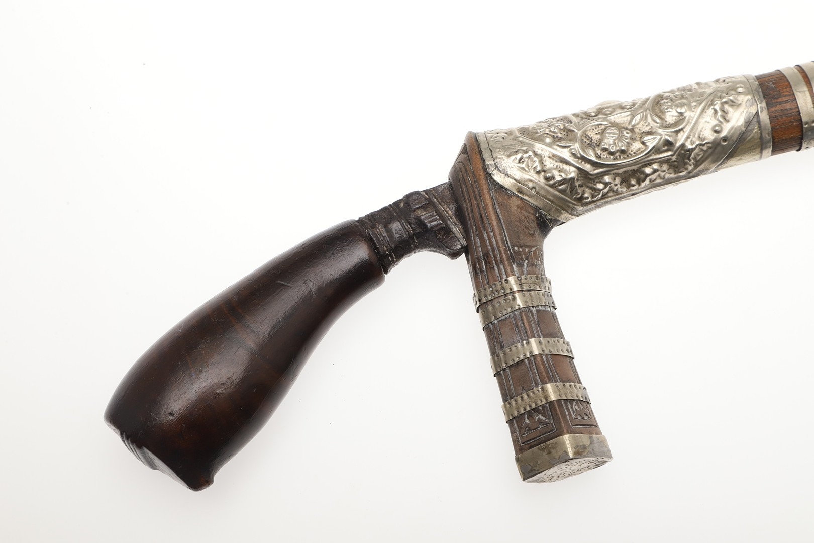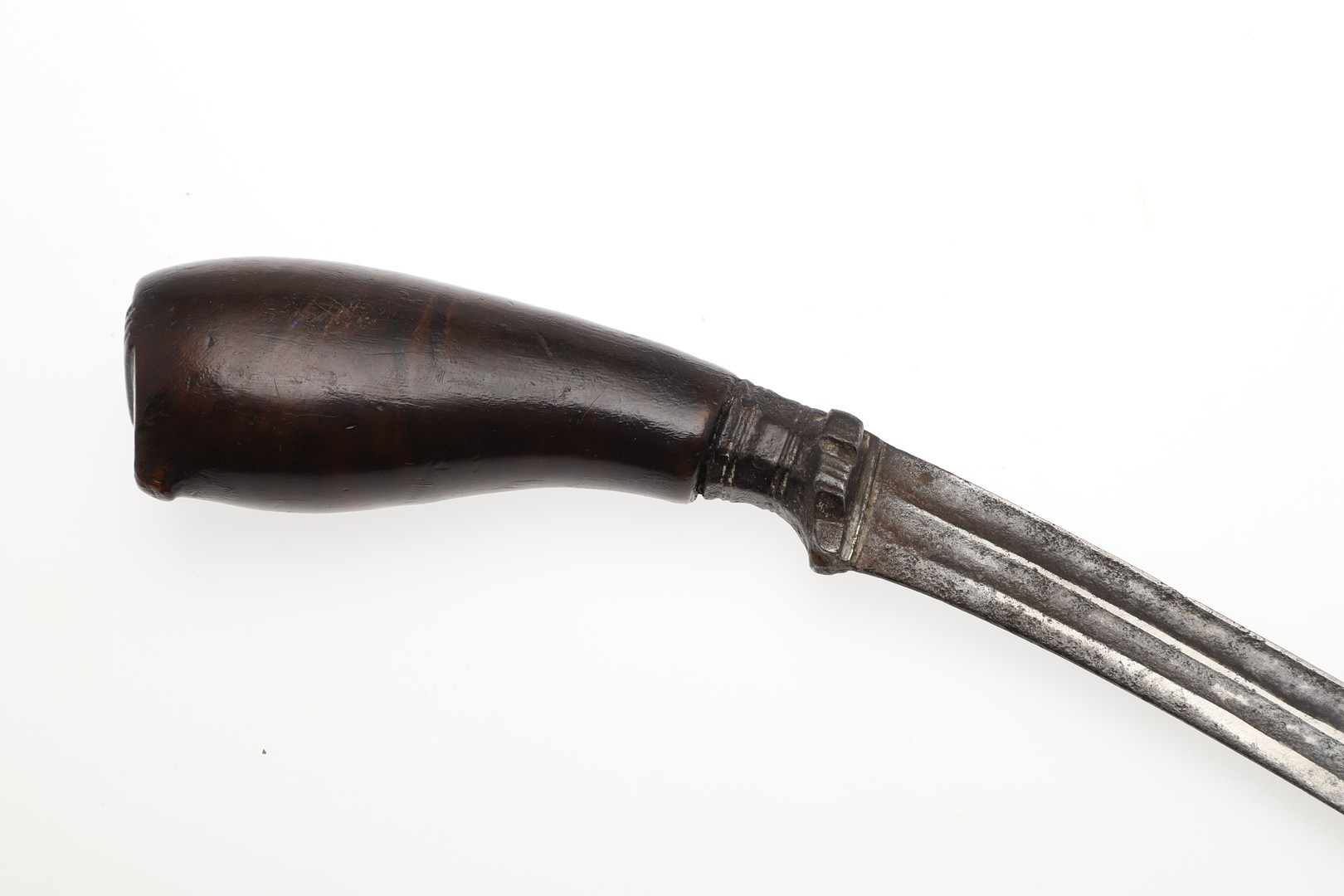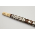 A SUMATRAN TUMBOK LADA DAGGER AND SCABBARD. Having a 20 cm curved blade with serpentine cutting edge and two long fullers. On a rounded wooden hilt with carved end. The scabbard with a decoratively carved spur at right angles, further decorated with four bands and an end plate of silver. The body of the scabbard similarly decorated and with bone end piece. 33 cm.