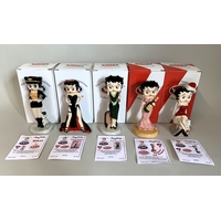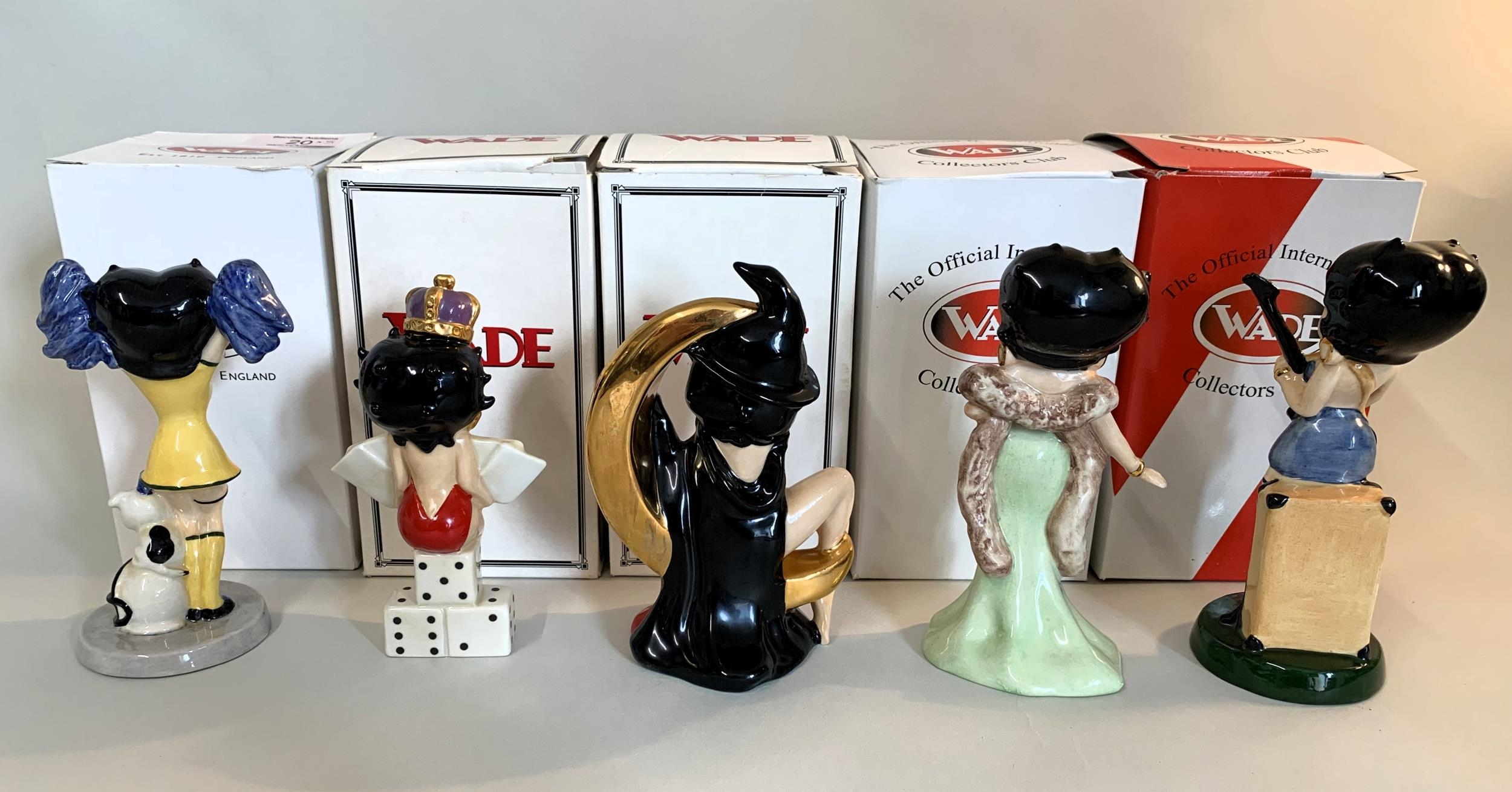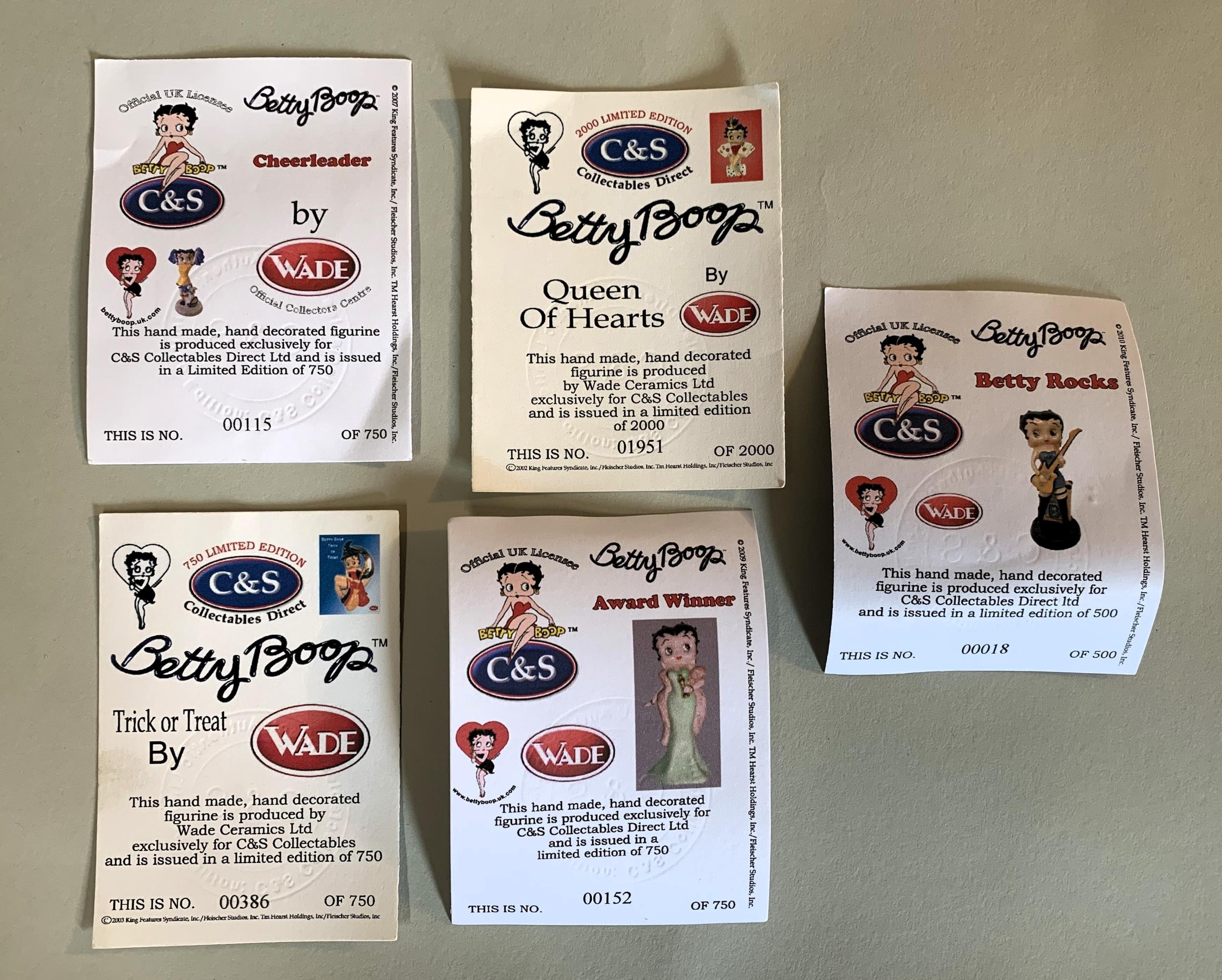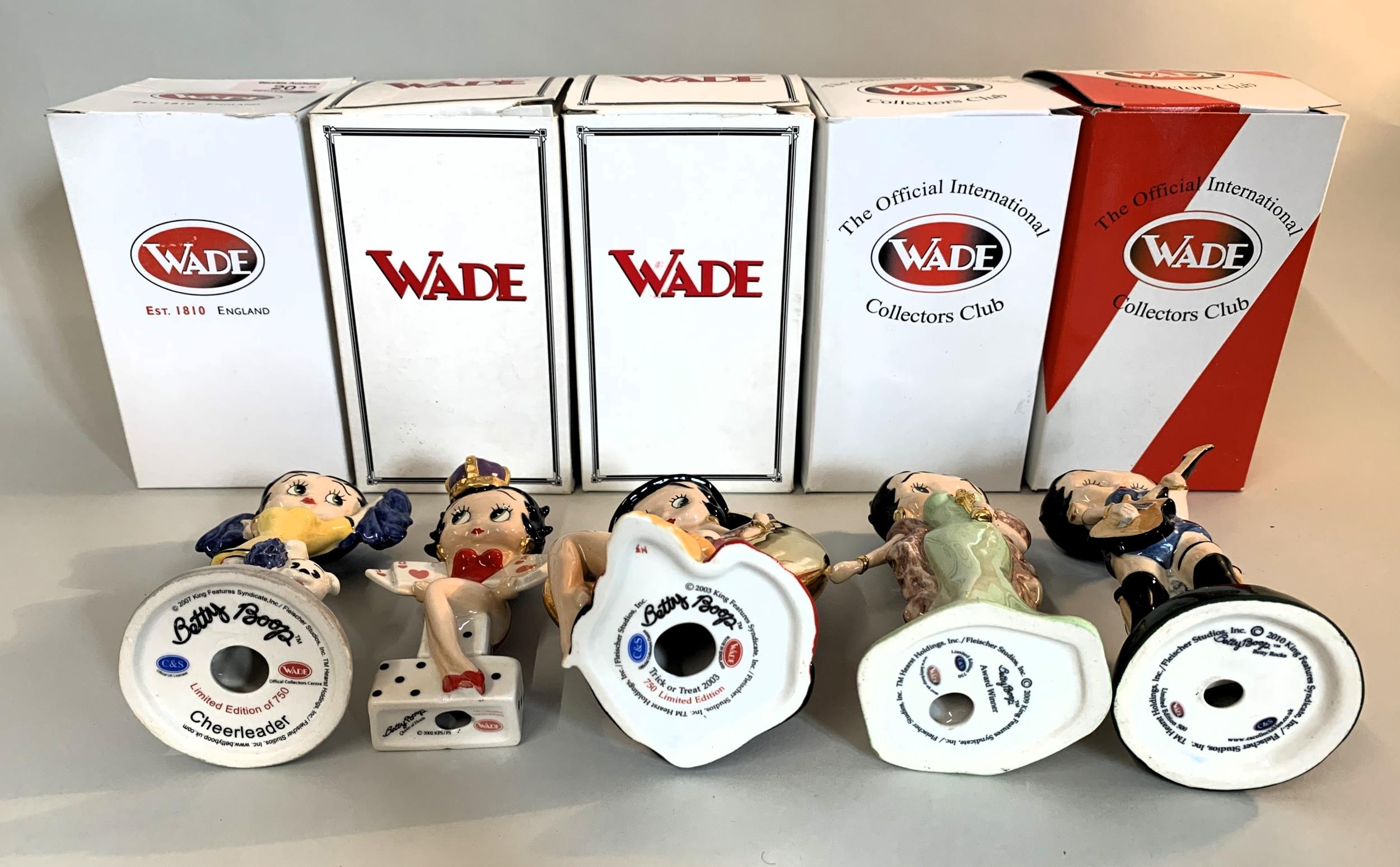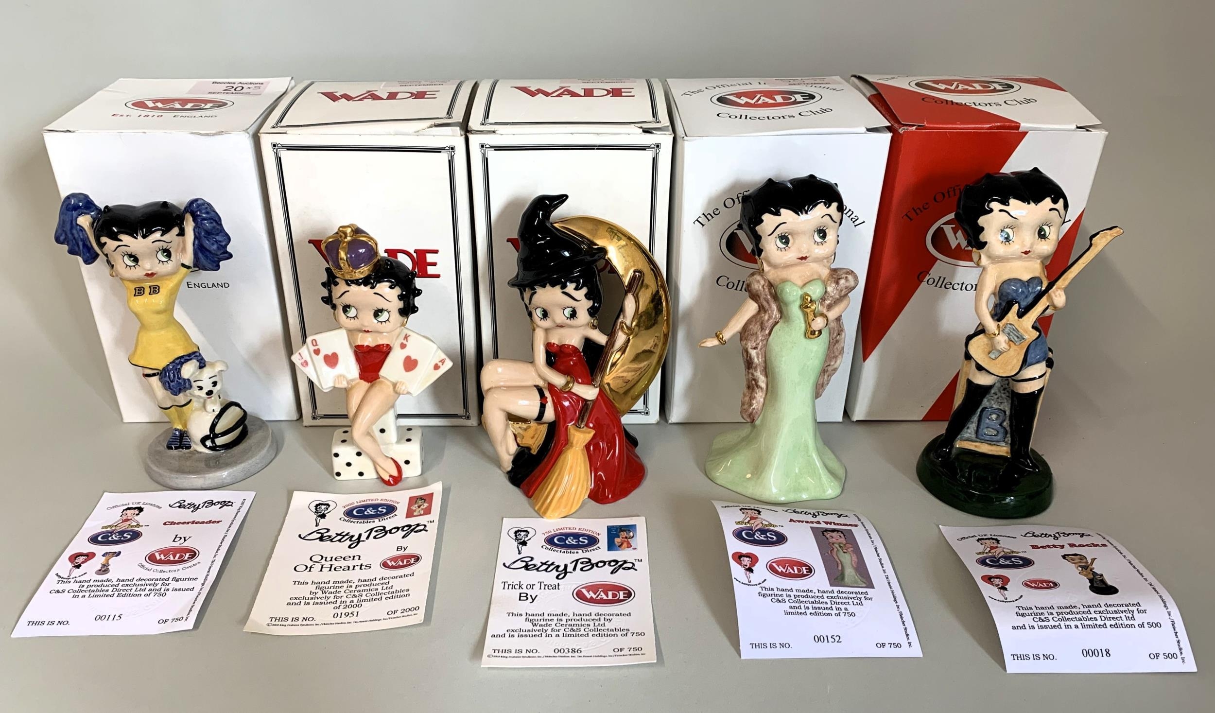 Five boxed Wade Betty Boop figurines with certificates, Betty Rocks 18/500, Award Winner 152/750, Cheerleader 115/750, Queen of Hearts 1951/2000 and Trick or Treat 386/750 (boxes with signs of storage wear)