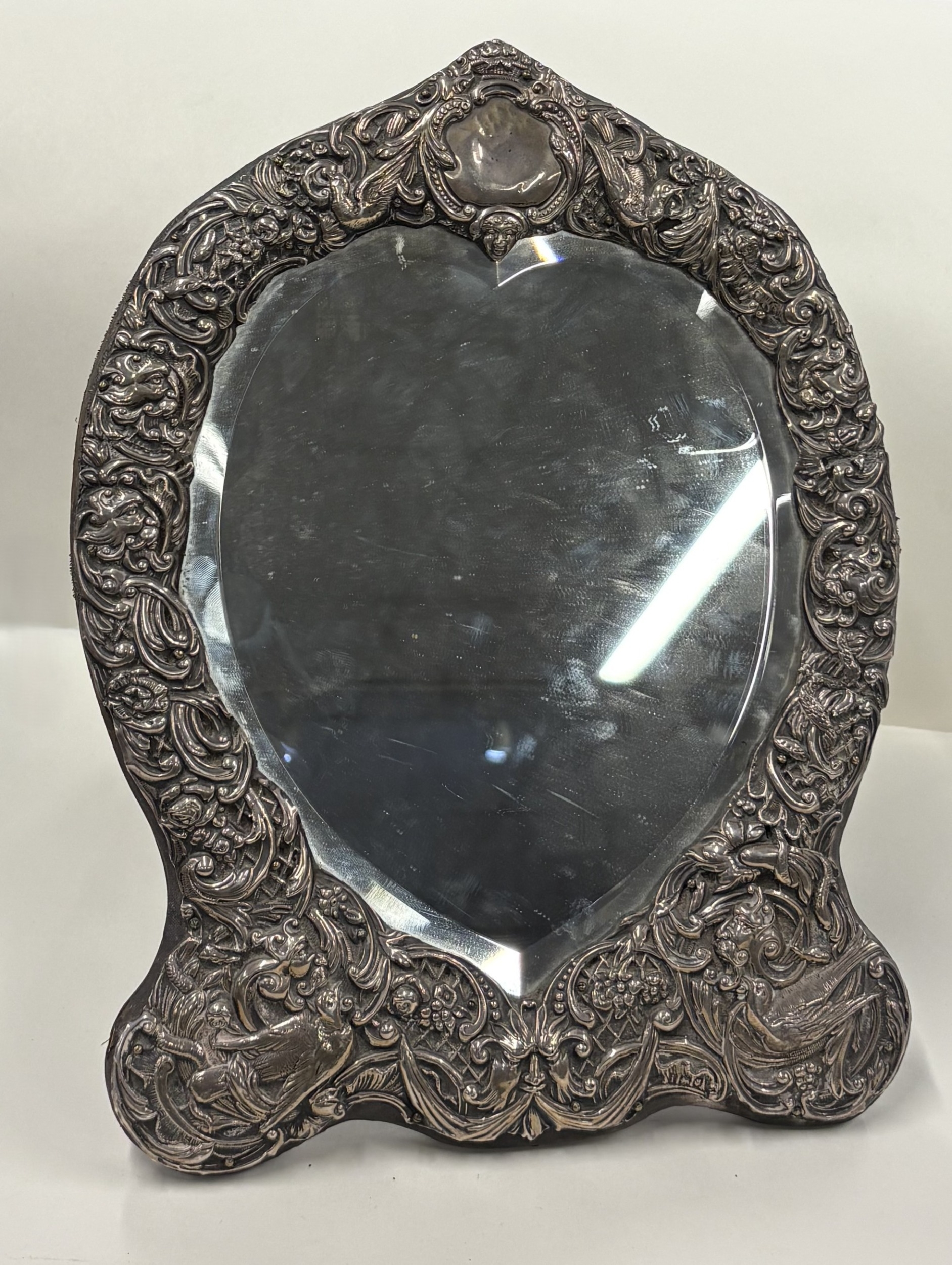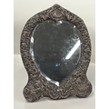 A large heart-shaped silver-mounted mirror profusely decorated with birds and scrolls, with vacant cartouche to easel back. London 1904. By WC. Est. £100 - £150.