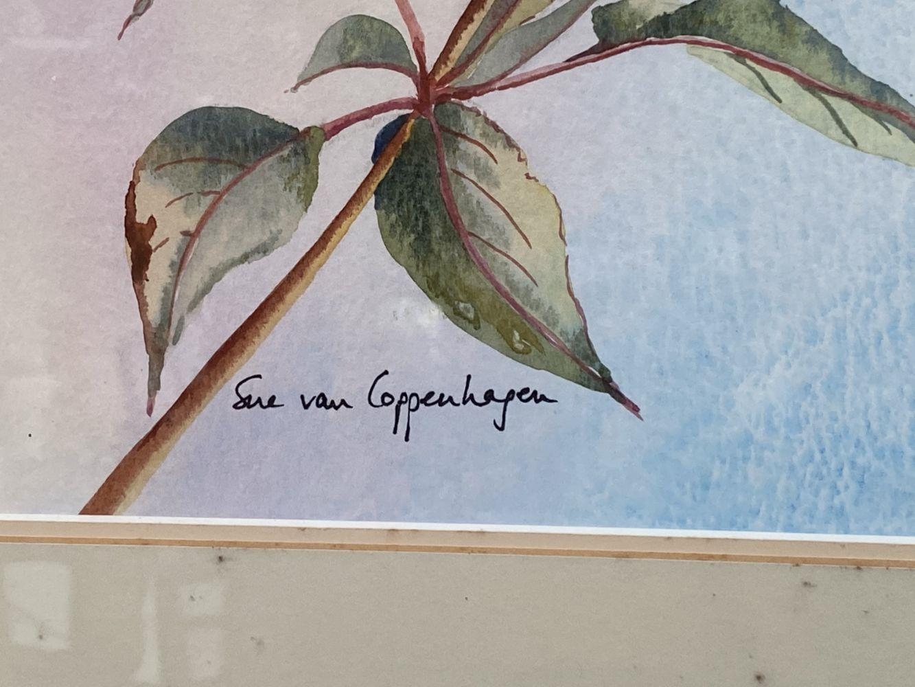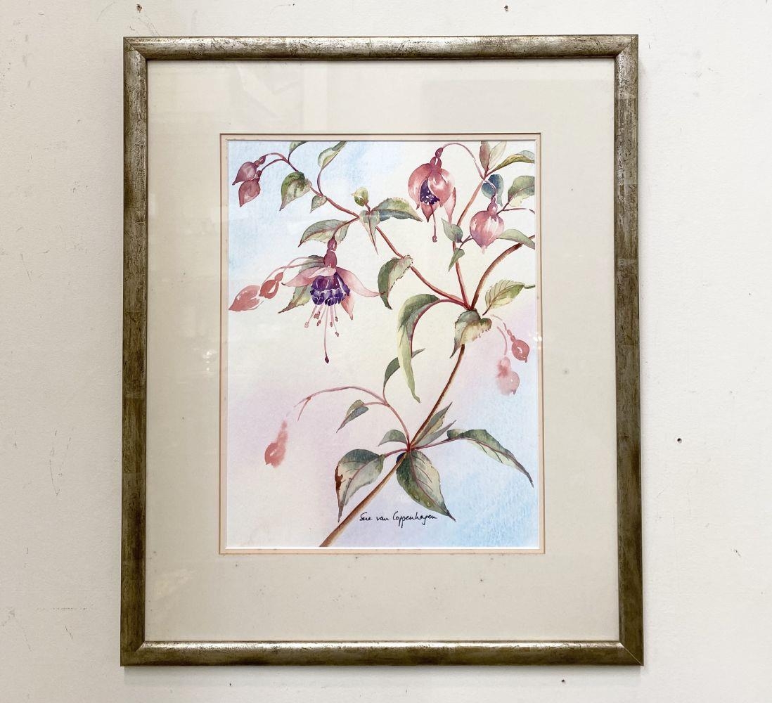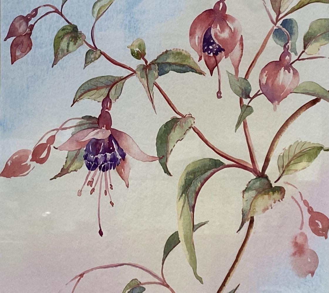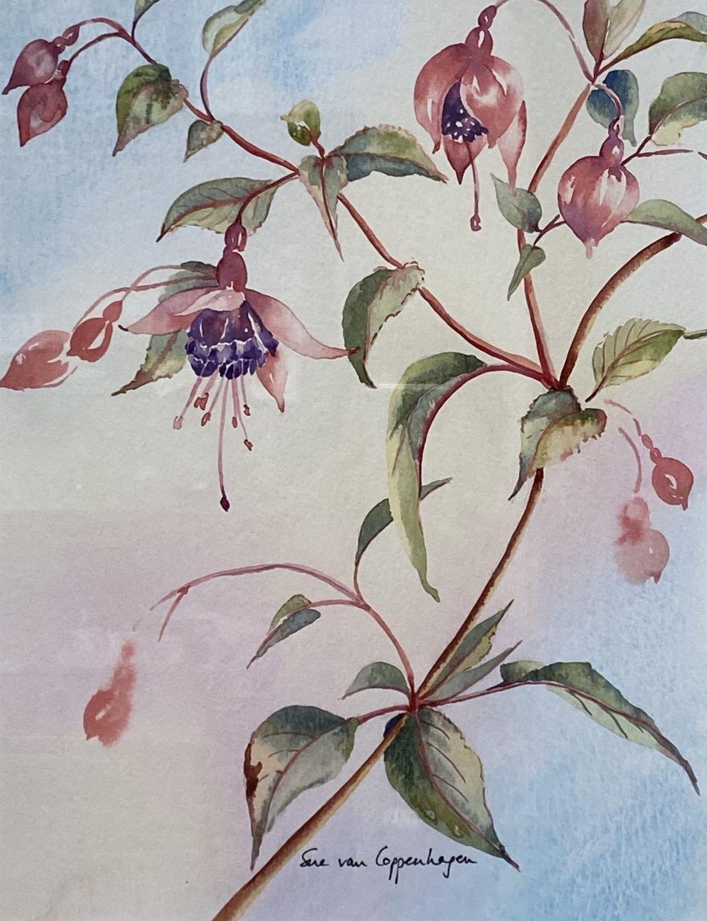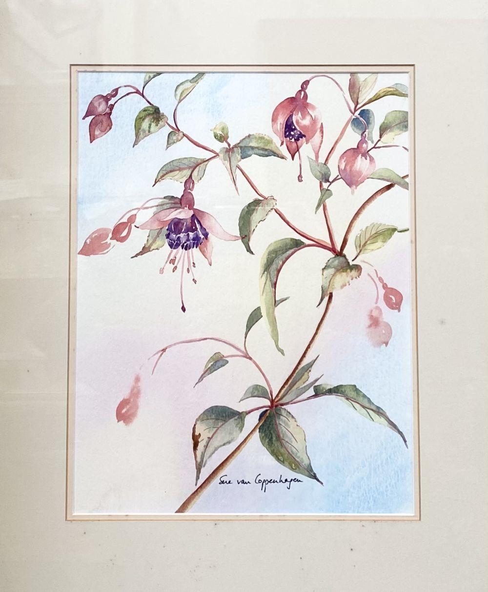 SUE VAN COPPENHAGEN (20th Century), FUCHSIA, watercolour, signed lower centre, artists label verso, dimensions: 46cm x 55cm approx. frame