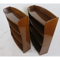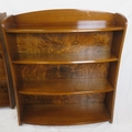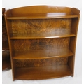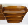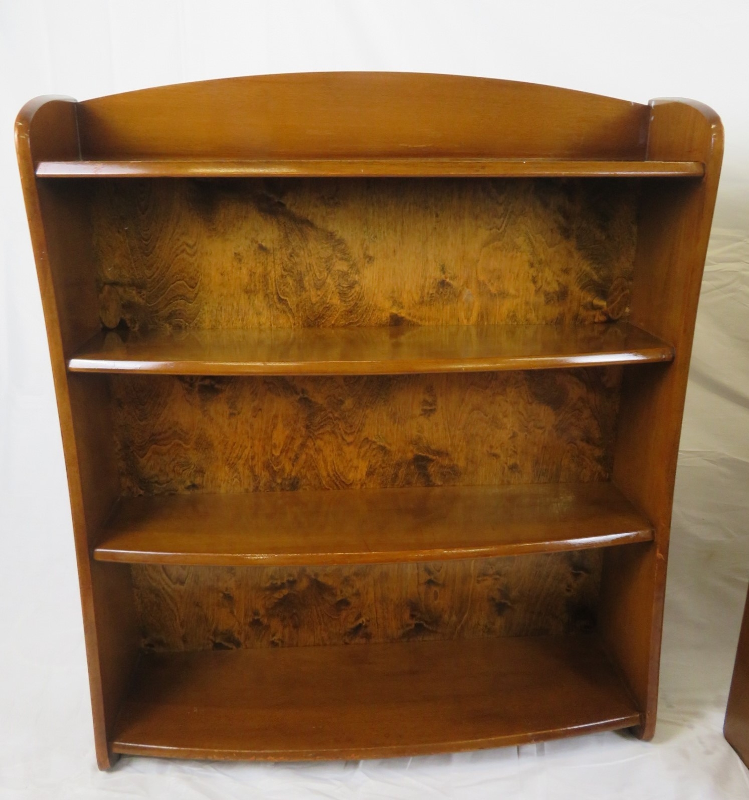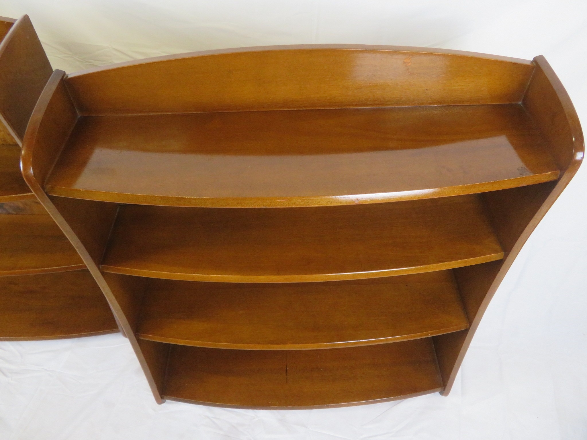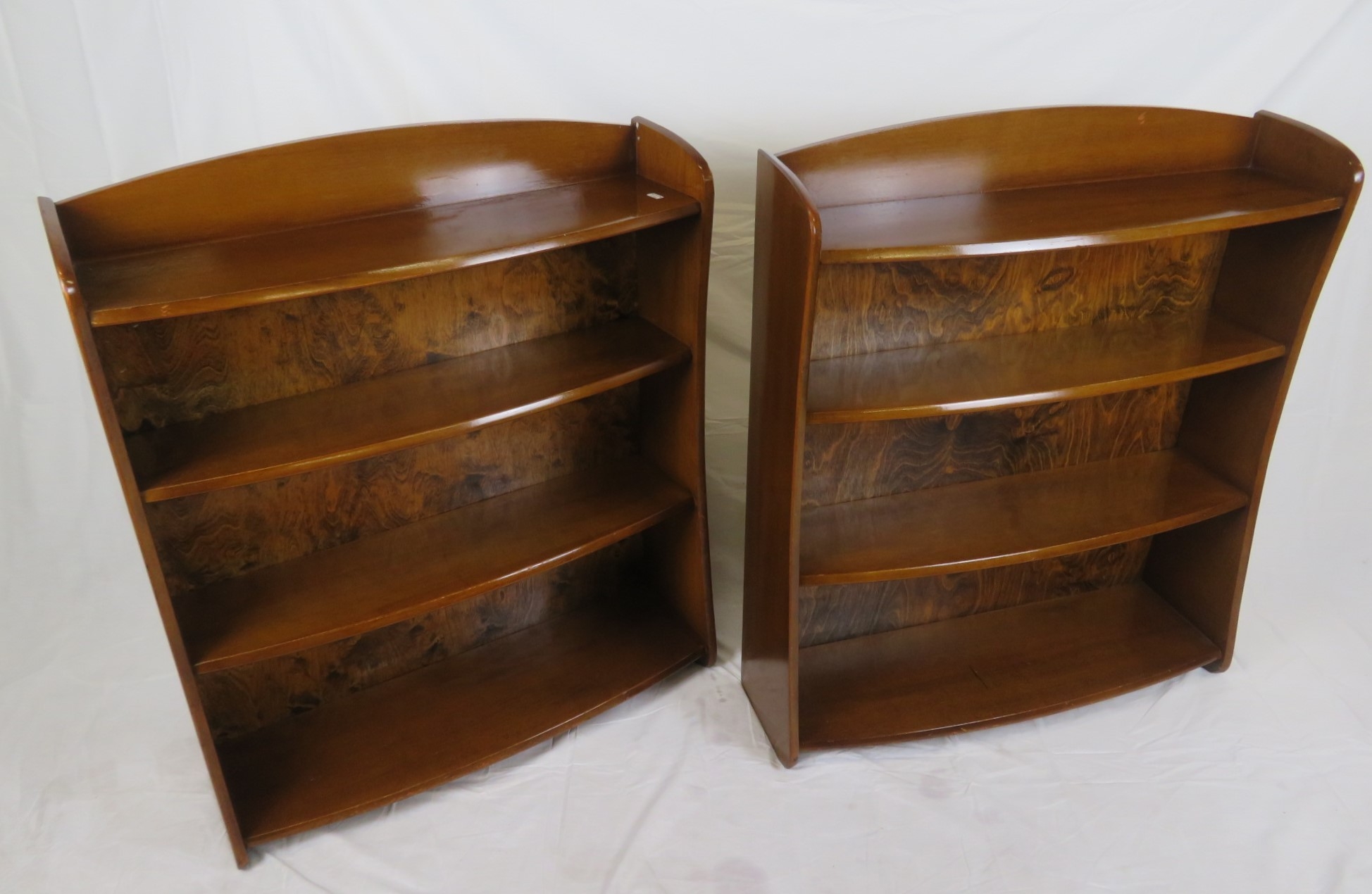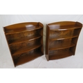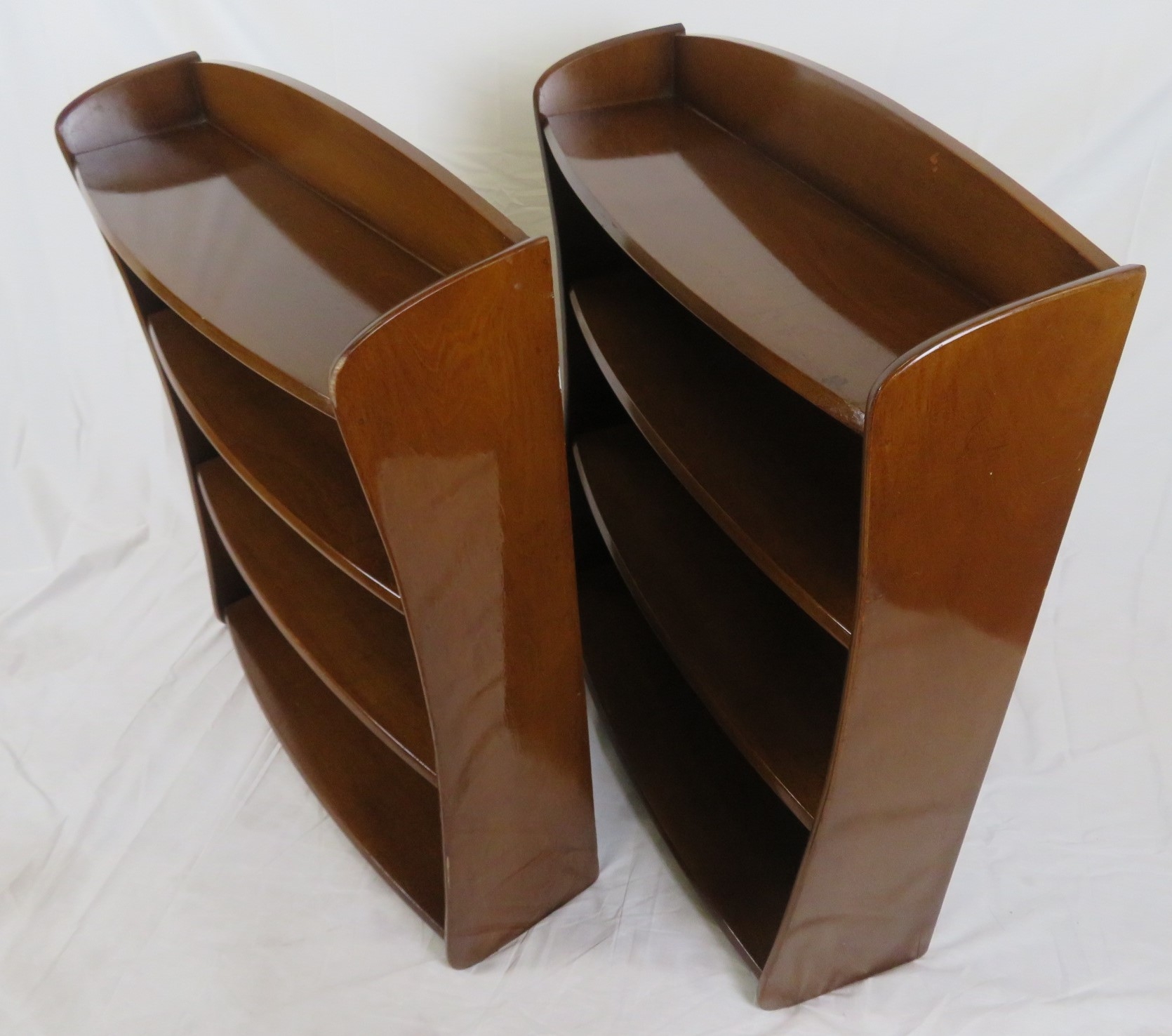 Pair of Edwardian design bowfronted 4-tier open bookshelves with shaped sides, stamped 'Remploy'