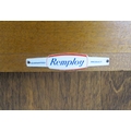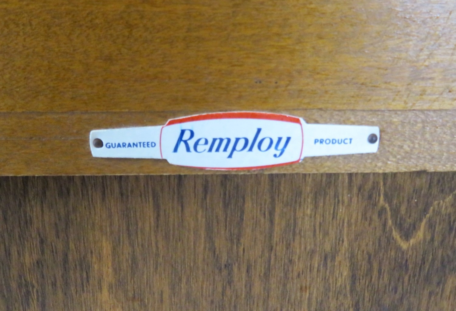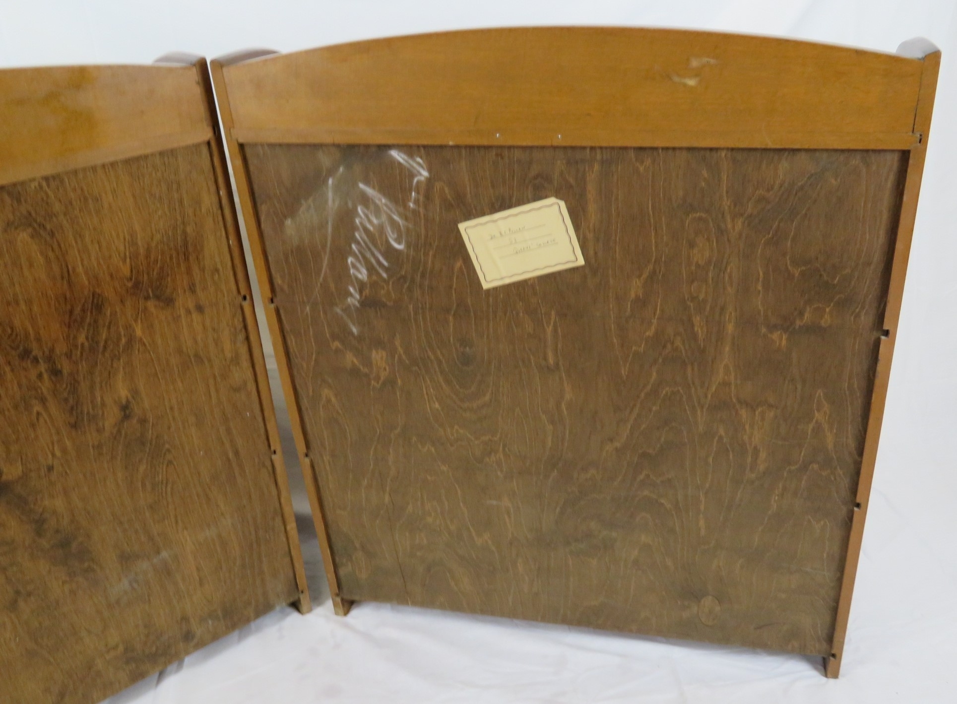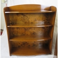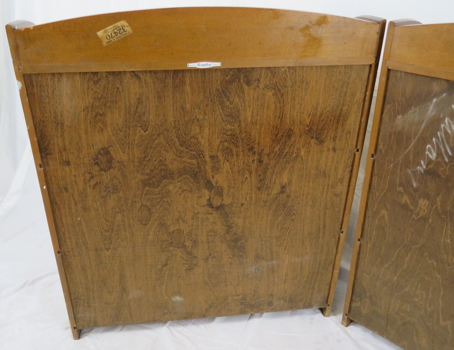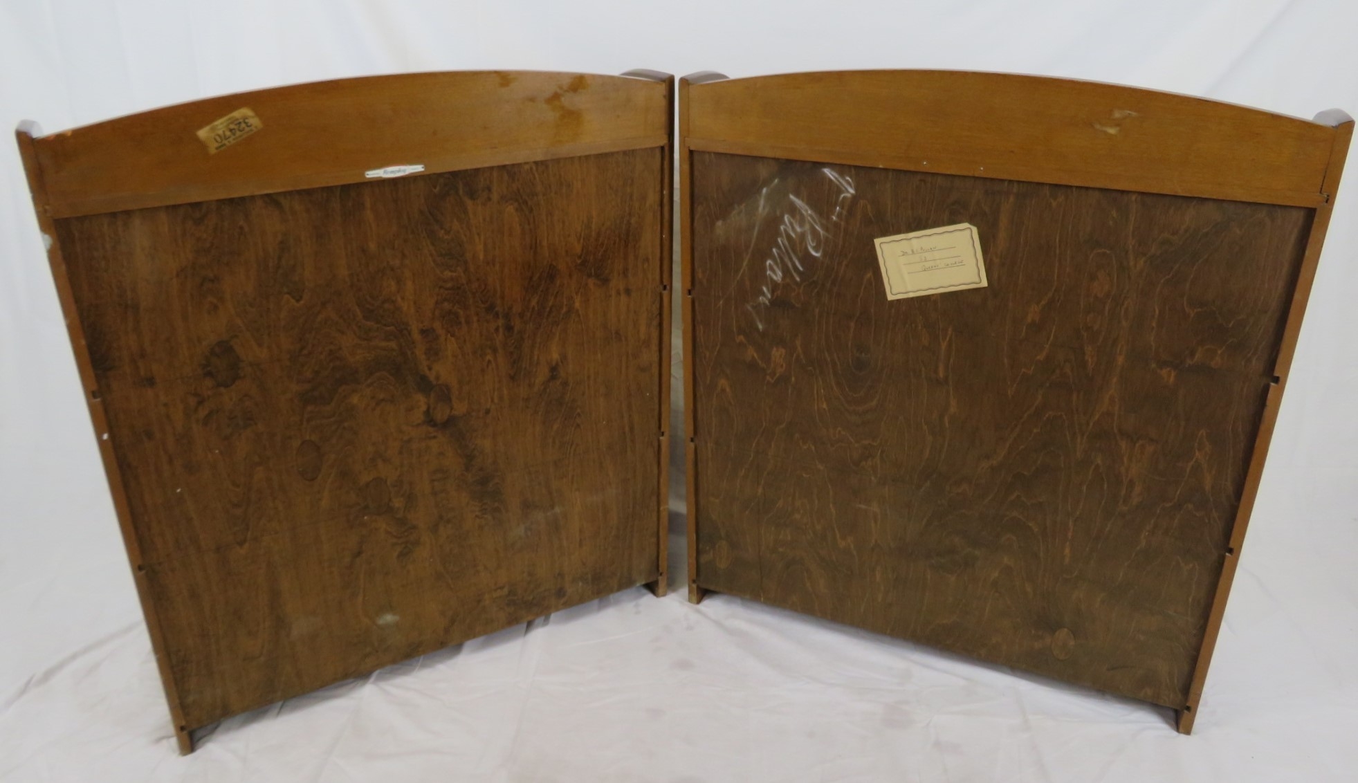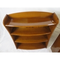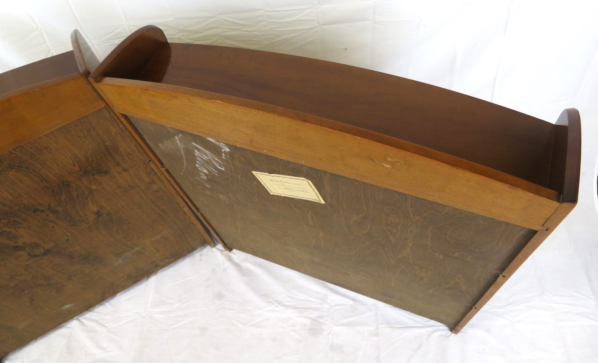 Pair of Edwardian design bowfronted 4-tier open bookshelves with shaped sides, stamped 'Remploy'