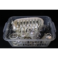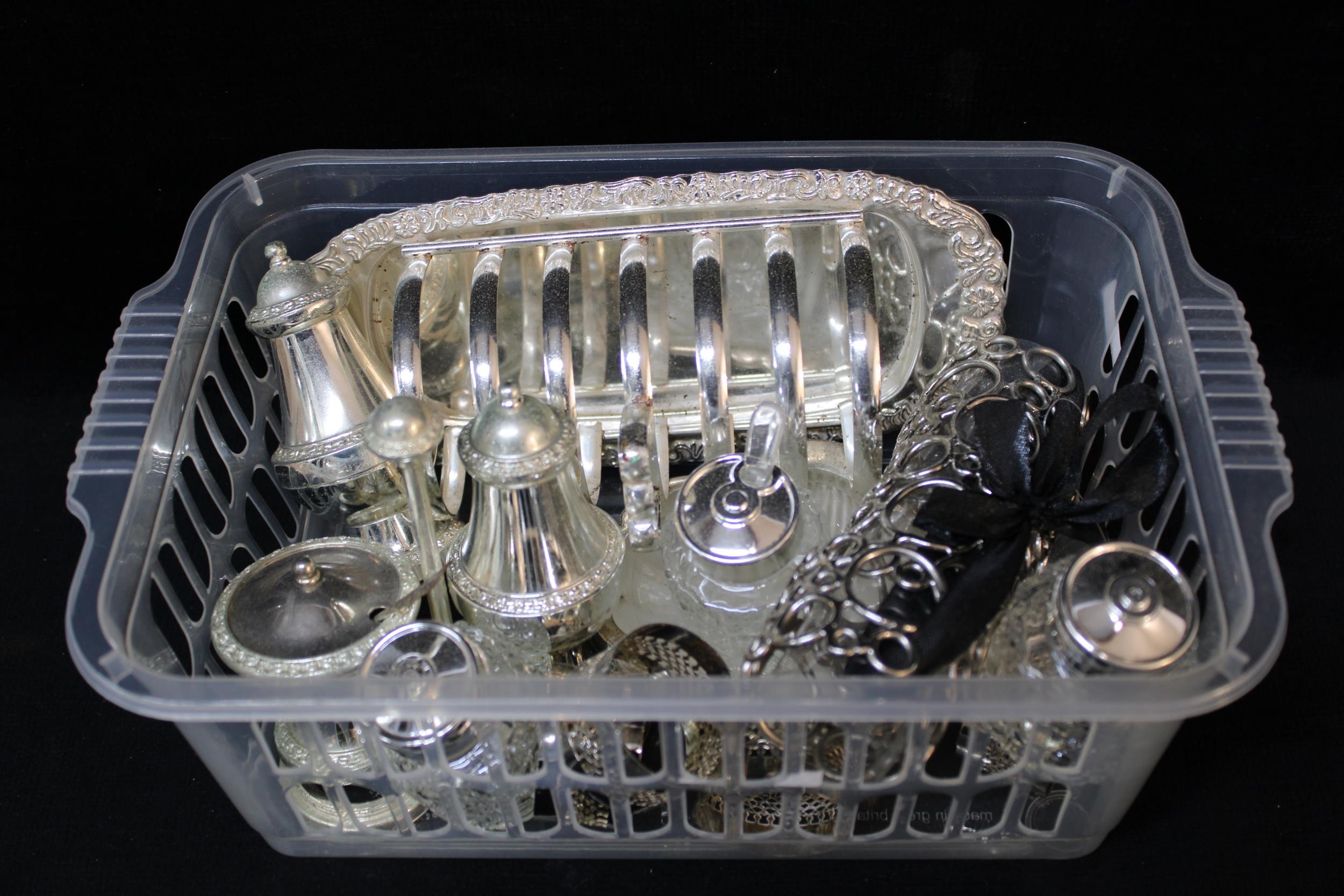 A basket of silver plated items