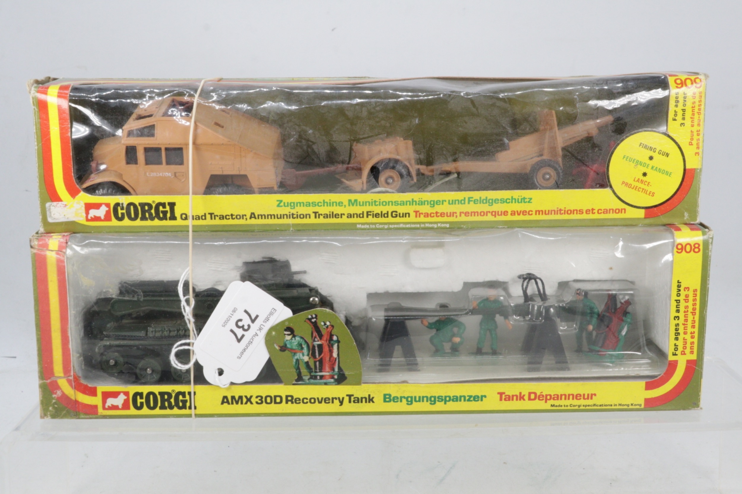 Corgi boxed 908 AMX 30D Recovery tank together with 909 Quad tractor trailer and gun
