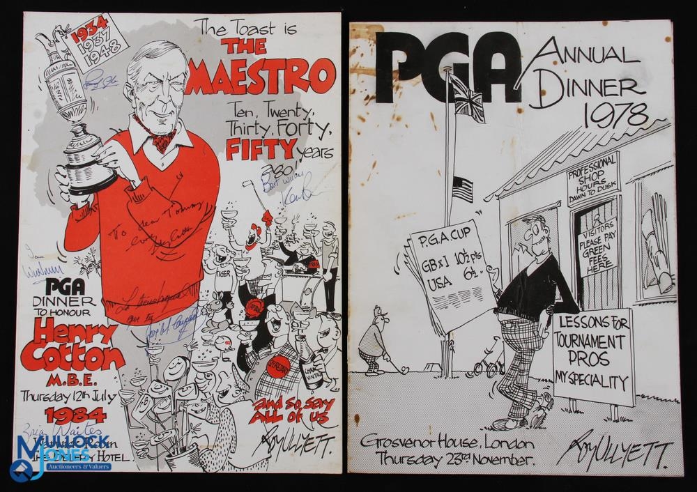 1984 Henry Cotton MBE Signed PGA Annual Dinner and Awards Menu held in his Honour and Celebrating His 50th Anniversary after his first Open Golf championship in 1934 at The Belfry and signed to the front cover by Henry Cotton together with Sandy Lyle, Ian Woosnam, Ken Brown, Jose Maria Olazabal and Brian Waites c/w official Invitation to Tommy Horton (pocket crease); plus 2x other PGA Annual Dinner Menus for 1977 and 1978 (pocket fold) and some spillage marks