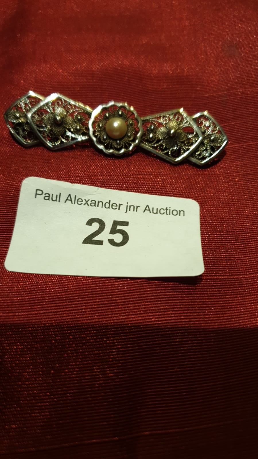Silver fillagree brooch with centre pearl.