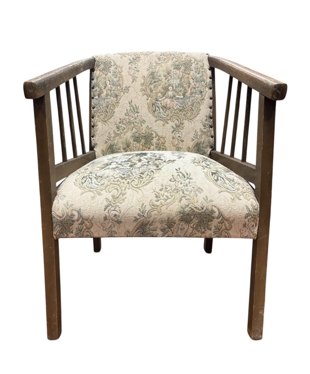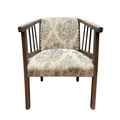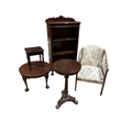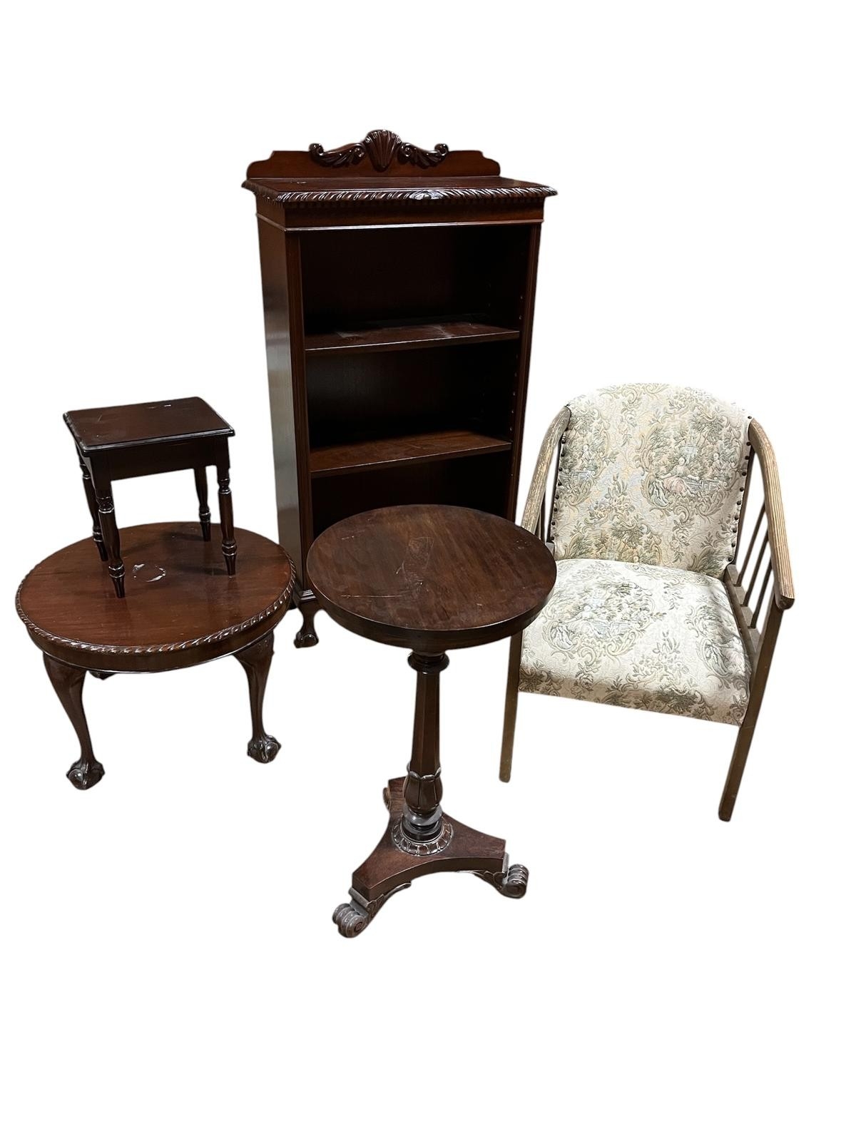 A VINTAGE BEECHWOOD TUB SHAPED CHAIR with upholstered back and seat, A WILLIAM IV STYLE MAHOGANY OCCASIONAL TABLE the circular moulded top above a faceted column on shaped platform base, A MAHOGANY THREE TIER OPEN FRONT BOOKCASE, etc. (5)