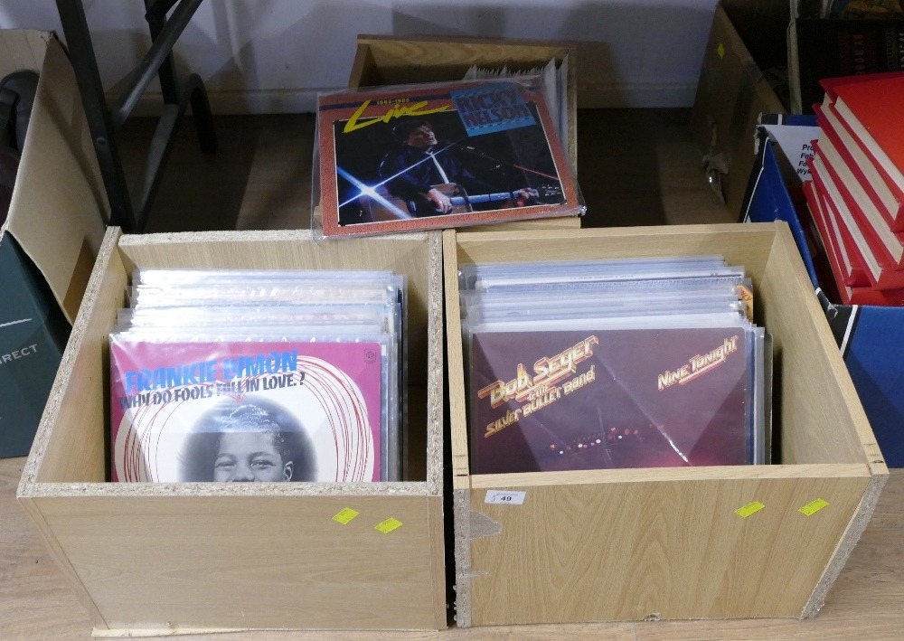 Three wooden crates containing vinyl LP's, Bobby Bare, Bob Seger, Little Richard, Frankie, Lymon, Tina Turner etc