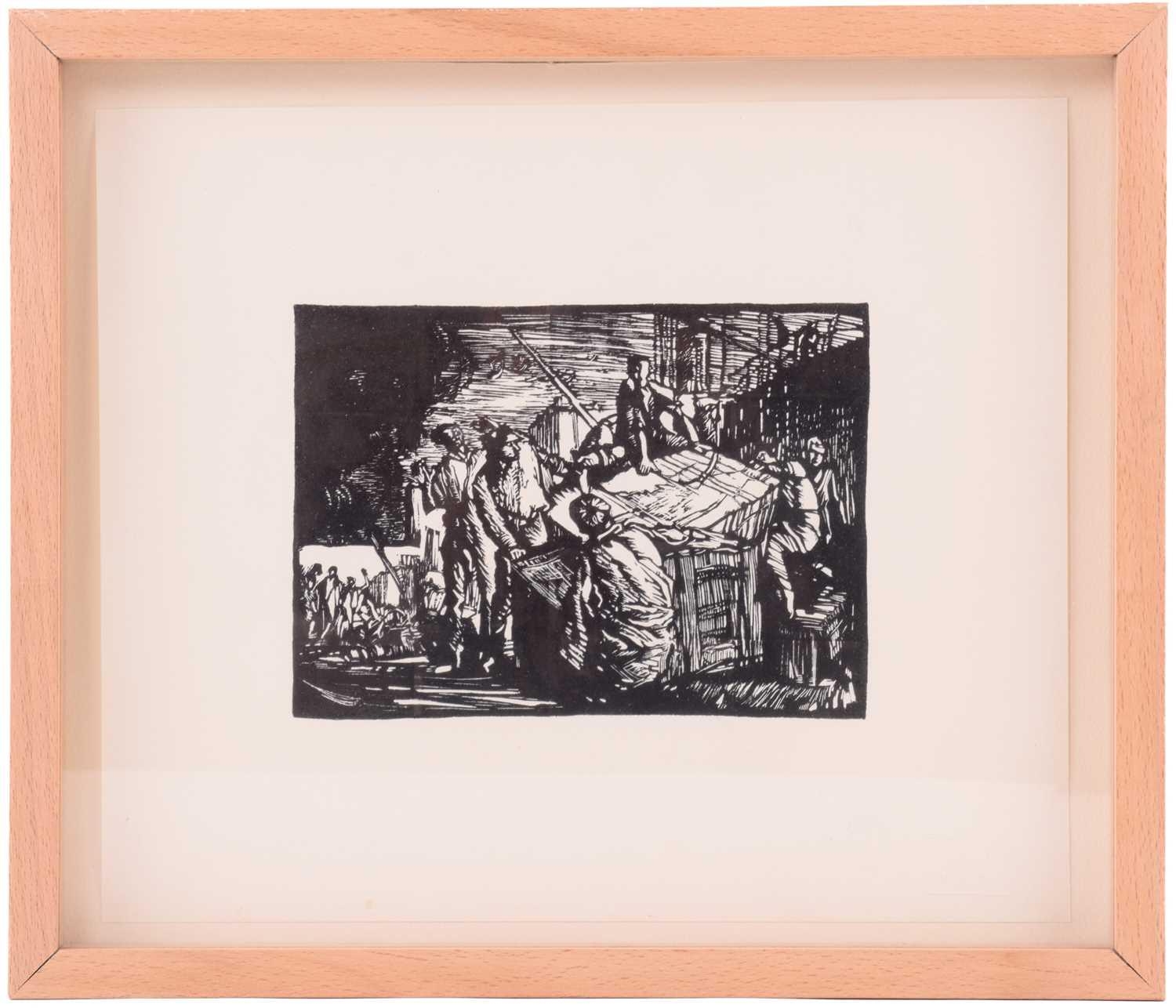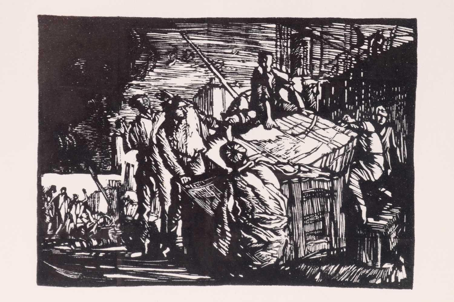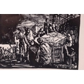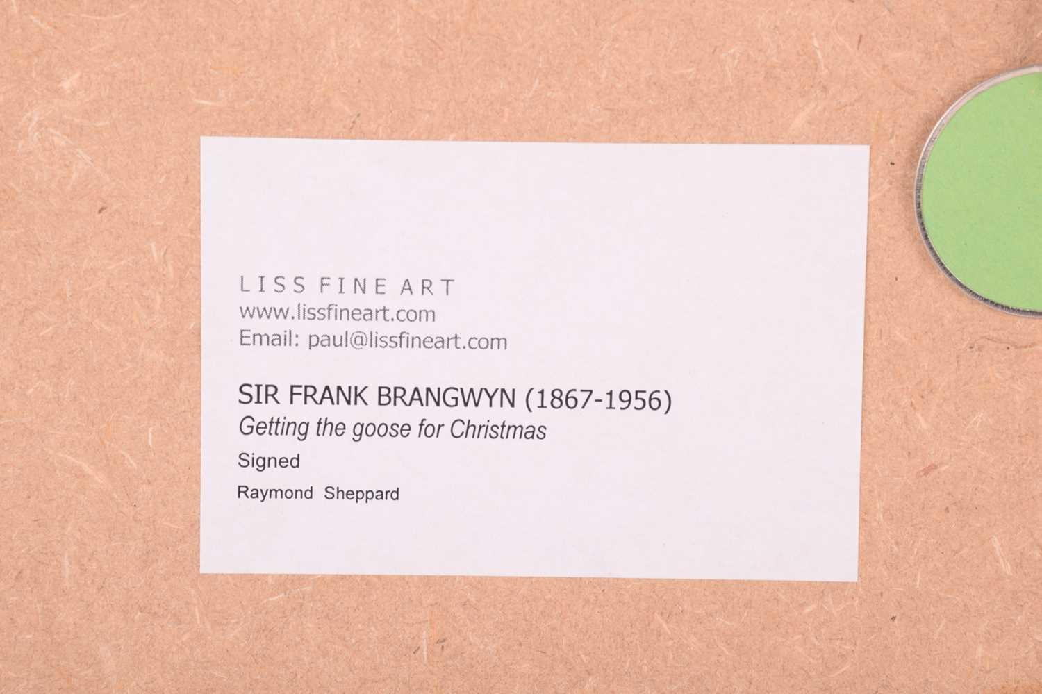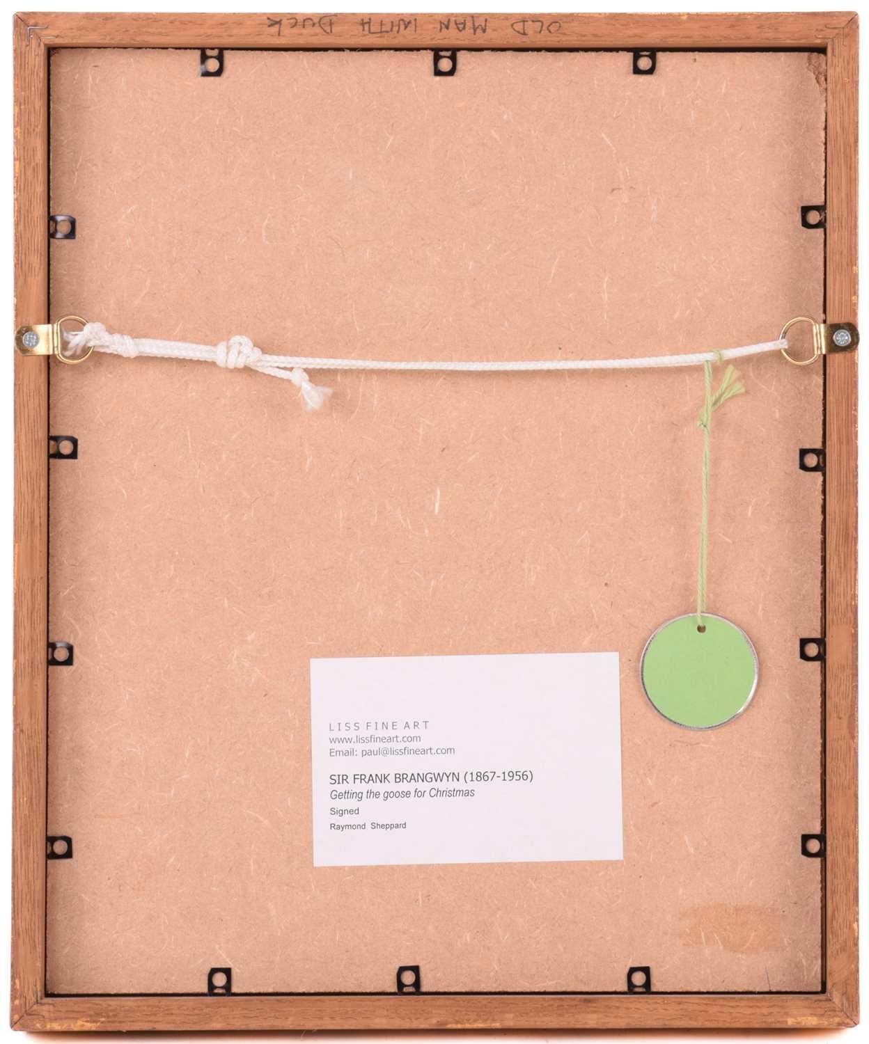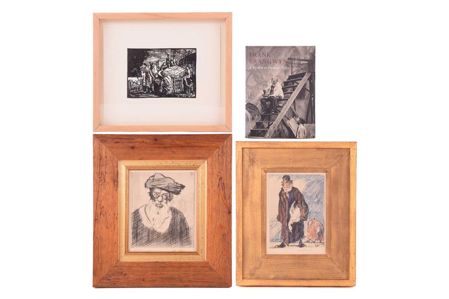 † Frank Brangwyn (1867 - 1956), 'Bringing home the Christmas Goose', signed in pencil, etching, pastel and watercolour, inscribed in pen verso 'All good wishes for a Peaceful Christmas from Frank(?) Brangwyn 1944', 17 x 13 cm, framed and glazed, frame 34 x 28.5 cm; From 'The Stations of the Cross', inscribed in pencil First State, etching, 18 x 15 cm, framed and glazed, frame 35 x 32 cm; the woodblock for 'Unloading at London Bridge, 1914-1918', 12 x 16 cm, framed and glazed with a printed impression verso, frame 28 x 33 cm, and 'Frank Brangwyn - A Mission to Decorate Life' March -April 2006 Liss Fine Art and The Fine Art Society Qty: (4) 'Bringing Home the Christmas Goose' with Liss Fine Art label verso; The Stations of the Cross reputed to be from the collection of Count WIlliam De Belleroche