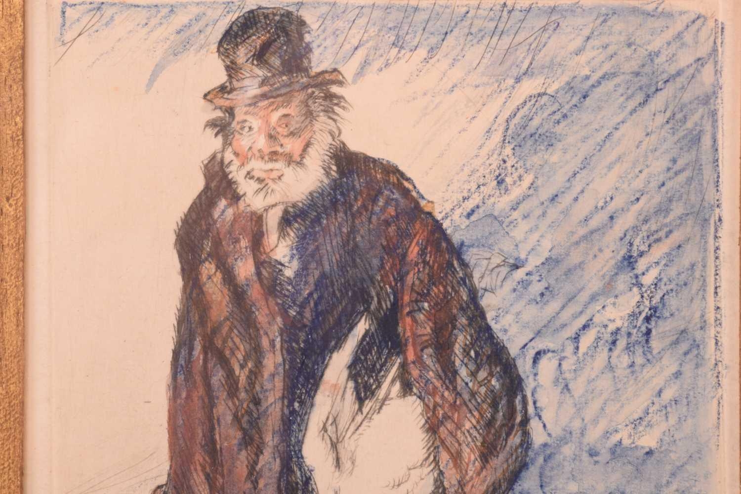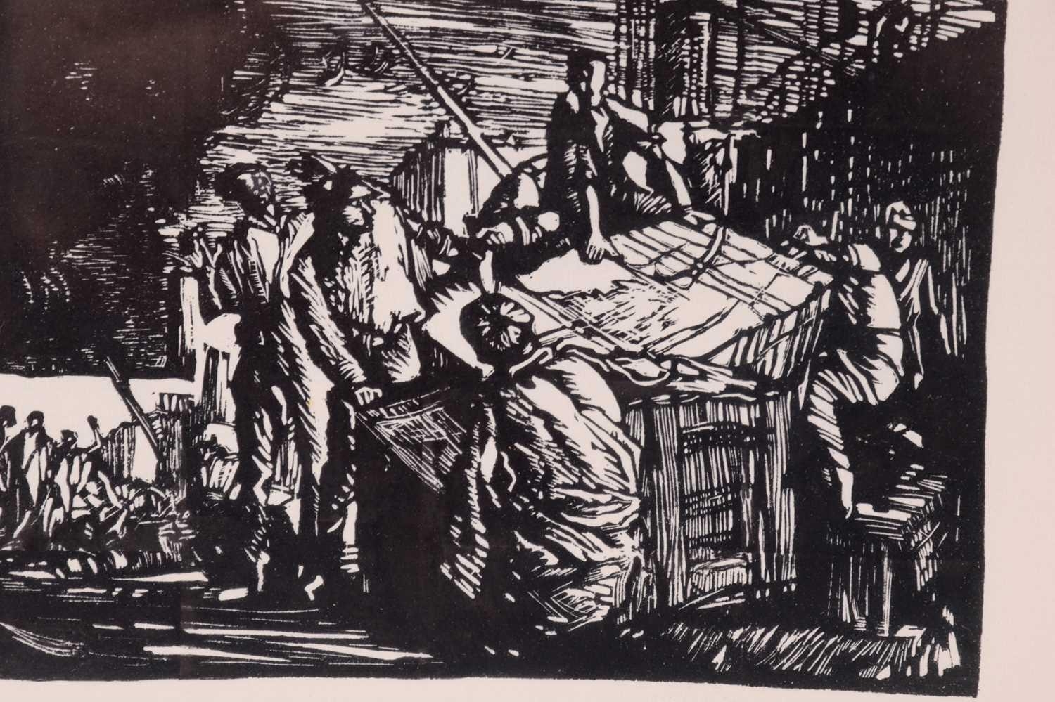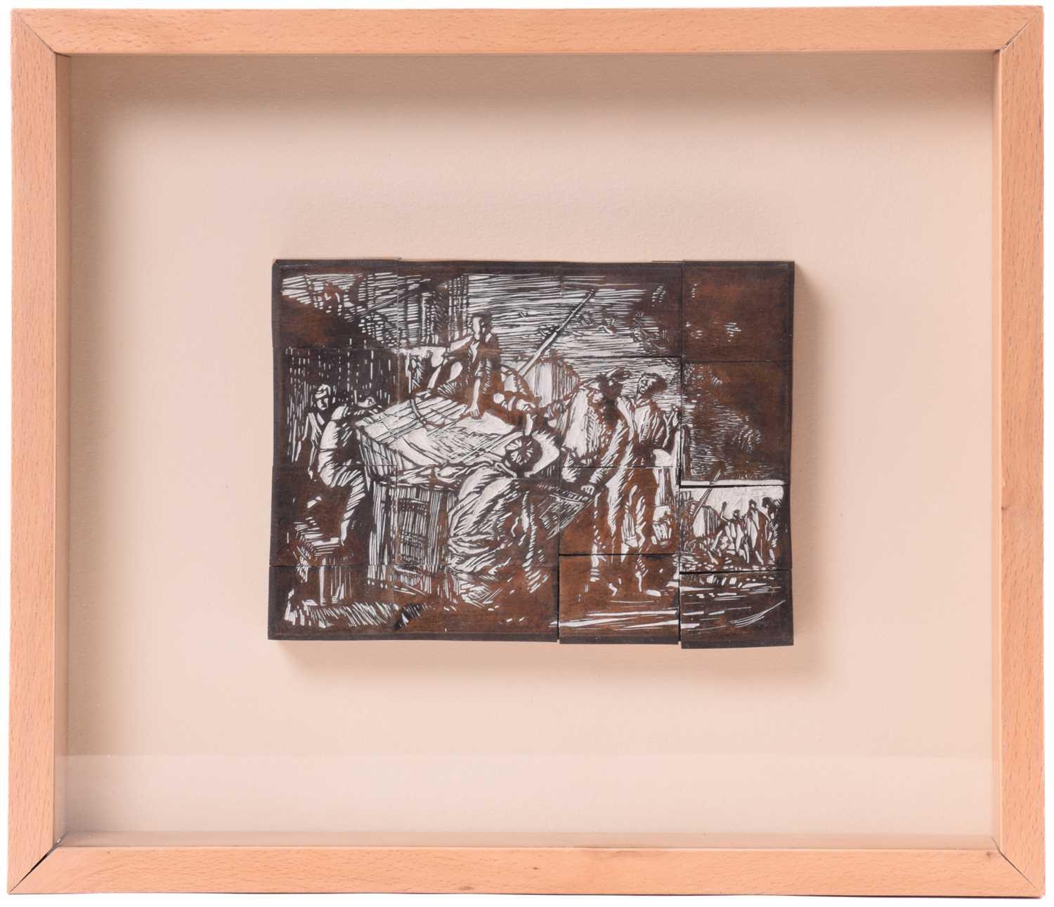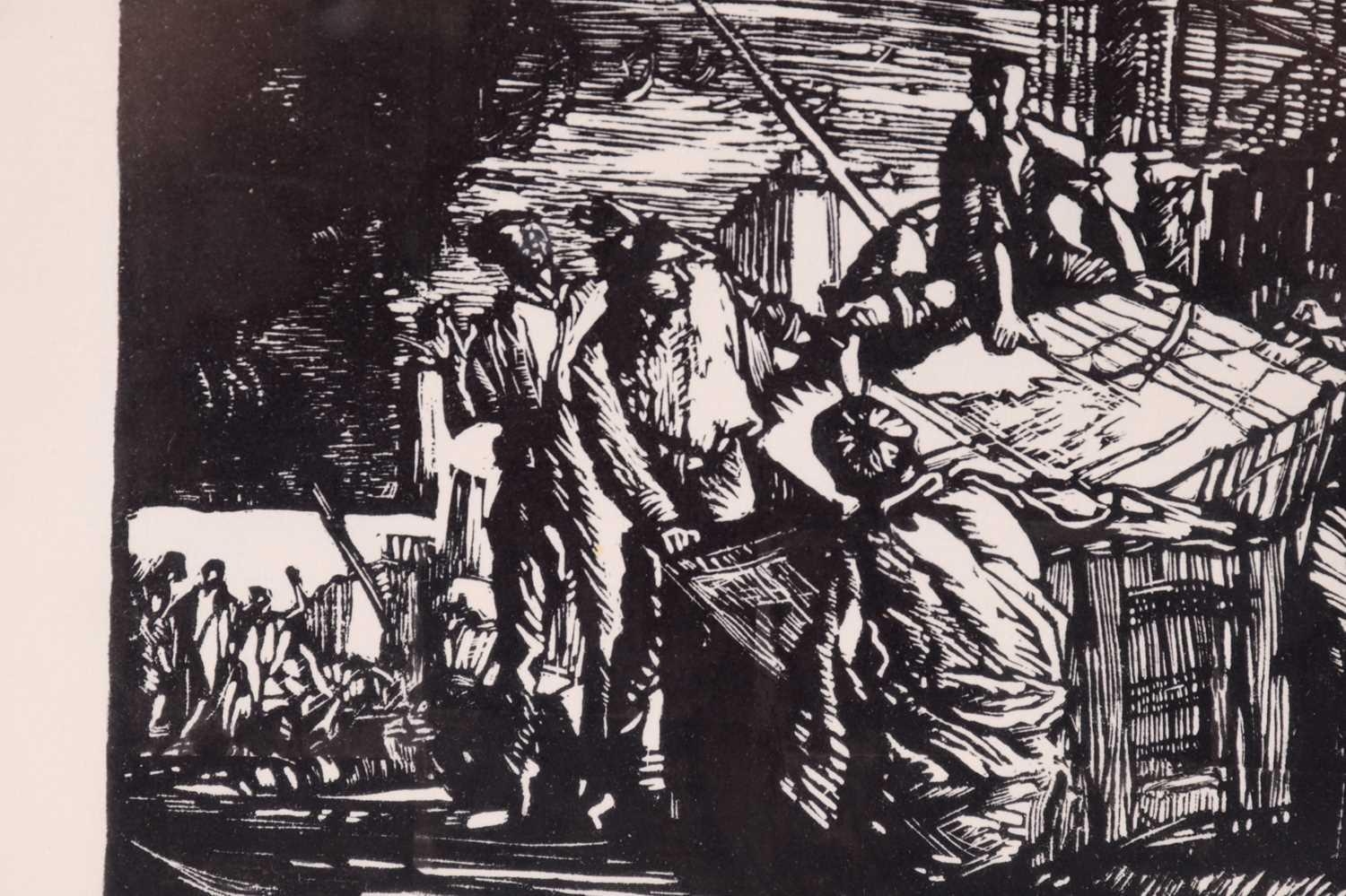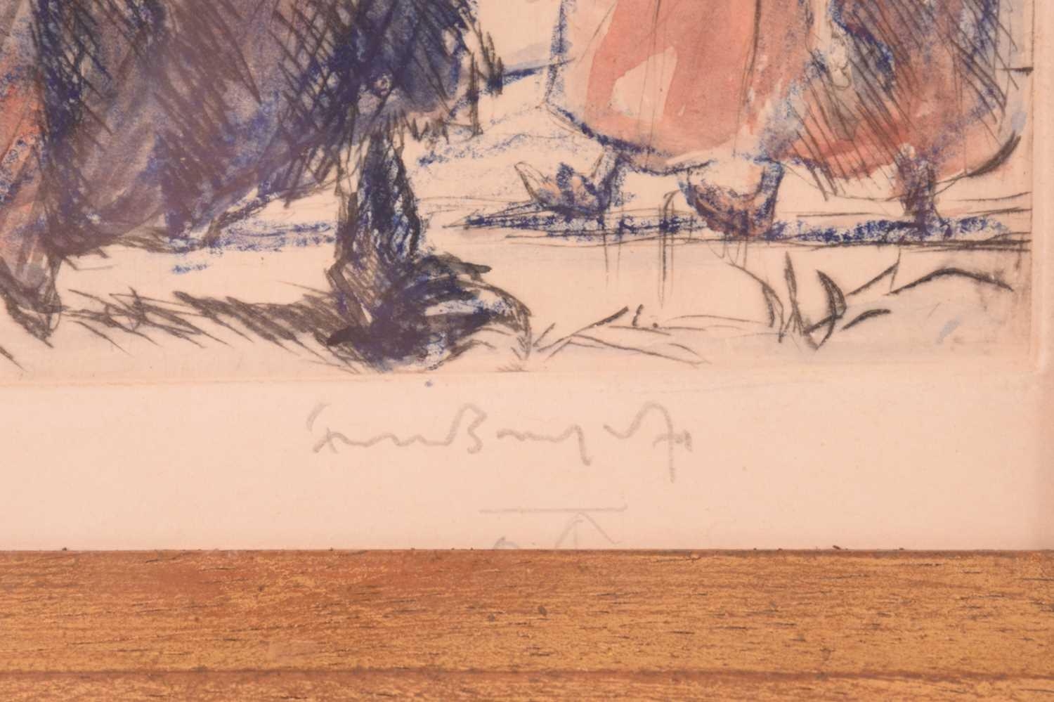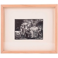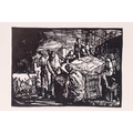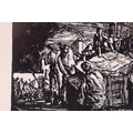 † Frank Brangwyn (1867 - 1956), 'Bringing home the Christmas Goose', signed in pencil, etching, pastel and watercolour, inscribed in pen verso 'All good wishes for a Peaceful Christmas from Frank(?) Brangwyn 1944', 17 x 13 cm, framed and glazed, frame 34 x 28.5 cm; From 'The Stations of the Cross', inscribed in pencil First State, etching, 18 x 15 cm, framed and glazed, frame 35 x 32 cm; the woodblock for 'Unloading at London Bridge, 1914-1918', 12 x 16 cm, framed and glazed with a printed impression verso, frame 28 x 33 cm, and 'Frank Brangwyn - A Mission to Decorate Life' March -April 2006 Liss Fine Art and The Fine Art Society Qty: (4) 'Bringing Home the Christmas Goose' with Liss Fine Art label verso; The Stations of the Cross reputed to be from the collection of Count WIlliam De Belleroche