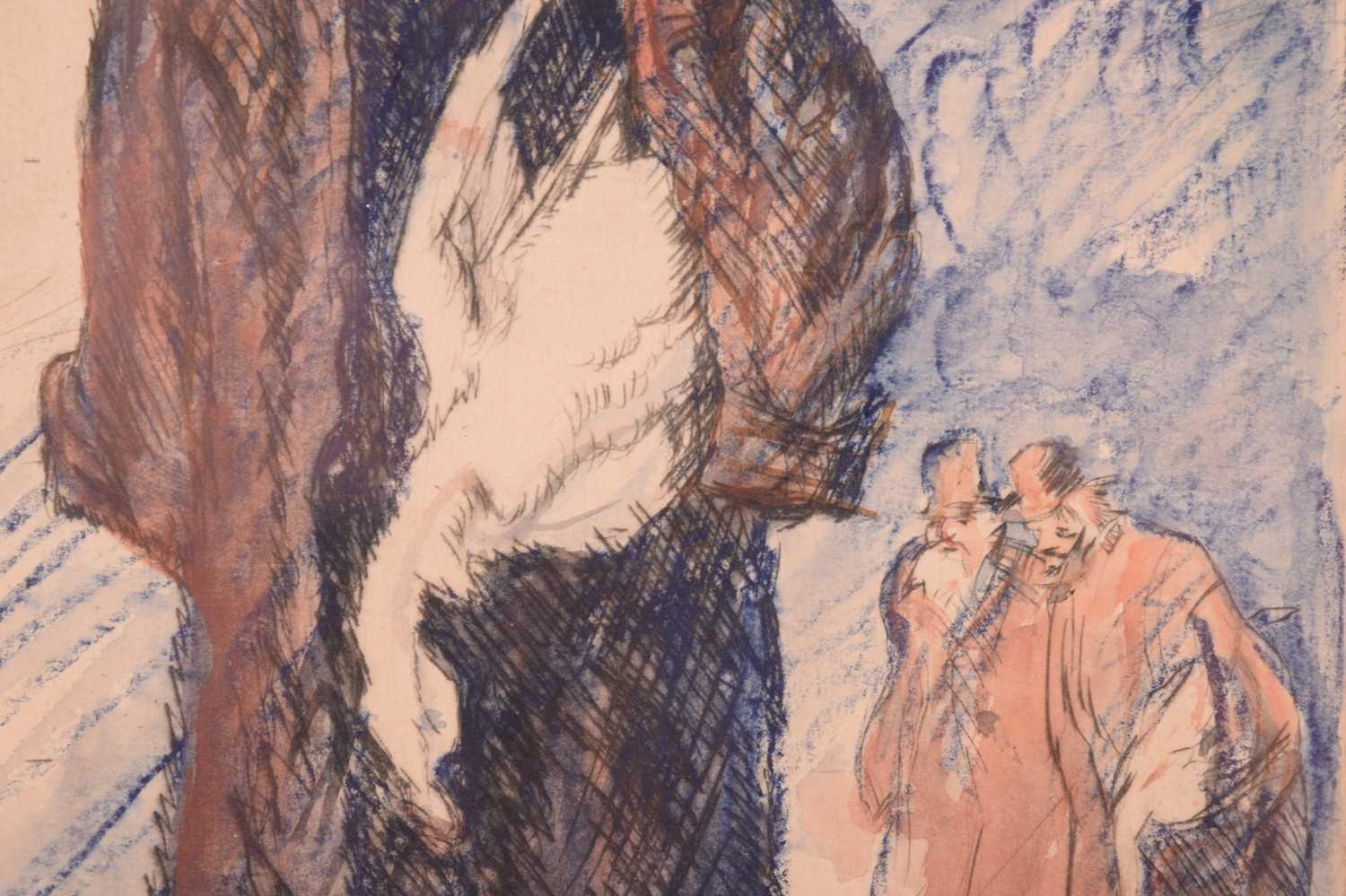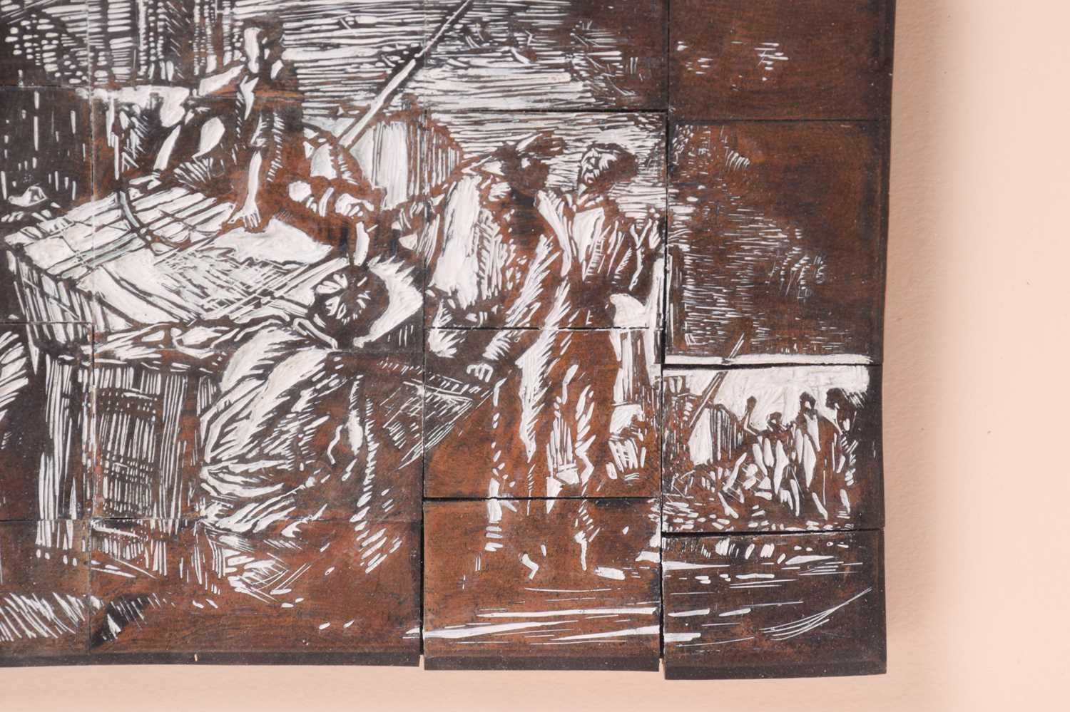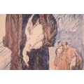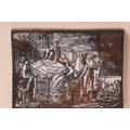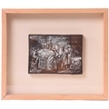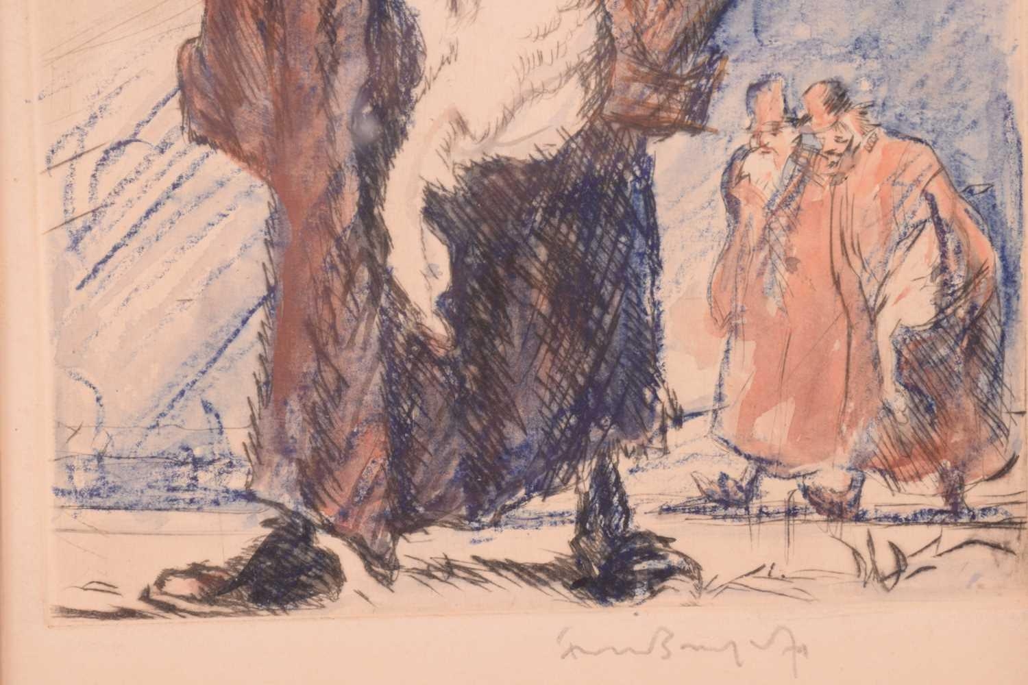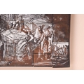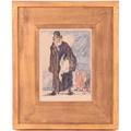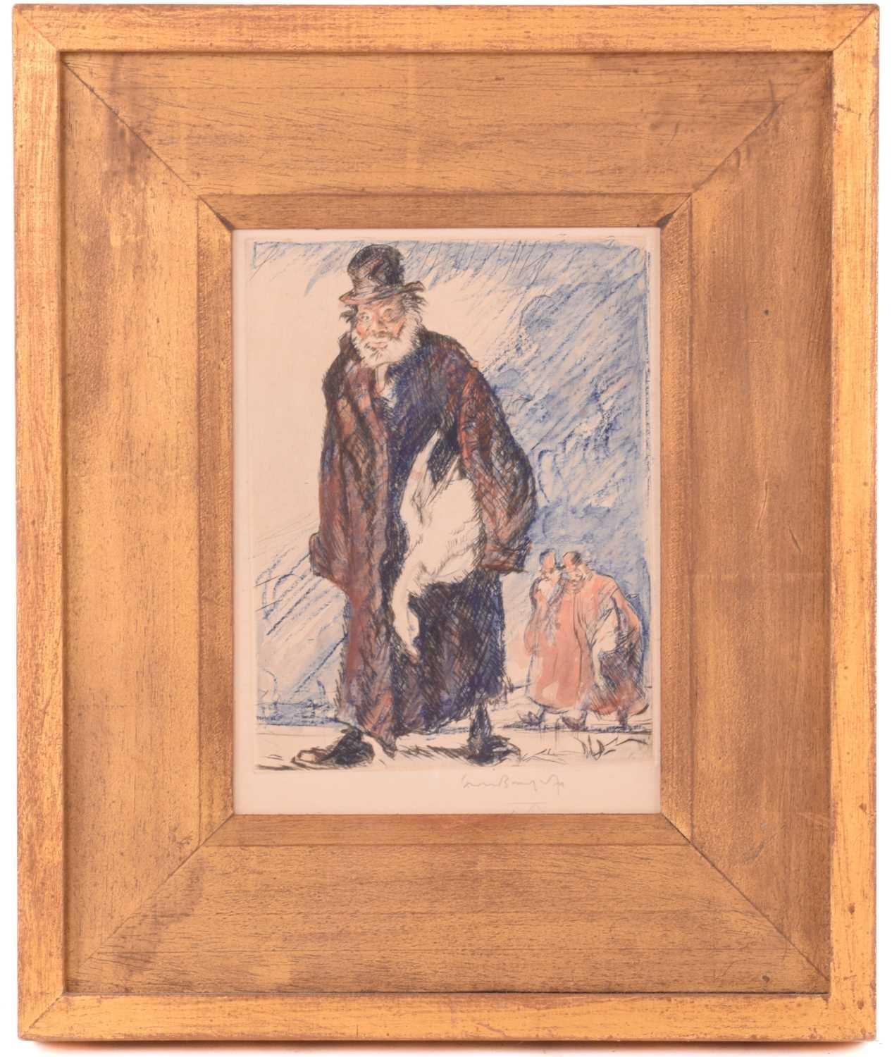 † Frank Brangwyn (1867 - 1956), 'Bringing home the Christmas Goose', signed in pencil, etching, pastel and watercolour, inscribed in pen verso 'All good wishes for a Peaceful Christmas from Frank(?) Brangwyn 1944', 17 x 13 cm, framed and glazed, frame 34 x 28.5 cm; From 'The Stations of the Cross', inscribed in pencil First State, etching, 18 x 15 cm, framed and glazed, frame 35 x 32 cm; the woodblock for 'Unloading at London Bridge, 1914-1918', 12 x 16 cm, framed and glazed with a printed impression verso, frame 28 x 33 cm, and 'Frank Brangwyn - A Mission to Decorate Life' March -April 2006 Liss Fine Art and The Fine Art Society Qty: (4) 'Bringing Home the Christmas Goose' with Liss Fine Art label verso; The Stations of the Cross reputed to be from the collection of Count WIlliam De Belleroche
