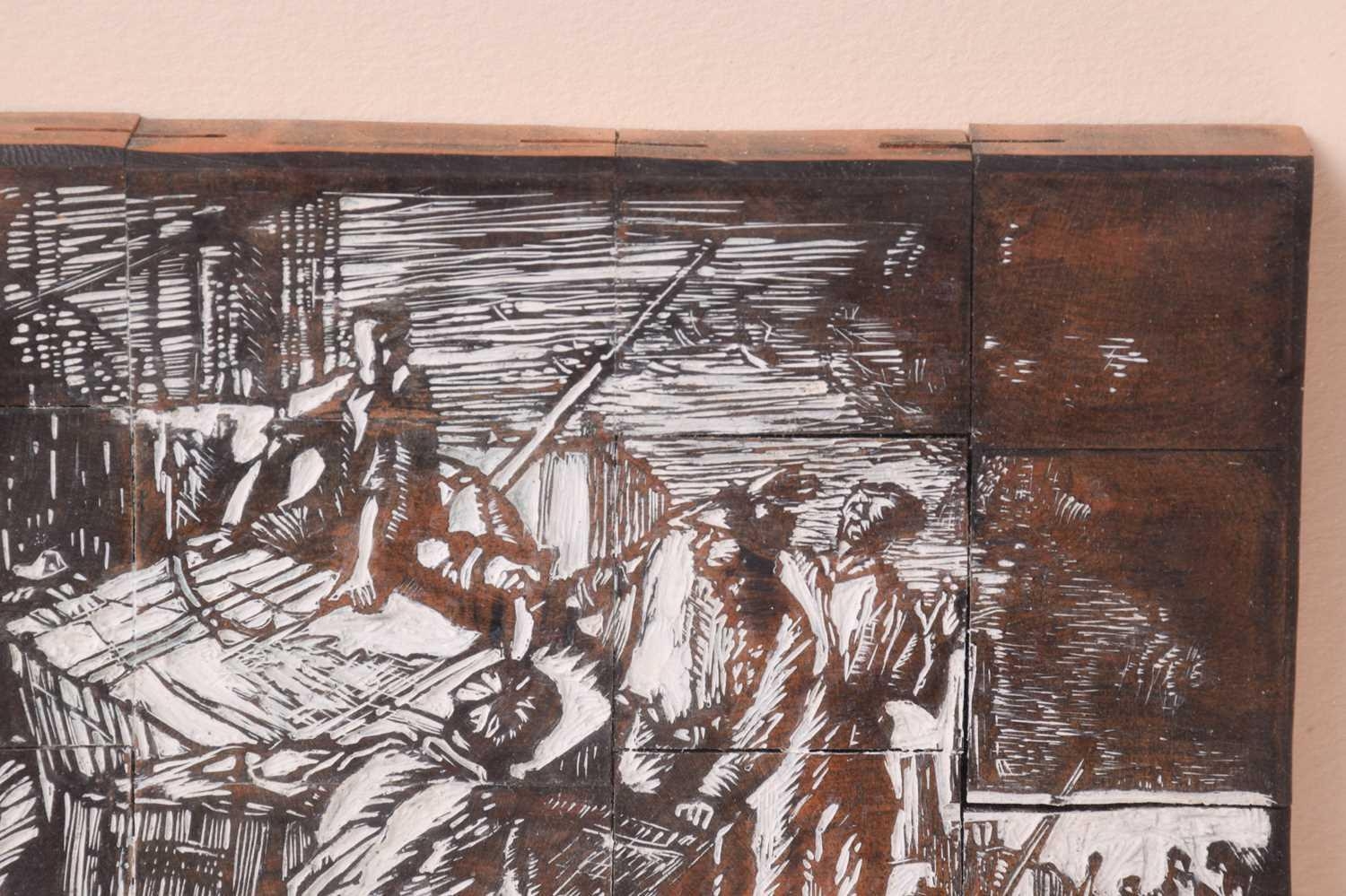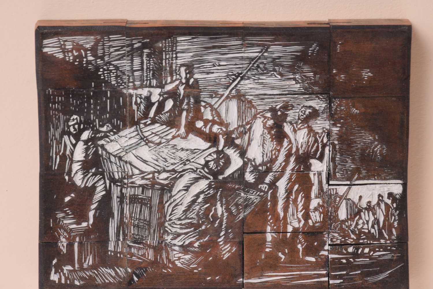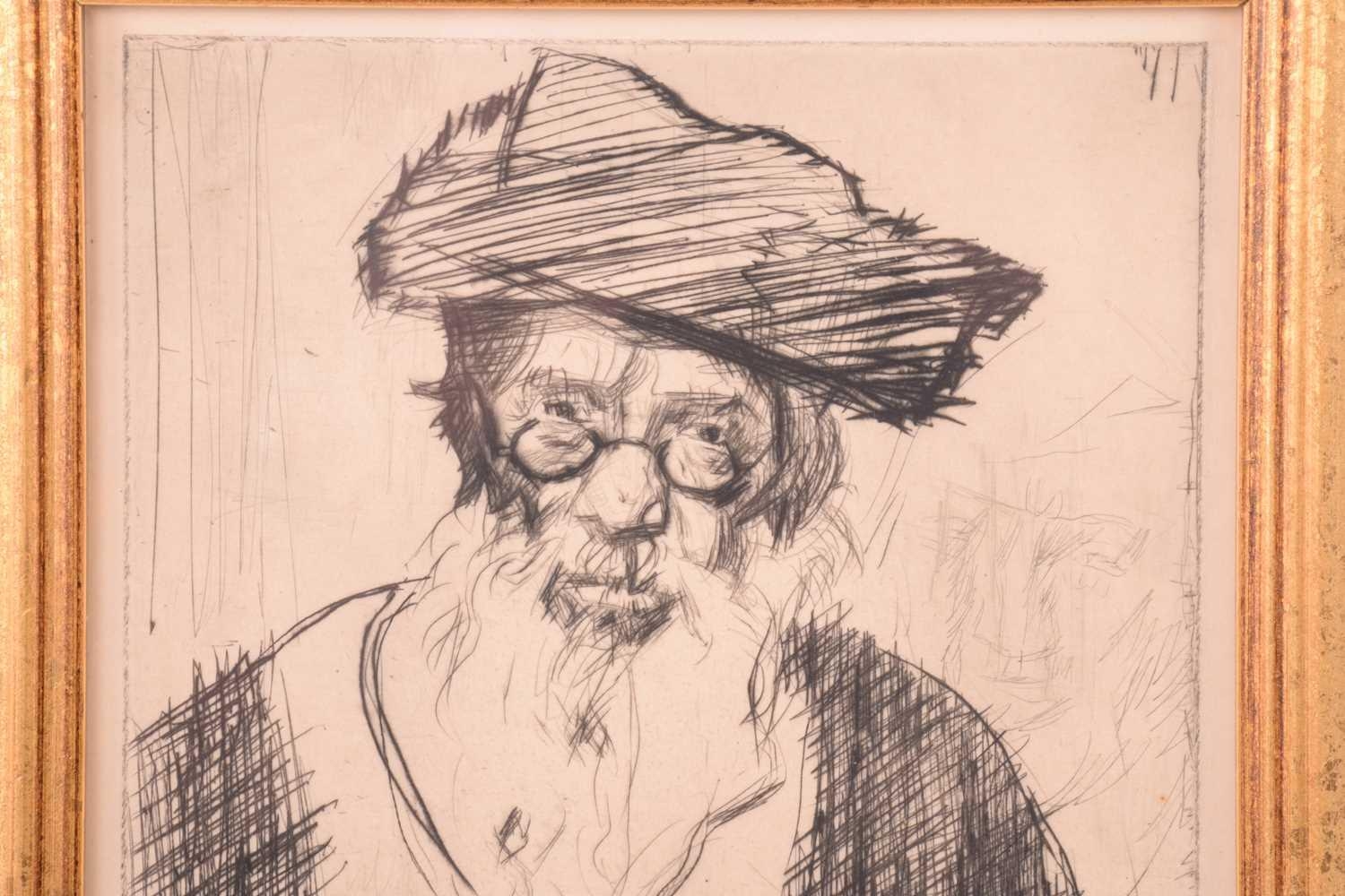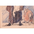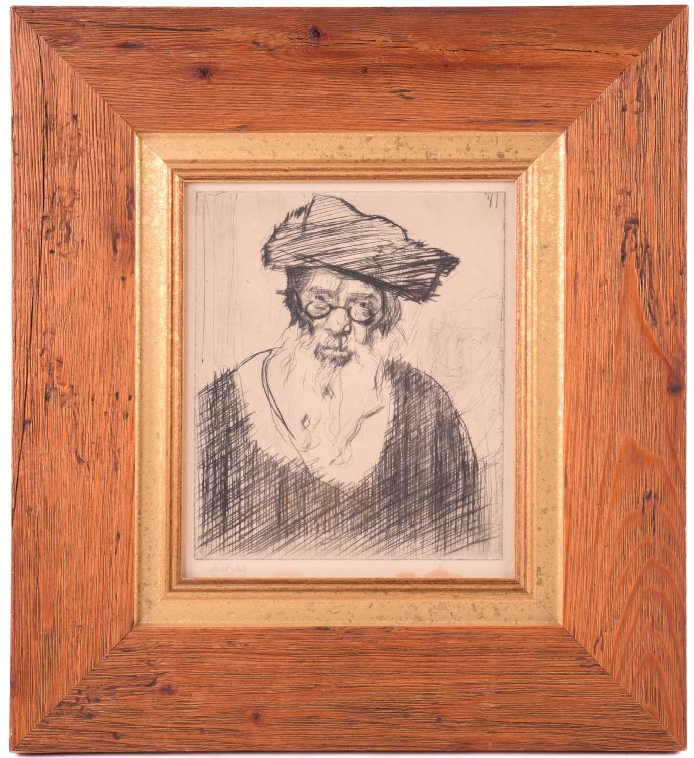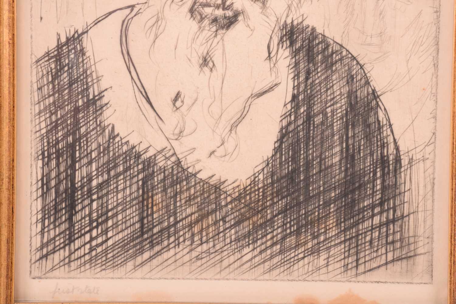 † Frank Brangwyn (1867 - 1956), 'Bringing home the Christmas Goose', signed in pencil, etching, pastel and watercolour, inscribed in pen verso 'All good wishes for a Peaceful Christmas from Frank(?) Brangwyn 1944', 17 x 13 cm, framed and glazed, frame 34 x 28.5 cm; From 'The Stations of the Cross', inscribed in pencil First State, etching, 18 x 15 cm, framed and glazed, frame 35 x 32 cm; the woodblock for 'Unloading at London Bridge, 1914-1918', 12 x 16 cm, framed and glazed with a printed impression verso, frame 28 x 33 cm, and 'Frank Brangwyn - A Mission to Decorate Life' March -April 2006 Liss Fine Art and The Fine Art Society Qty: (4) 'Bringing Home the Christmas Goose' with Liss Fine Art label verso; The Stations of the Cross reputed to be from the collection of Count WIlliam De Belleroche