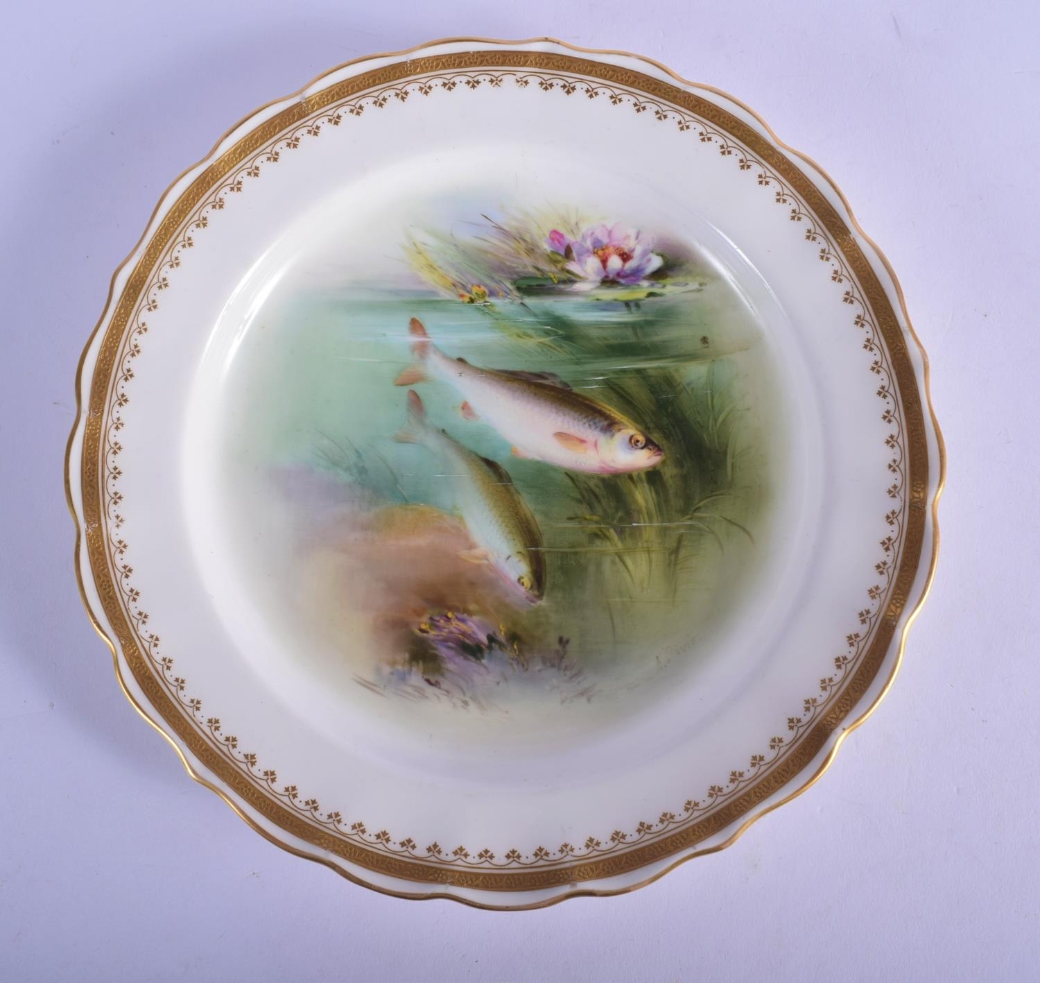Royal Worcester fine plate painted with swimming fish, titled Roach, by Harry Davis signed date code for 1907. 23cm Diameter