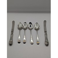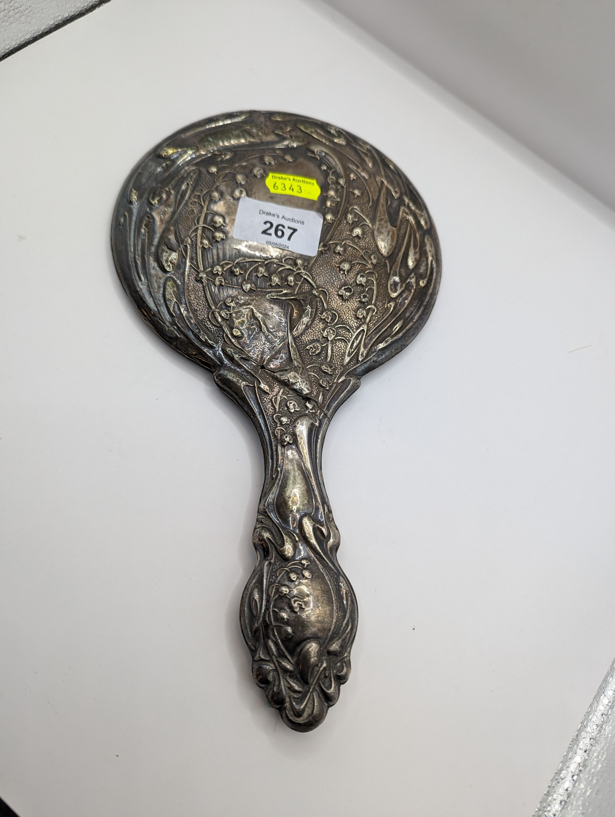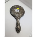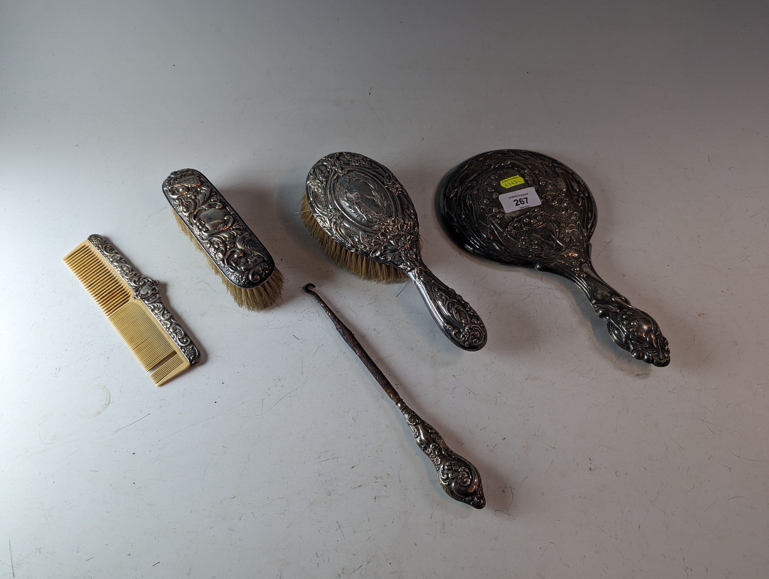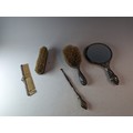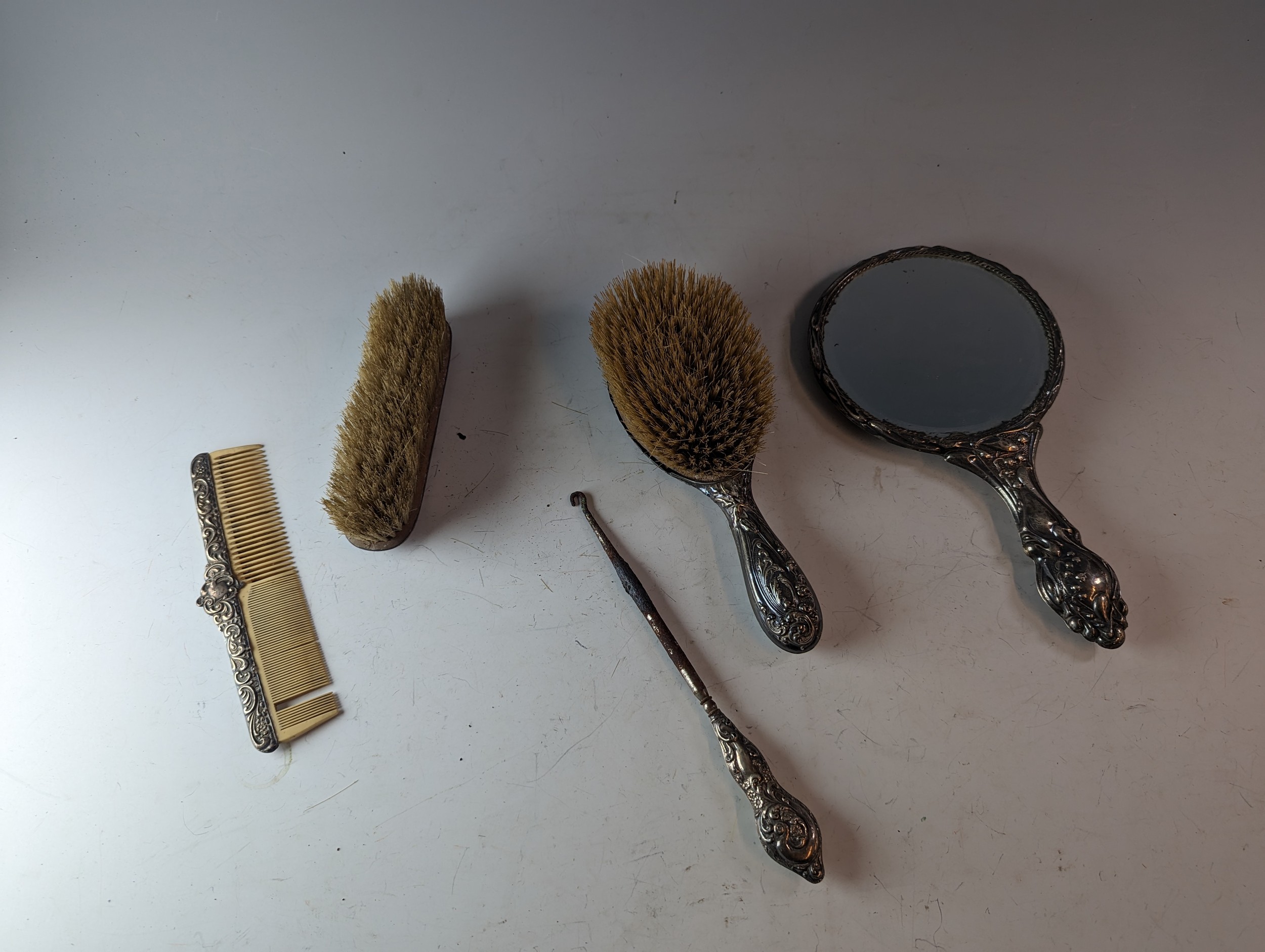 Four assorted silver mounted dressing table items, various makers and dates, and a white metal mounted hand mirror