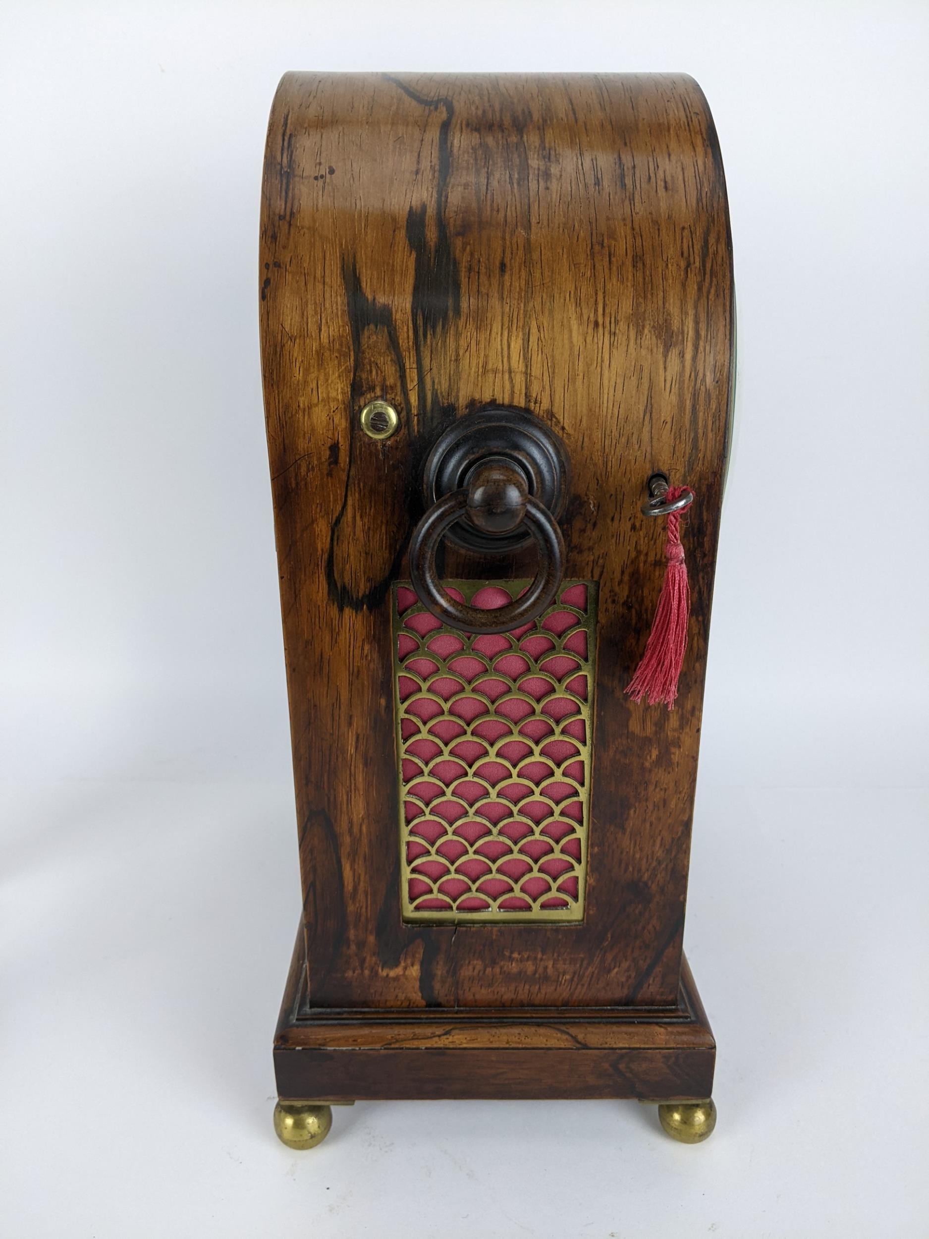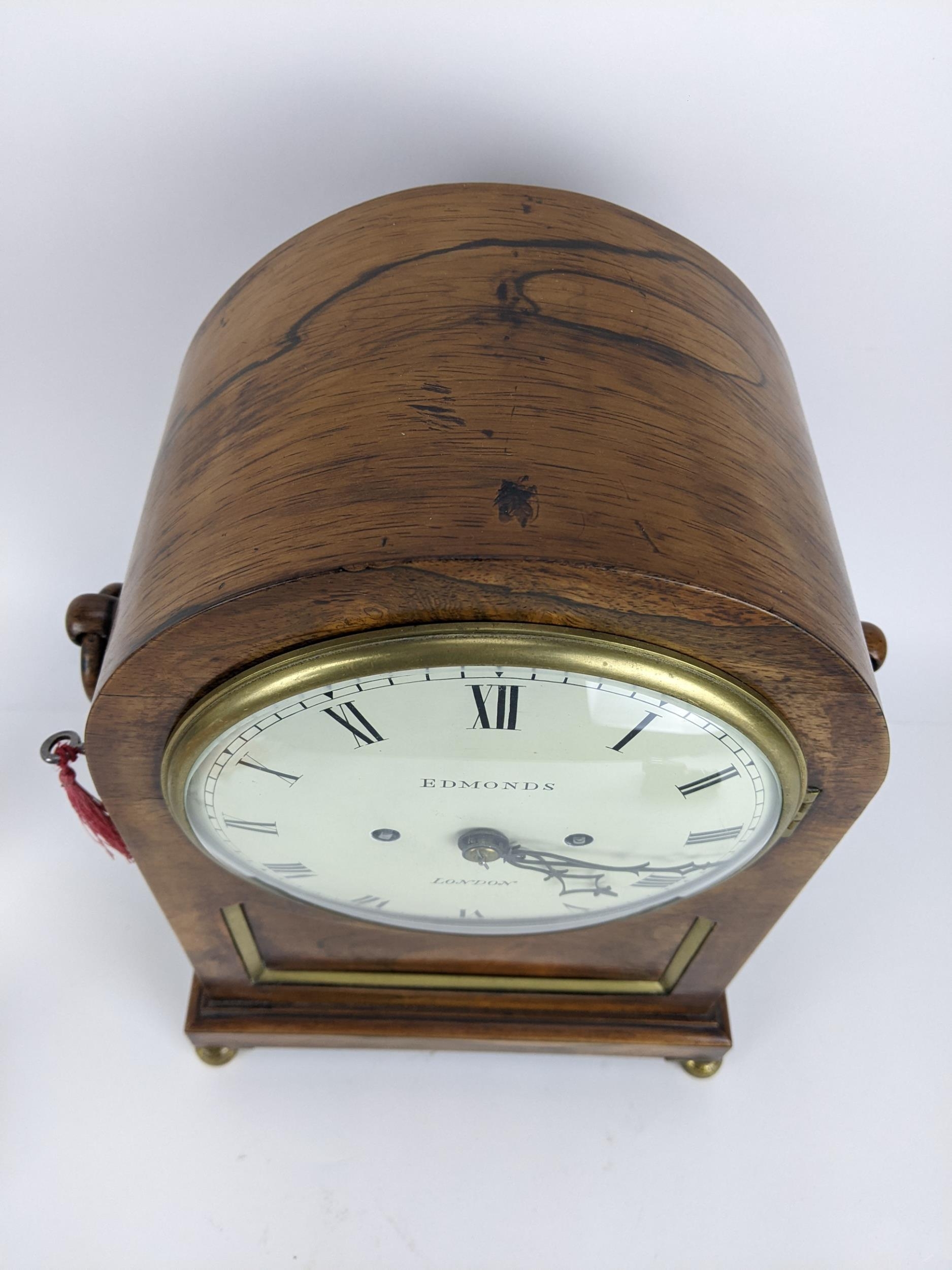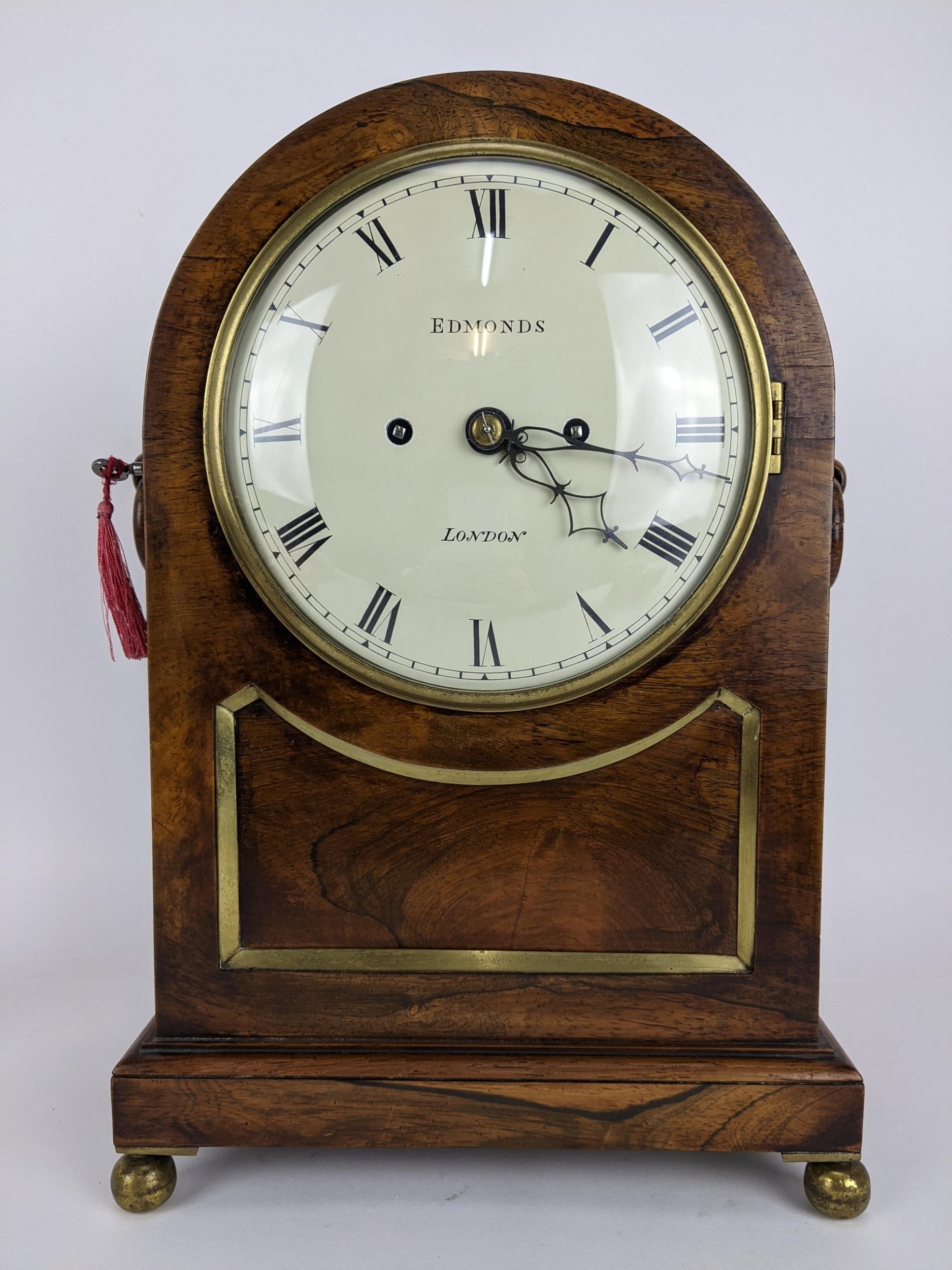 A Regency rosewood bracket clock having an arched top, two ring handles, pierced grilles to both sides, the convex 7" dial signed 'Edmunds London', the twin fusee movement striking on a single bell and back plate engraved 'Edmunds London', 39cm high x 27cm wide