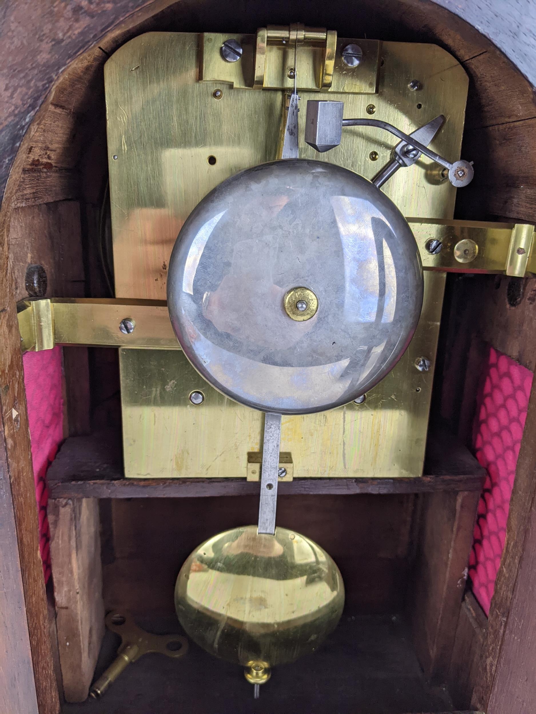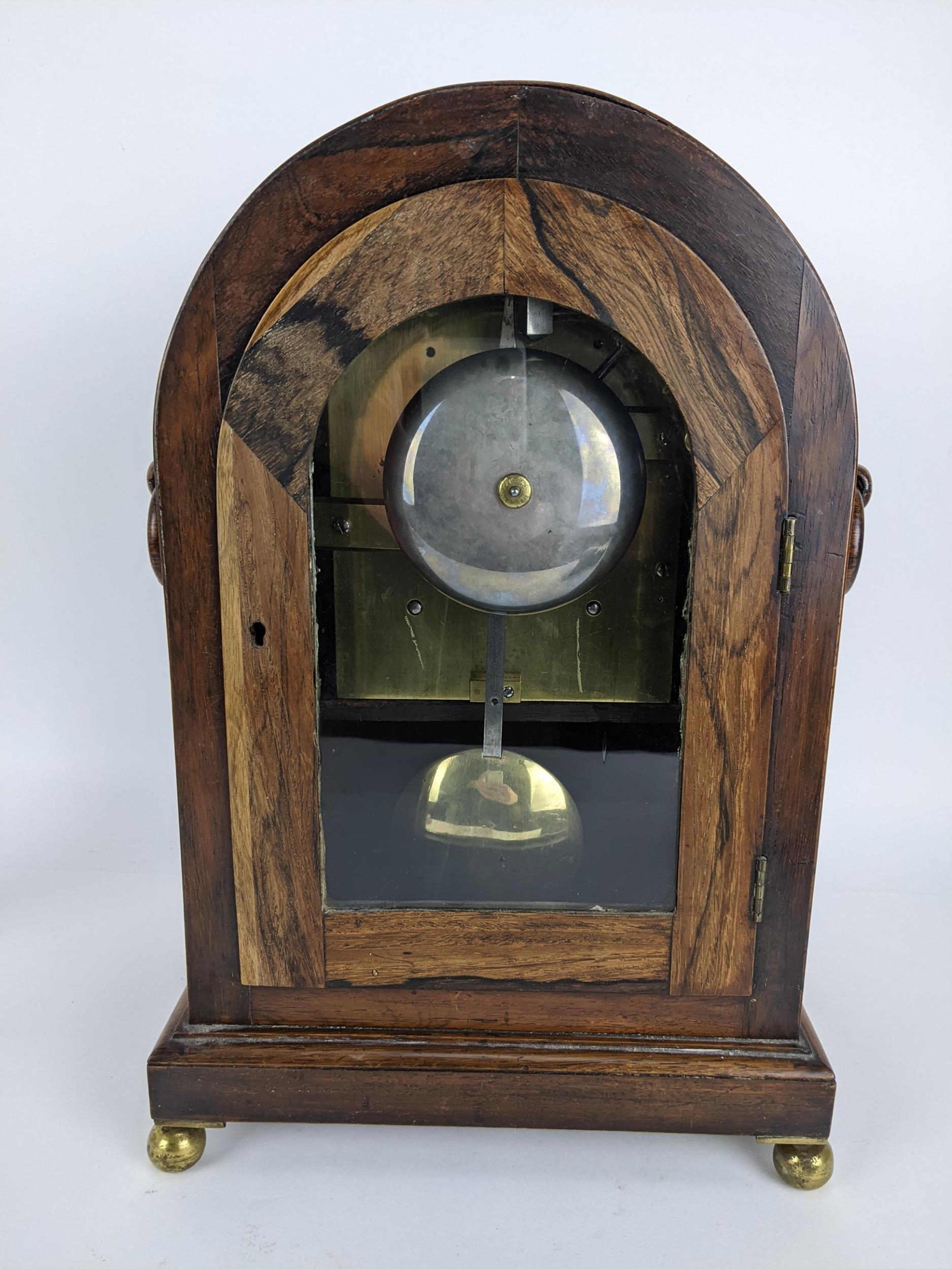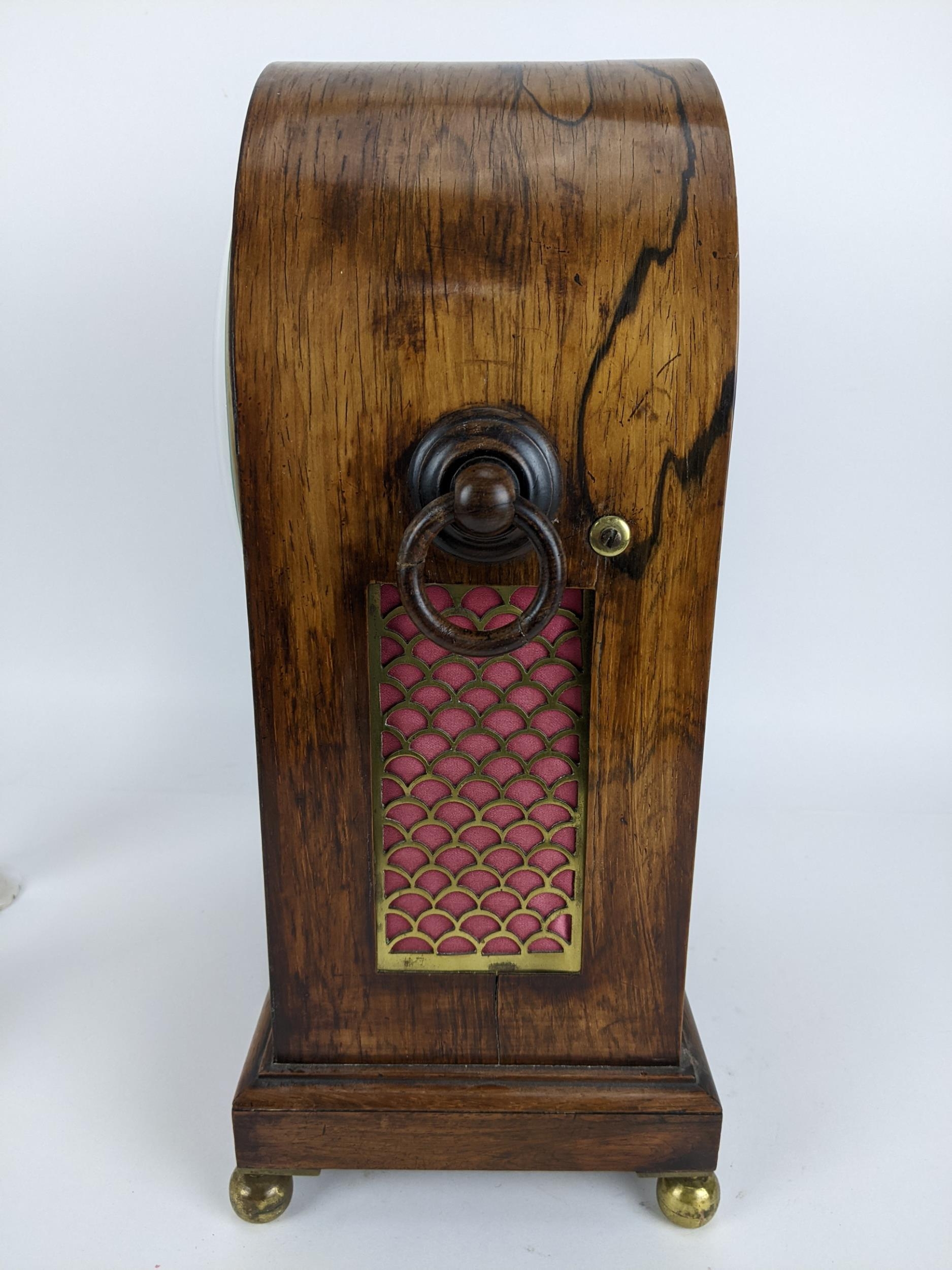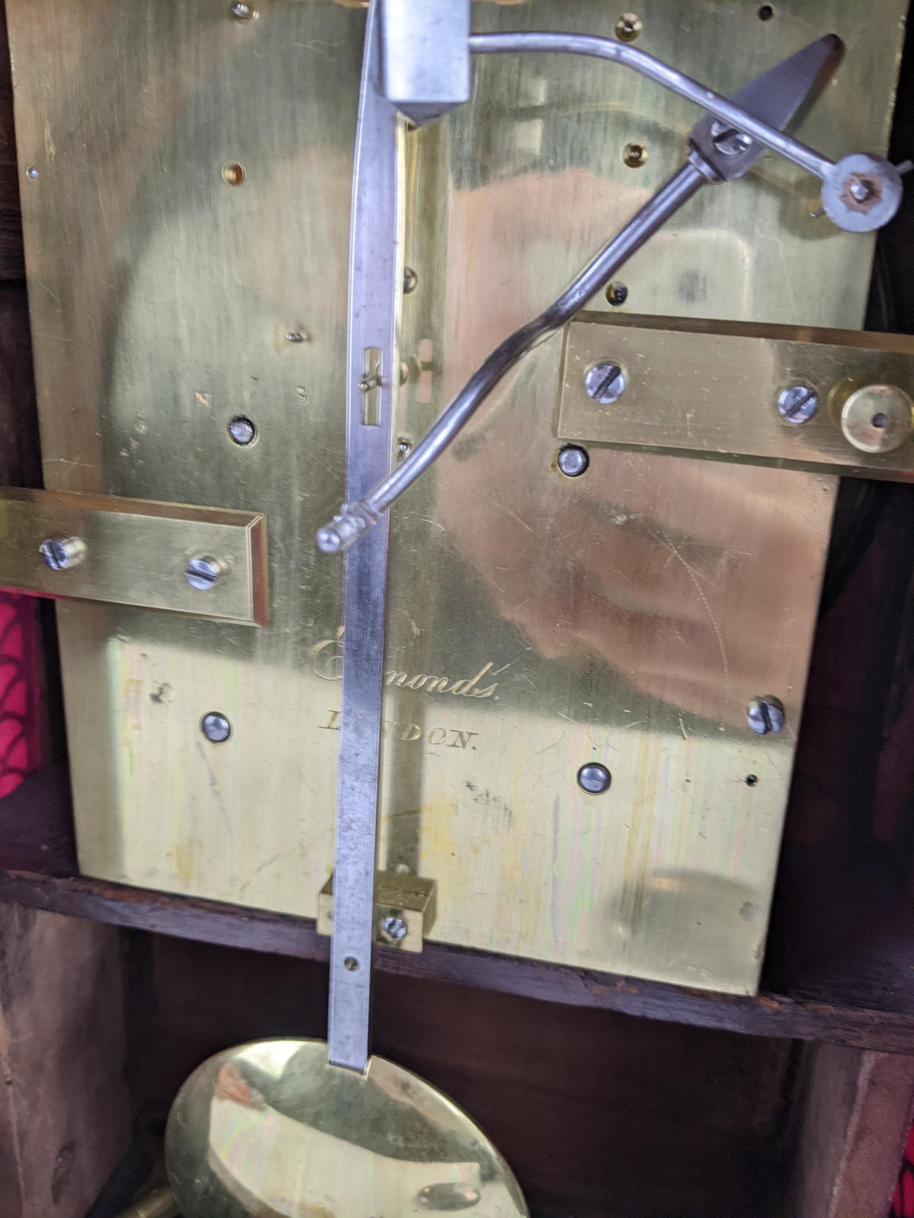 A Regency rosewood bracket clock having an arched top, two ring handles, pierced grilles to both sides, the convex 7" dial signed 'Edmunds London', the twin fusee movement striking on a single bell and back plate engraved 'Edmunds London', 39cm high x 27cm wide