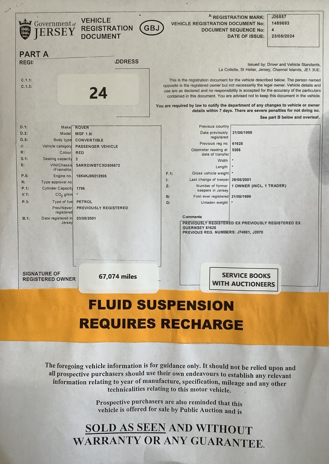 A 1999 Rover MGF 1.8i convertible roadster J36857 (petrol/manual), odometer reading 67,074 miles