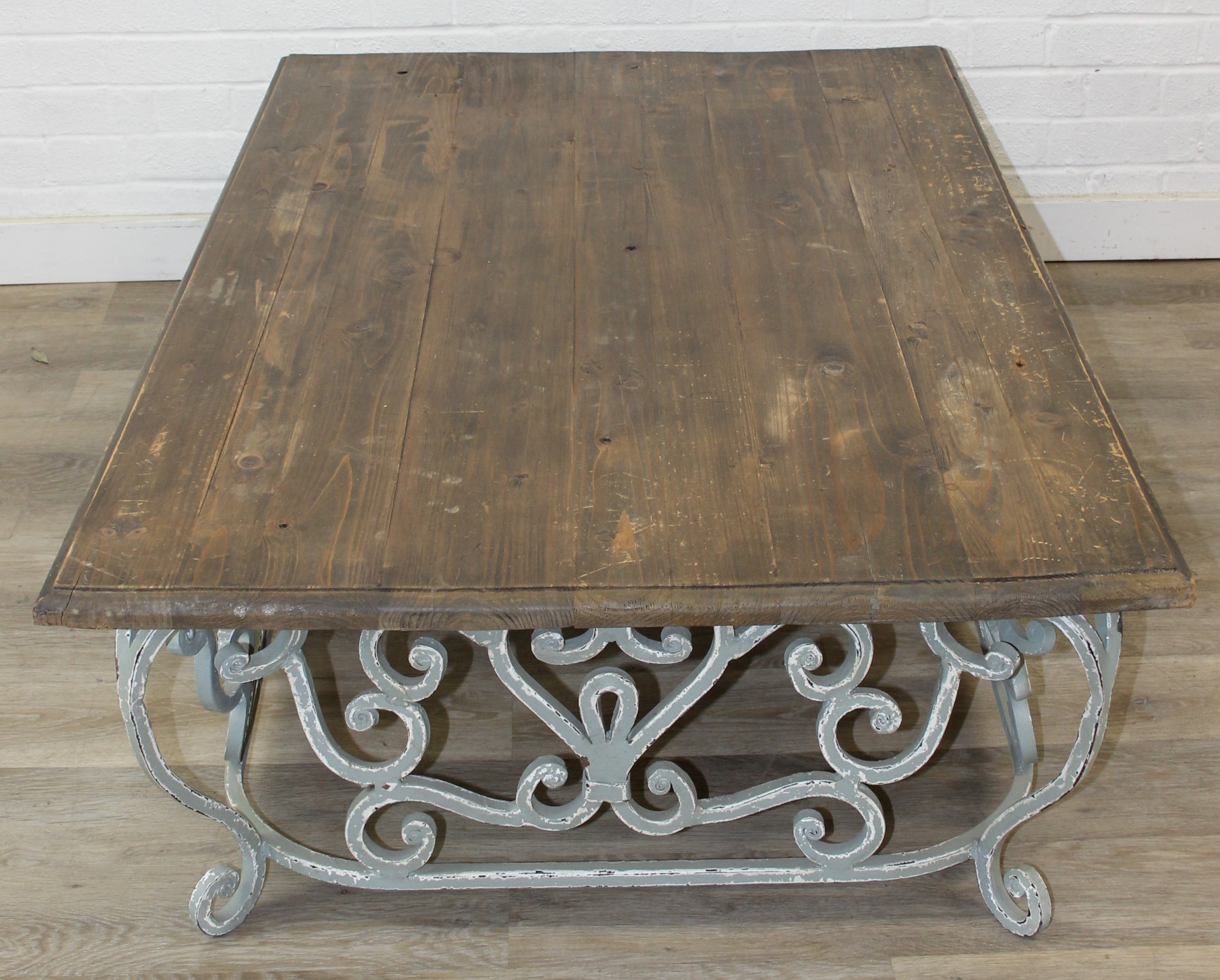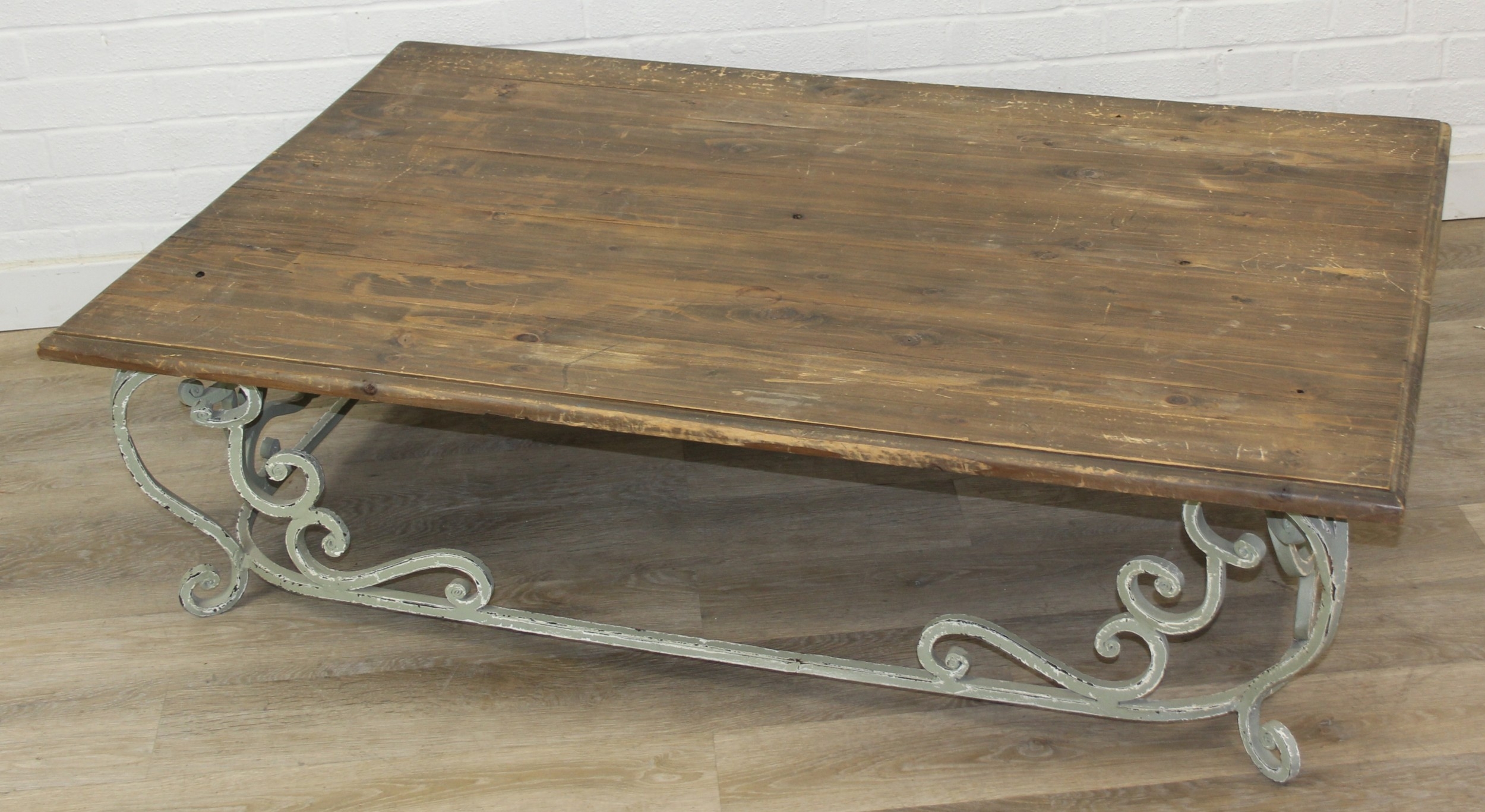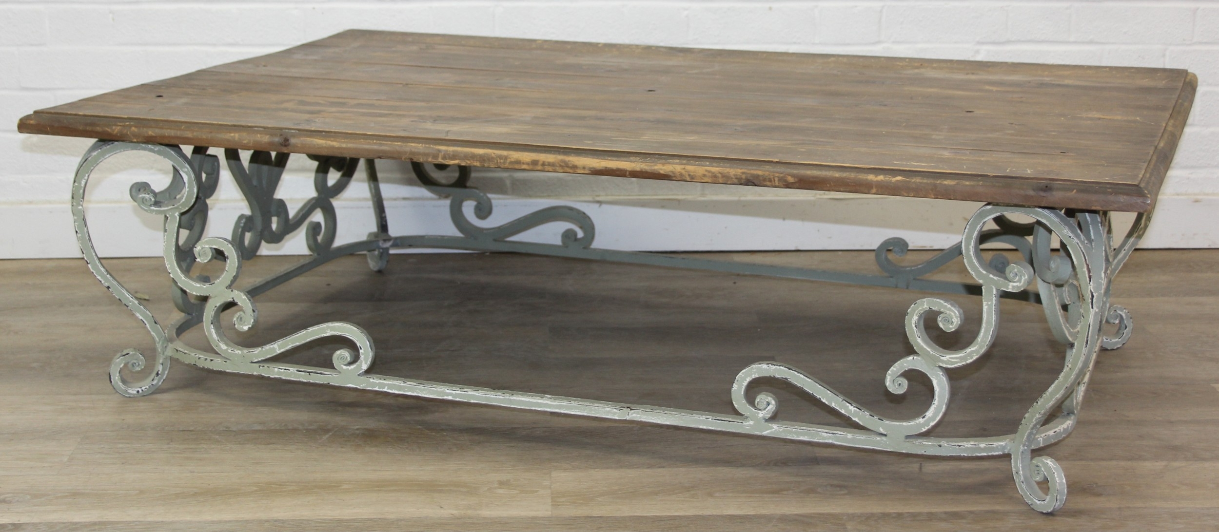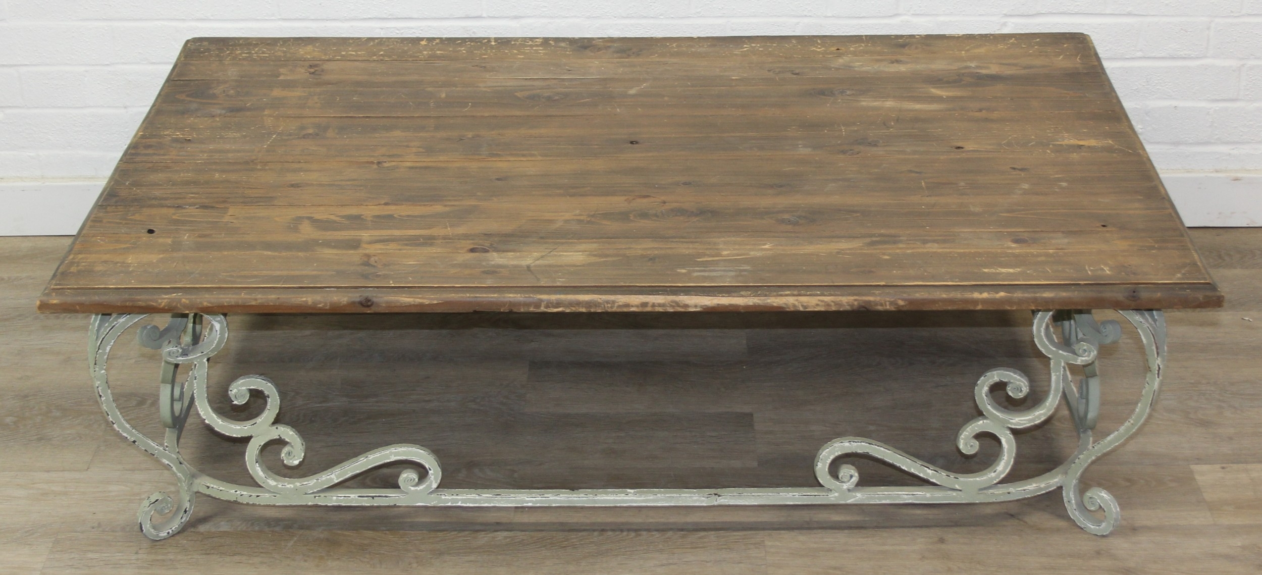 A vintage low table with distressed green painted wrought iron base, the top reclaimed pine, 140cm x 88cm x 40cm
