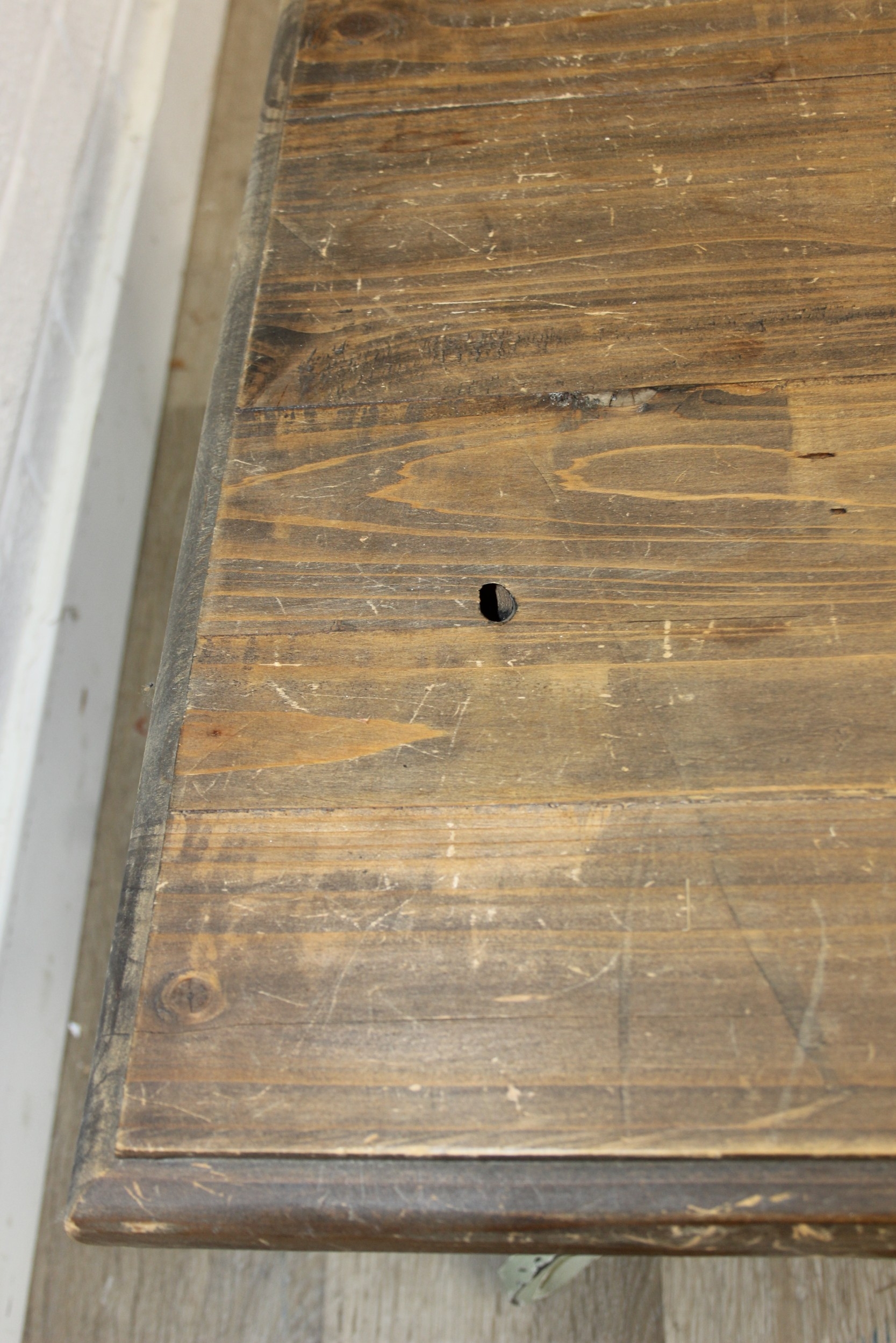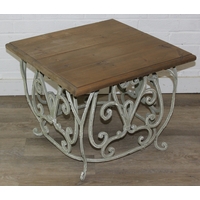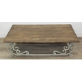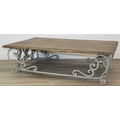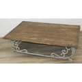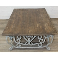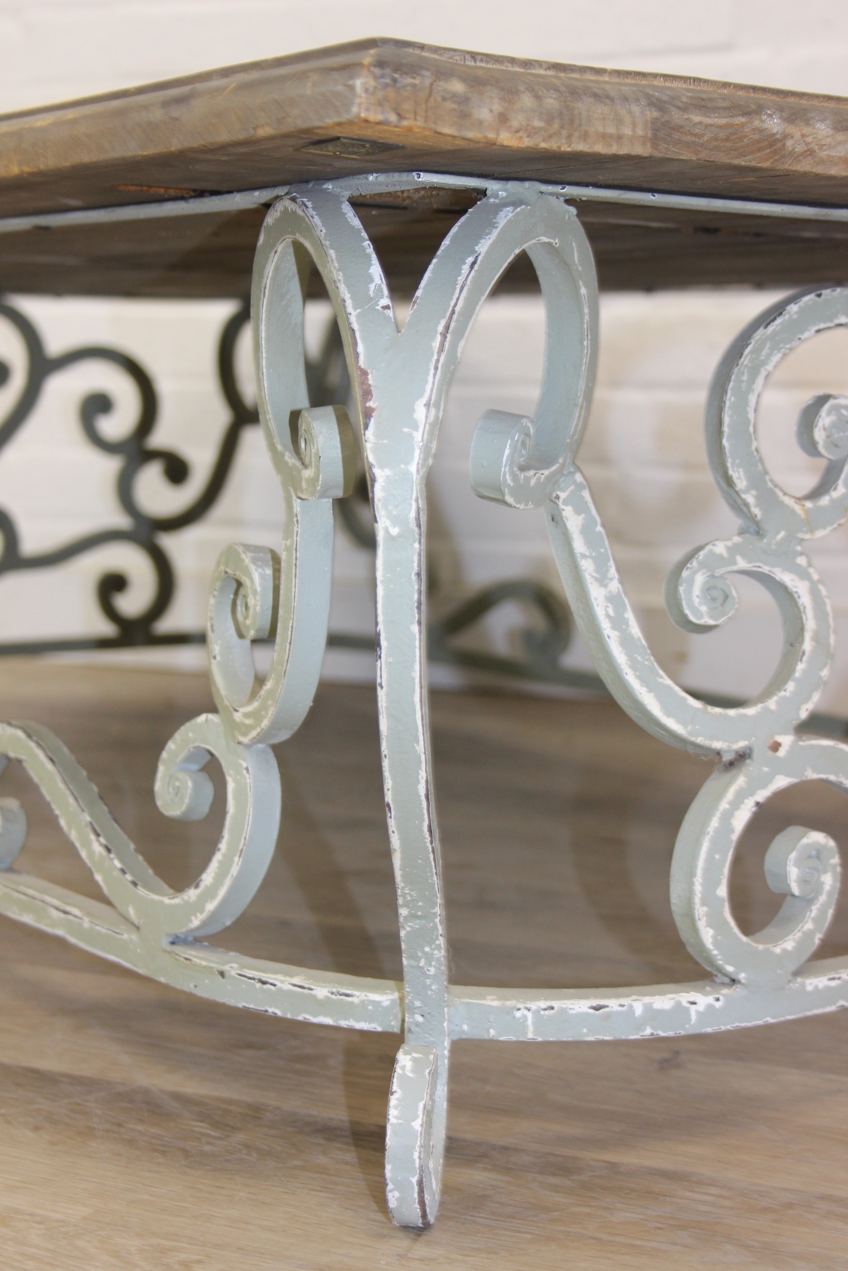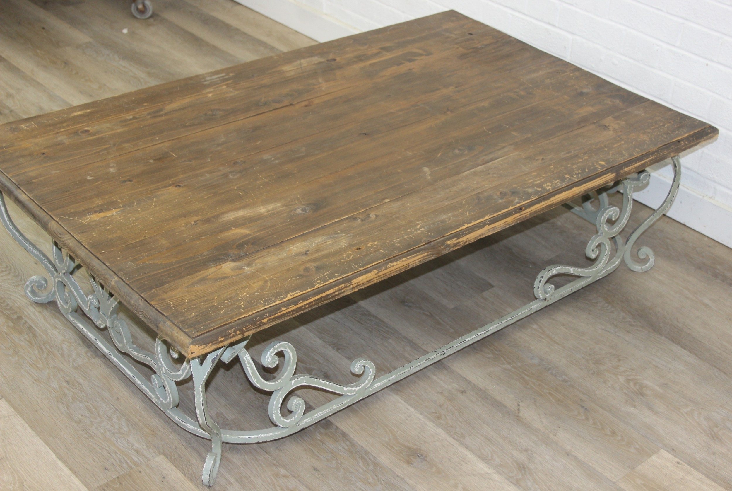 A vintage low table with distressed green painted wrought iron base, the top reclaimed pine, 140cm x 88cm x 40cm