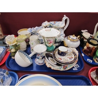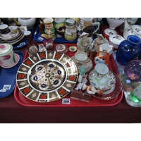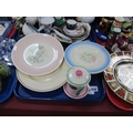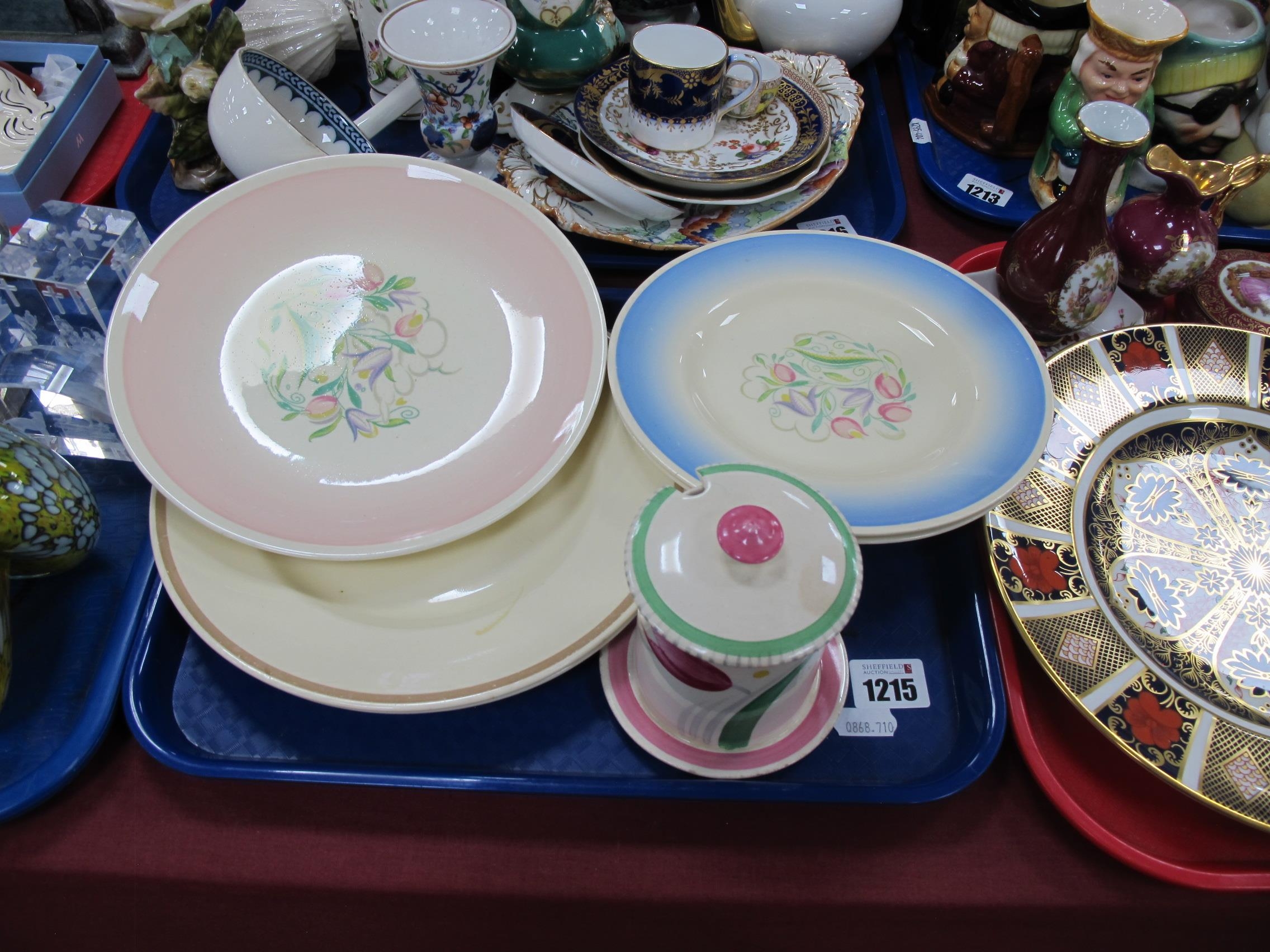 Susie Cooper Pink Fritillary Jam Pot, with cover, 9.5cm high, six plates, including leaping deer, Dresden sprays.