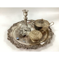 A Hallmarked Silver Salt, Birmingham 1912, of oval pierced form, raised on four pad feet, with blue glass liner; a pair of plated spoons, a hallmarked silver pepperette, of geometric pierced design, a similar hallmarked silver oval lidded mustard, etc.