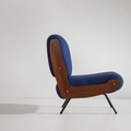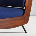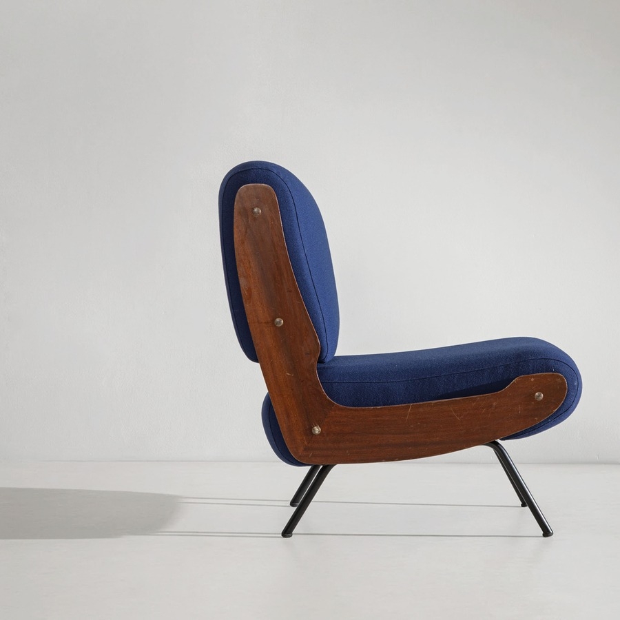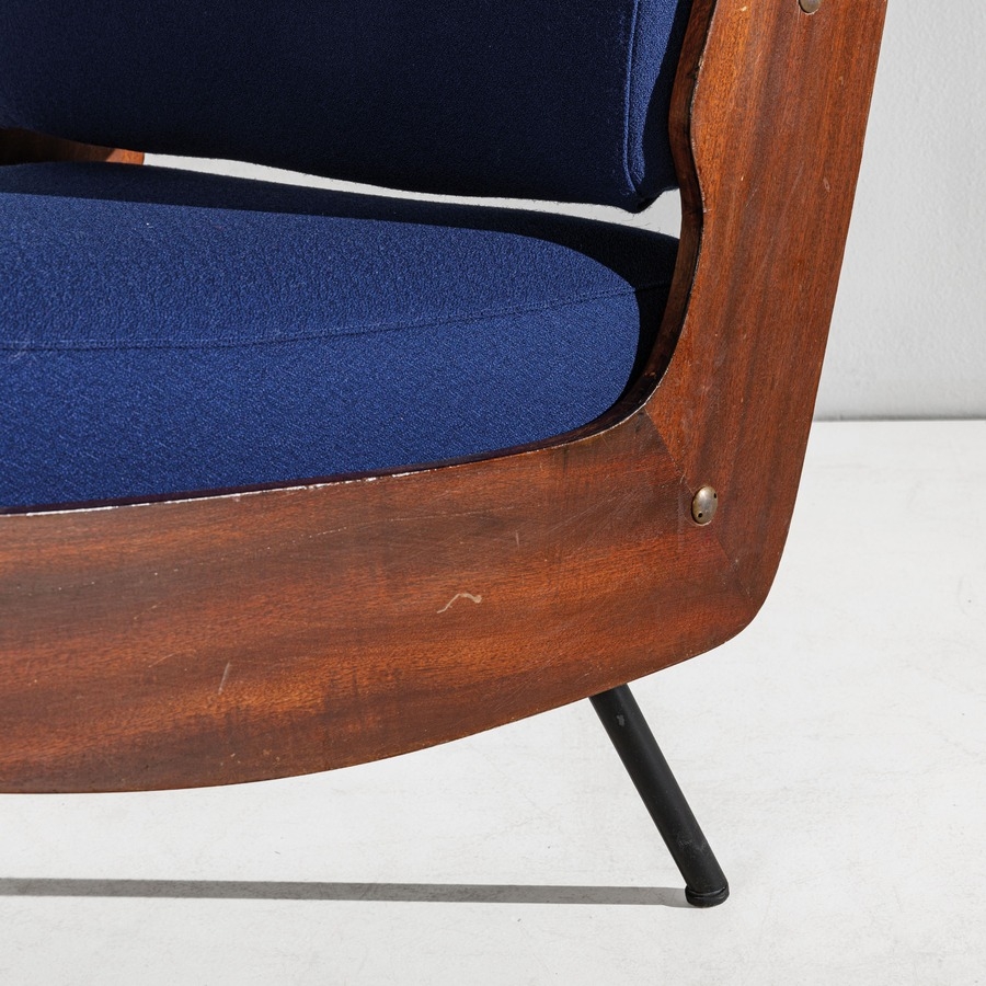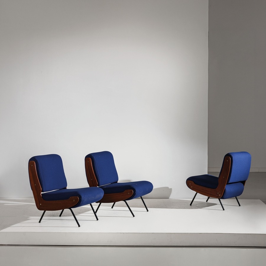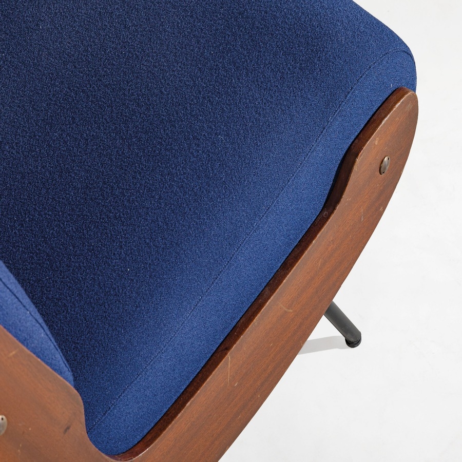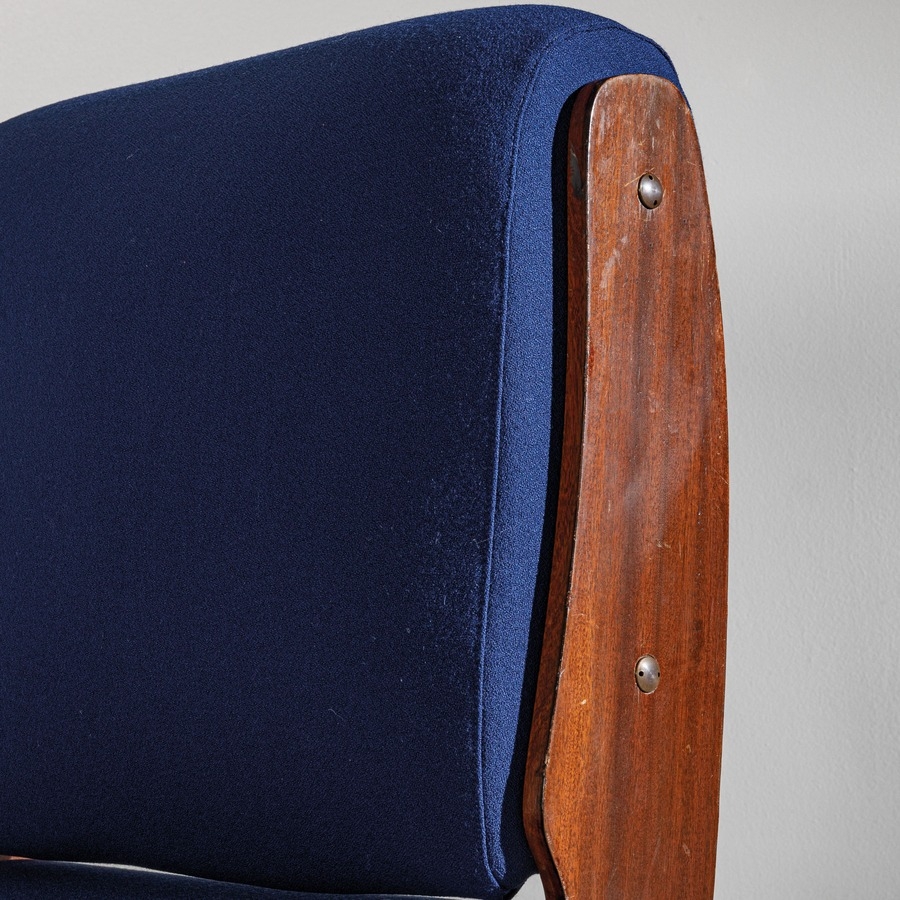 Tre poltrone modulari mod. 836. Compensato lastronato in legno di mogano, metallo, tessuto imbottito. Produzione Cassina, 1955 ca.