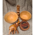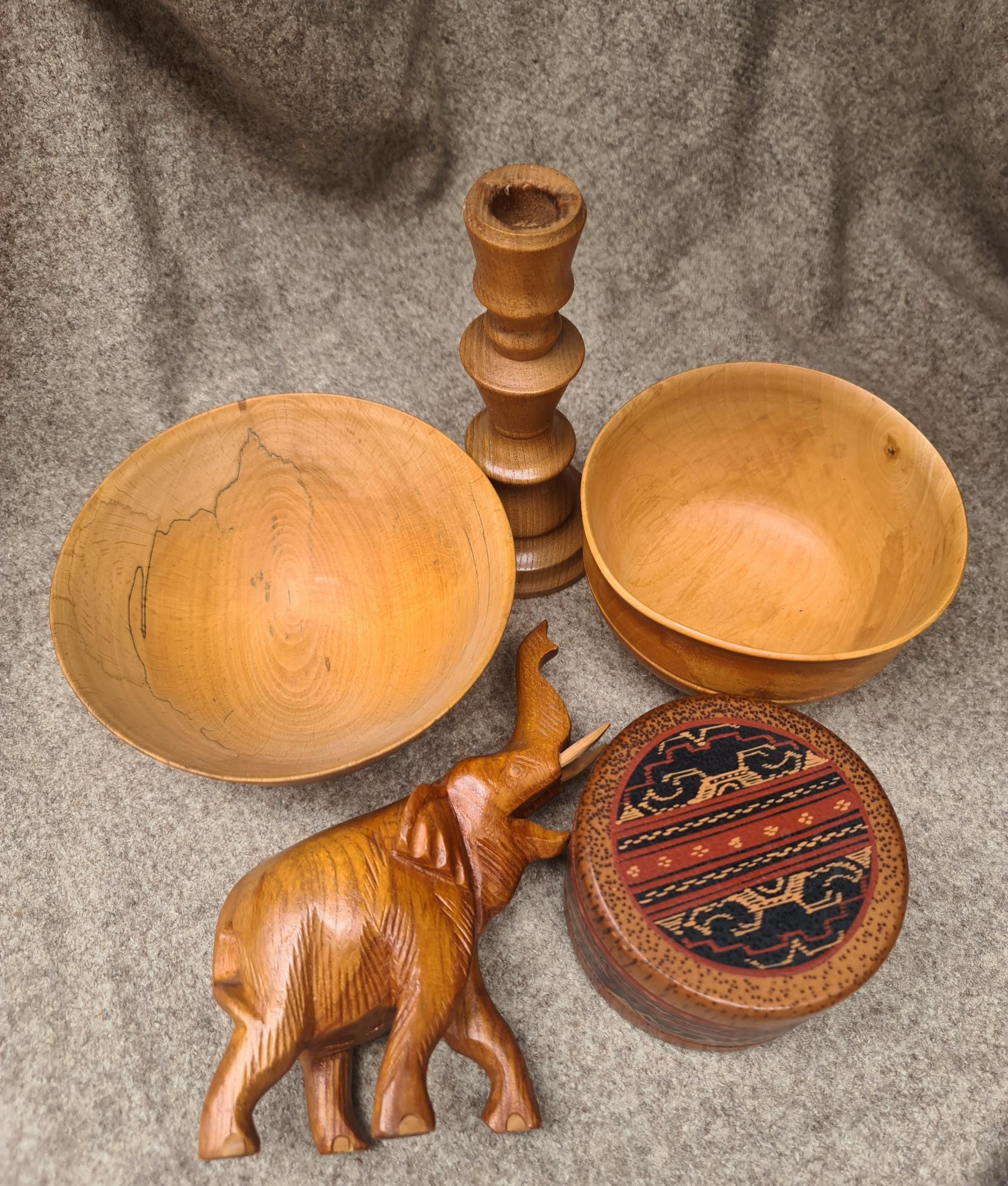 Vintage Wooden Bowls Box Candlestick and Elephant. The candlestick measures 19cm tall. Shipping is available. Please ask for a quote before bidding. Where possible we combine shipping costs. Remember, if you are the highest bidder above reserve on this Lot you have bought the item and are legally responsible for the item. Viewing is recommended in either person or via video link. Contact us to arrange.
