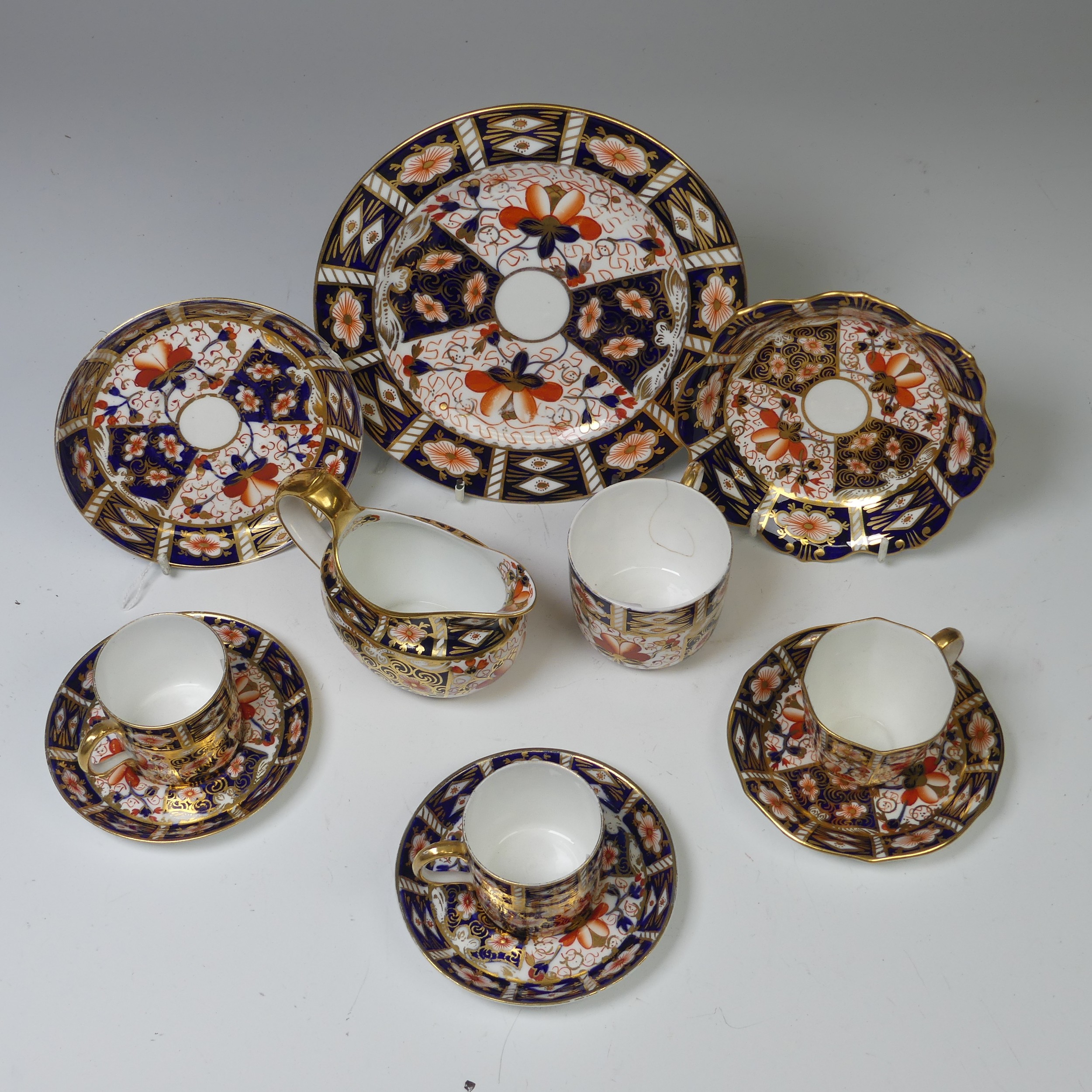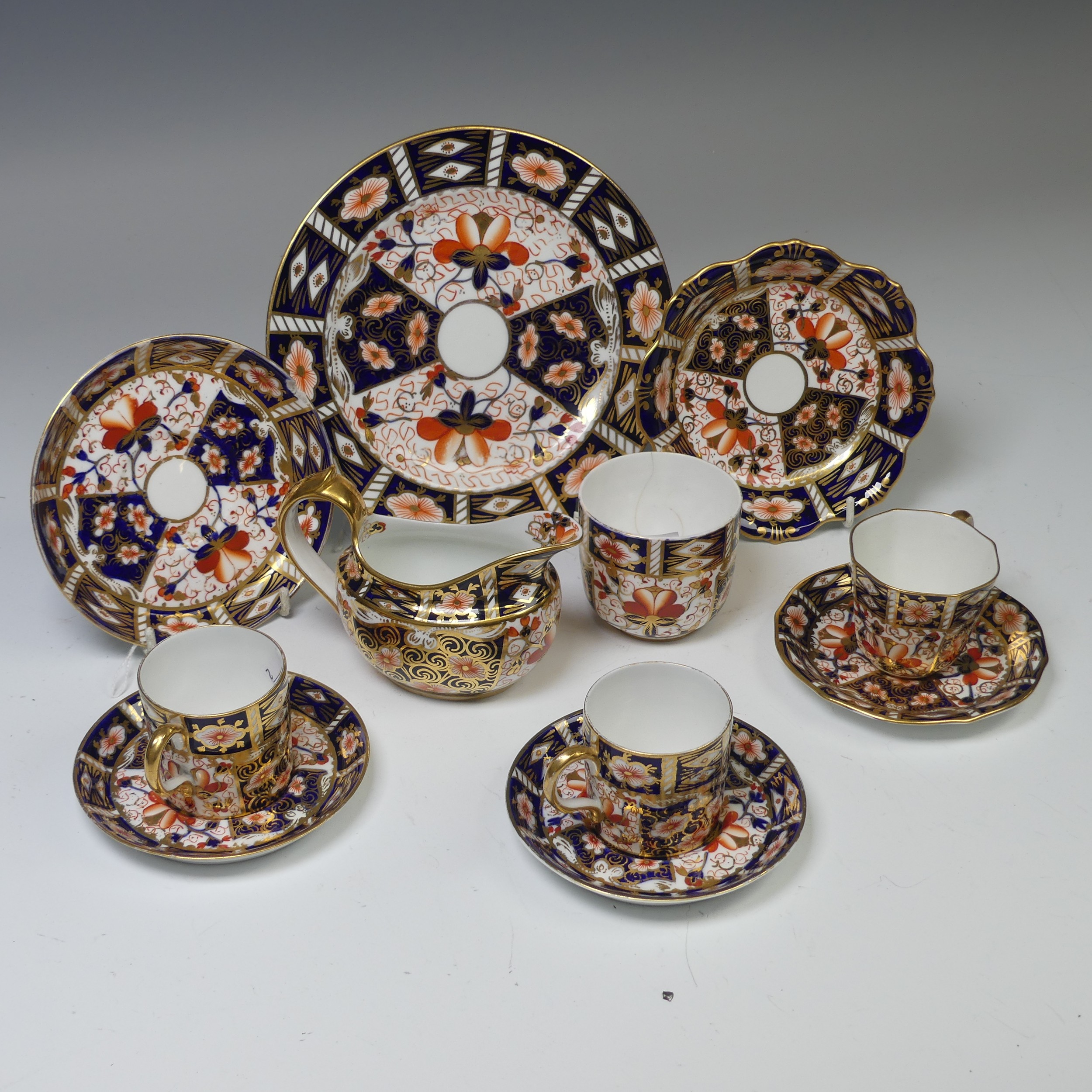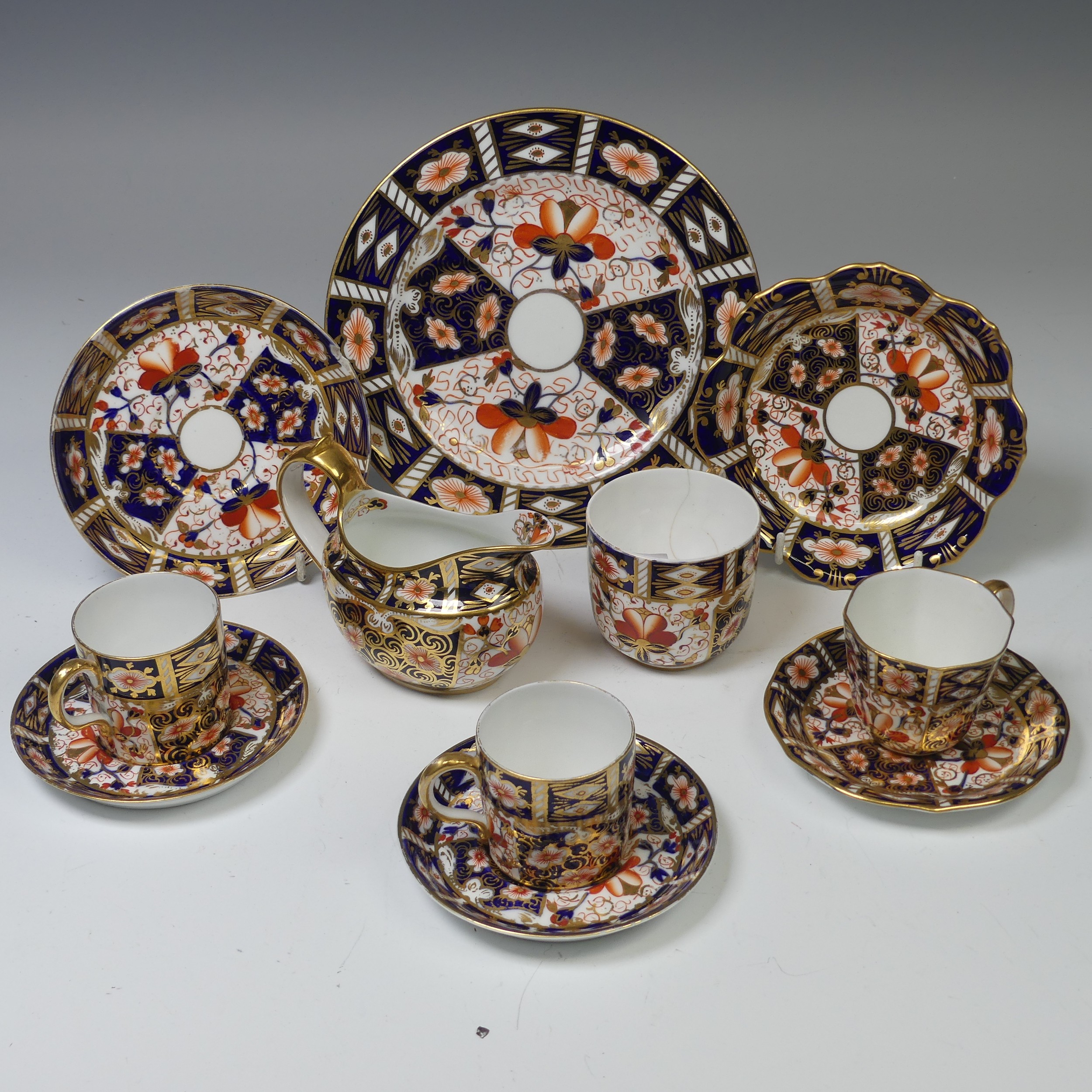 A Royal Crown Derby 2451 pattern Imari cream Jug, together with ten other pieces of 2451 Royal Crown Derby, including a pair of cups and saucers, small dish, plate, another cup and saucer, etc. (a lot). Note damage to one cup and one saucer, please see images.