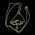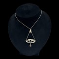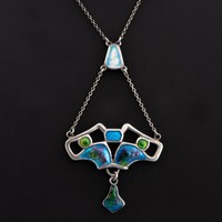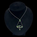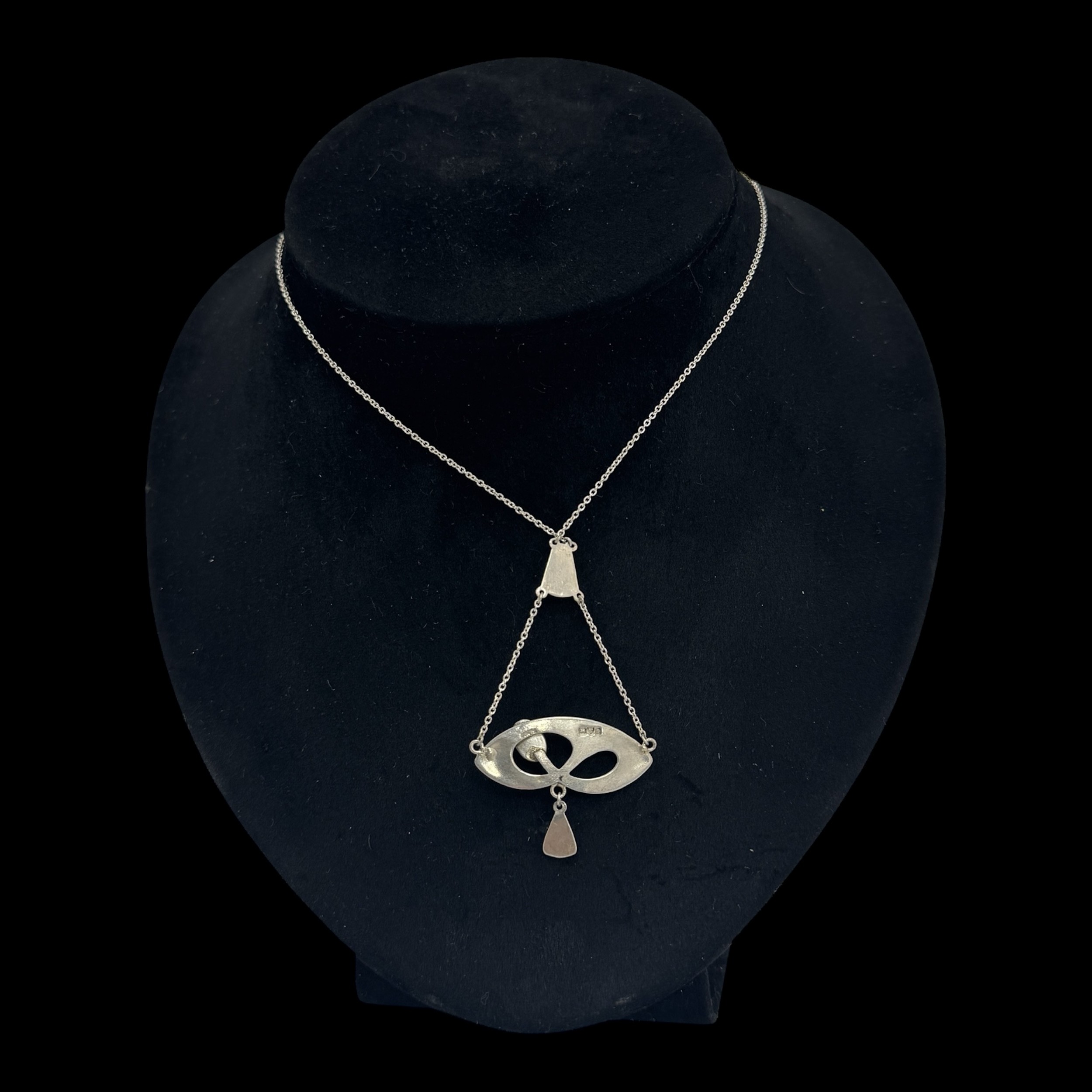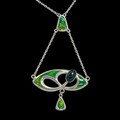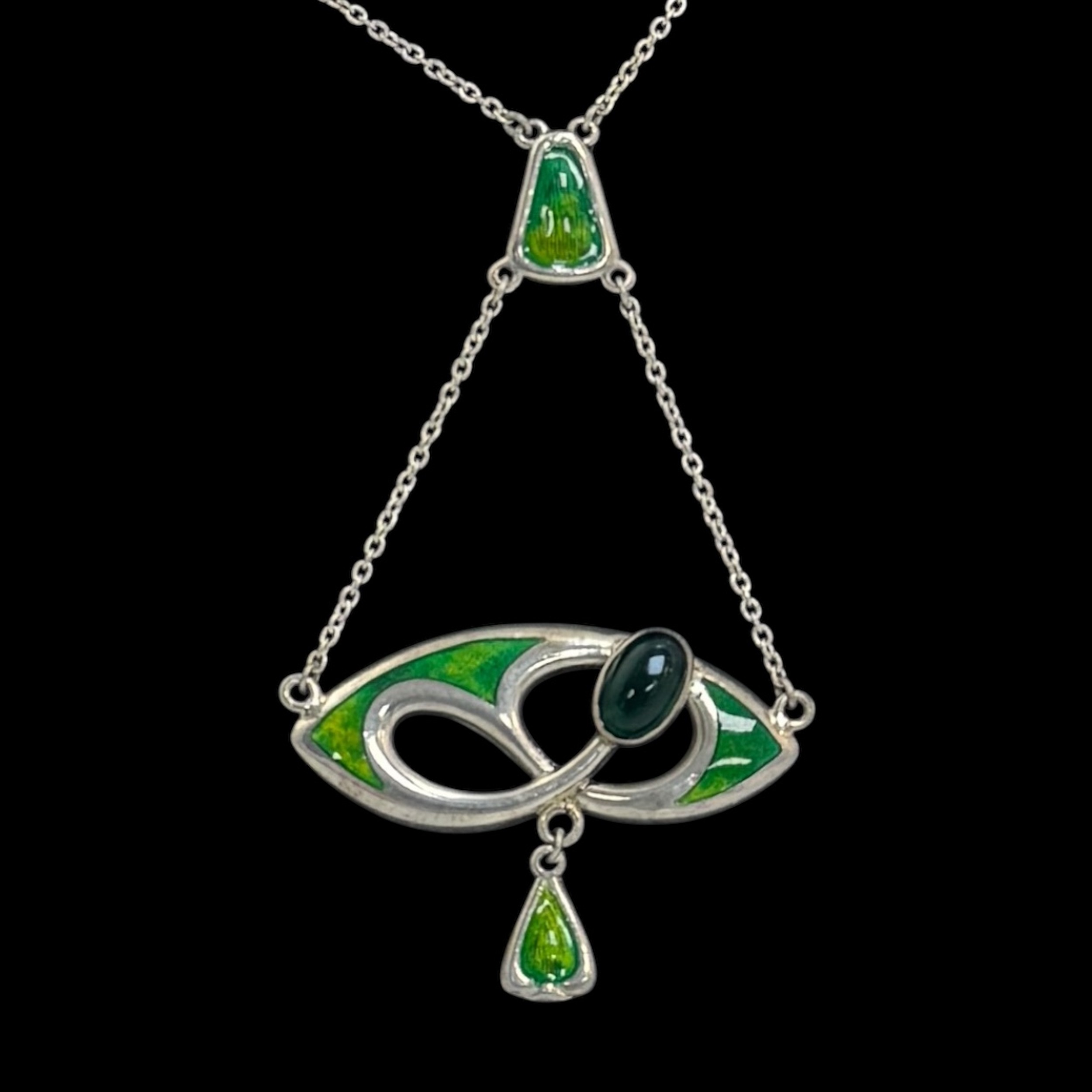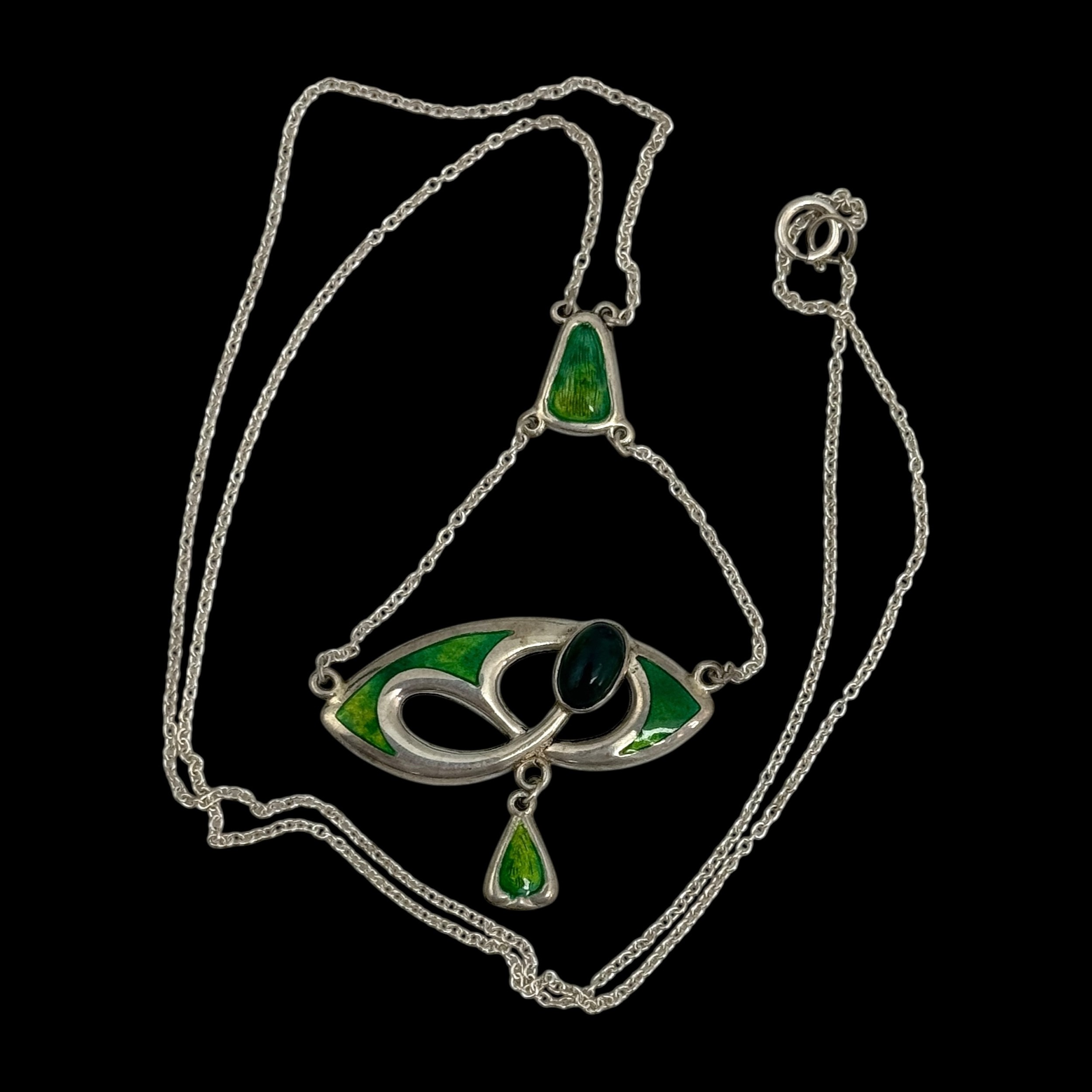 A Charles Horner silver and enamel pendant, decorated with an openwork design set with a dark green glass bead, with triangular suspender supporting two chains, with 'CH' makers marks and Chester hallmarks for 1905, 46cm total chain length, 5.4cm pendant drop, 5.8g weight. (LDC16119)
