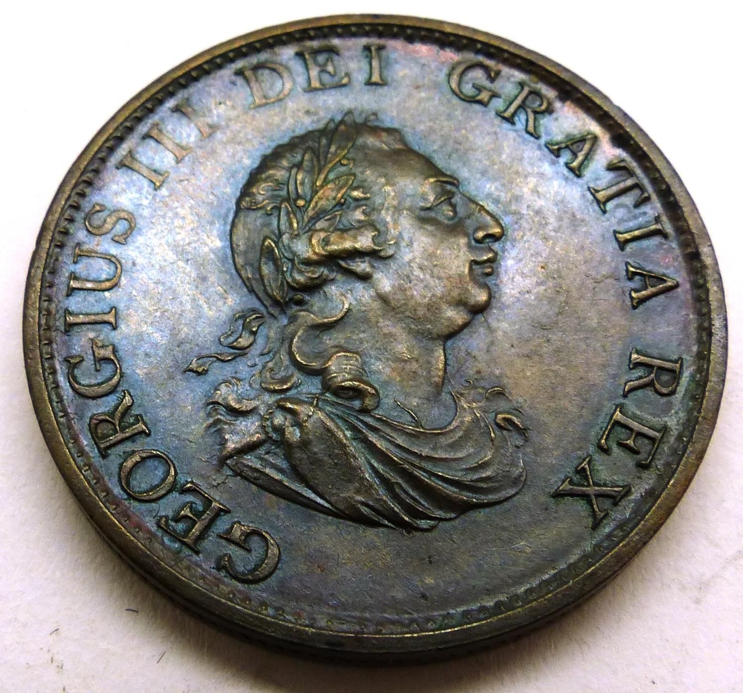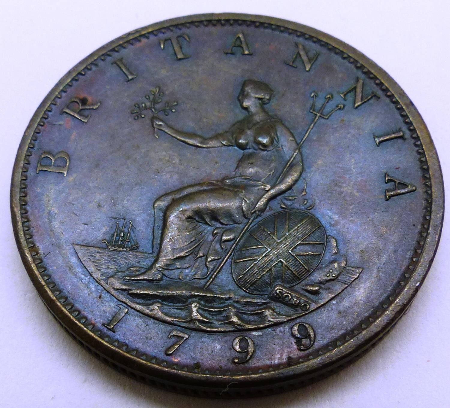 1799 halfpenny of George III, near UNC. P&P Group 1 (£14+VAT for the first lot and £1+VAT for subsequent lots)