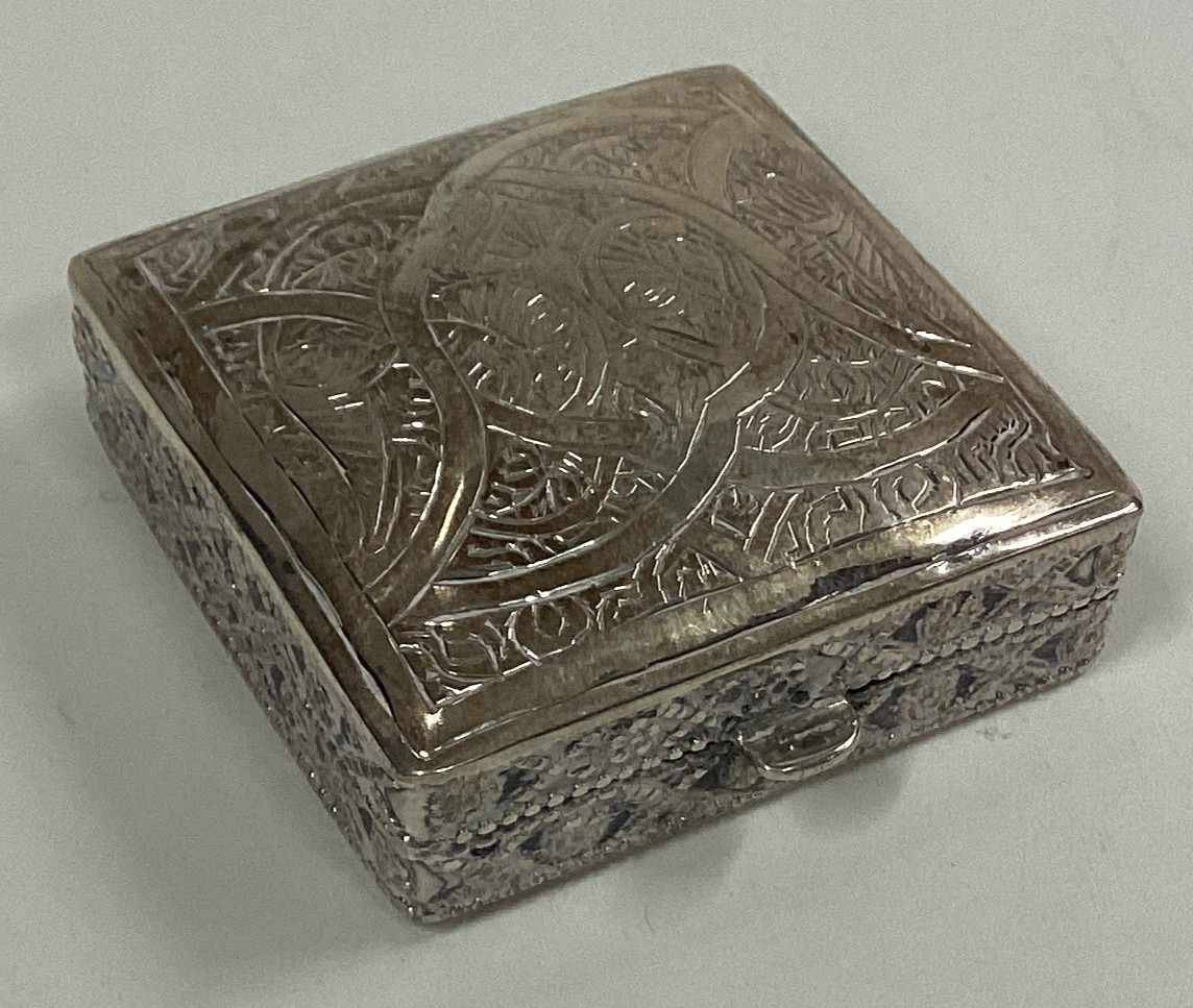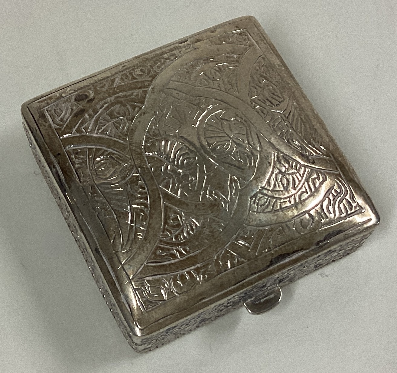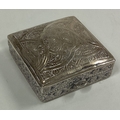 A heavy Continental silver square pill box with hinged lid. Marked to interior. Approx. 46 grams. Est. £40 - £60.