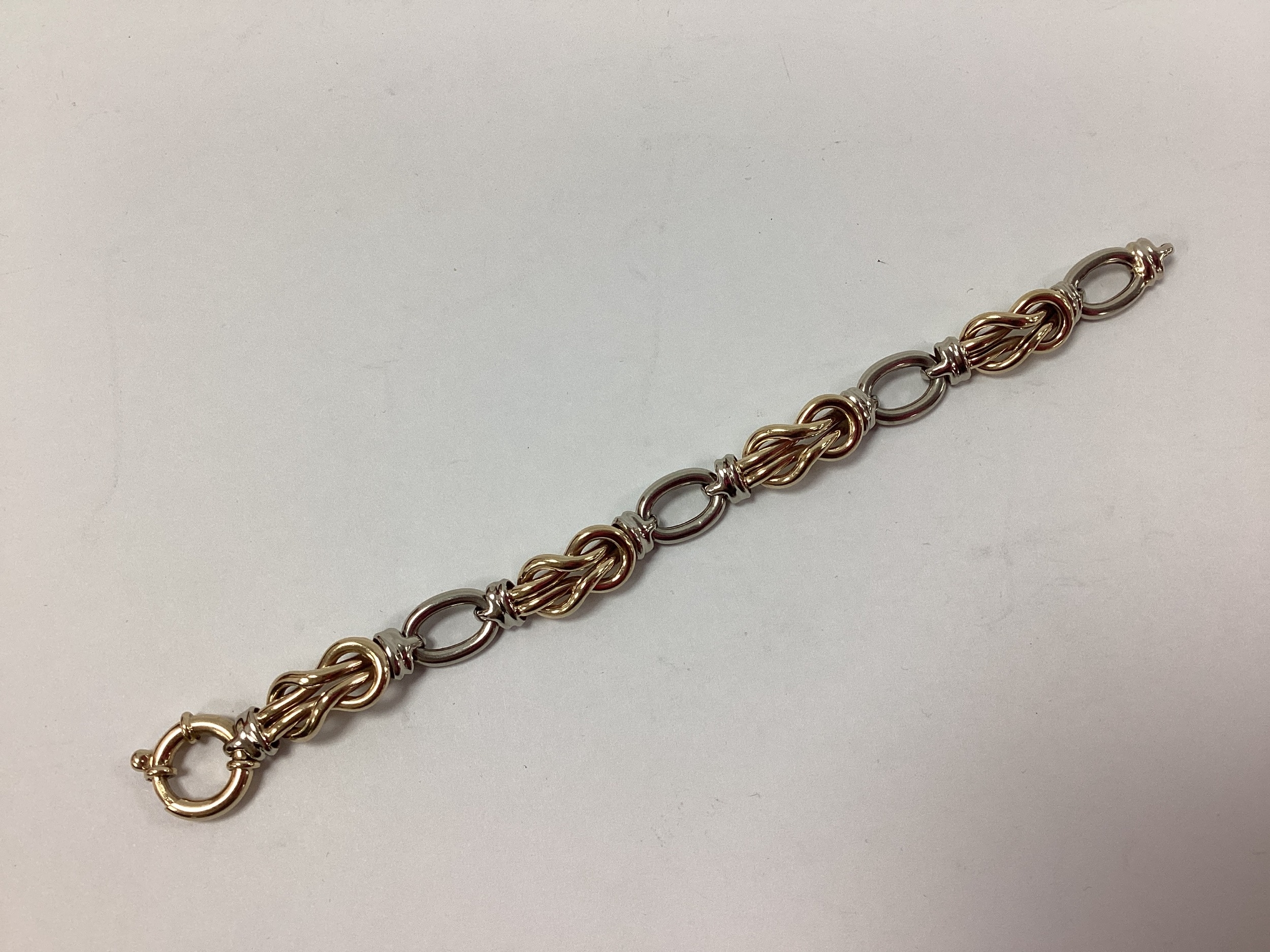 A 9ct Gold Two Colour Gold Hollow Fancy Link Bracelet, to large bolt ring clasp, 18cm long (15.5grams).