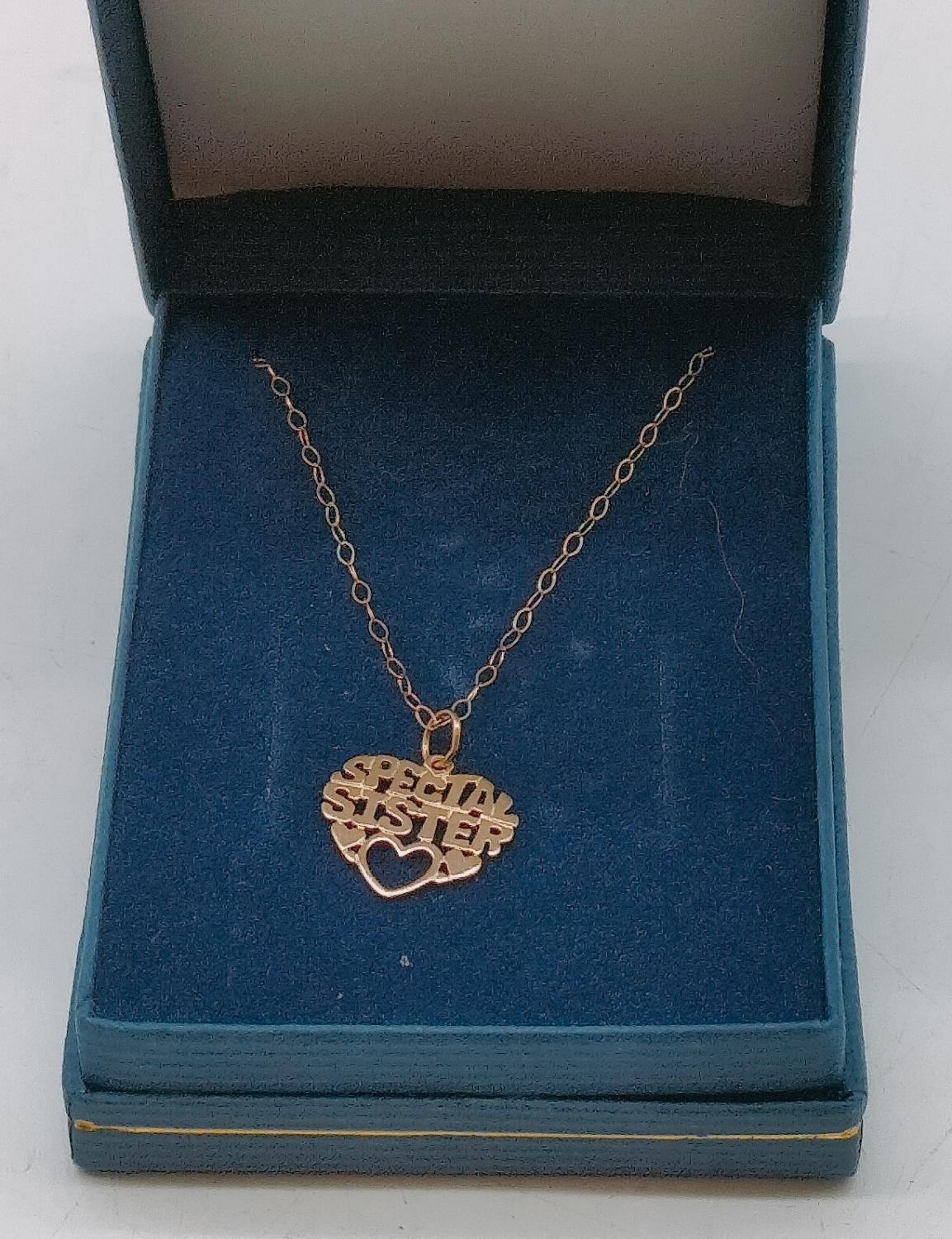 9ct Gold Necklace and 'Special Sister' Pendant. 0.7 Grams.