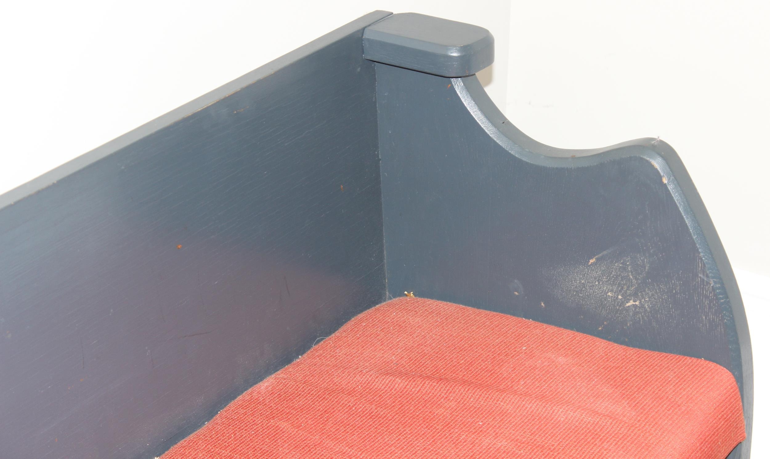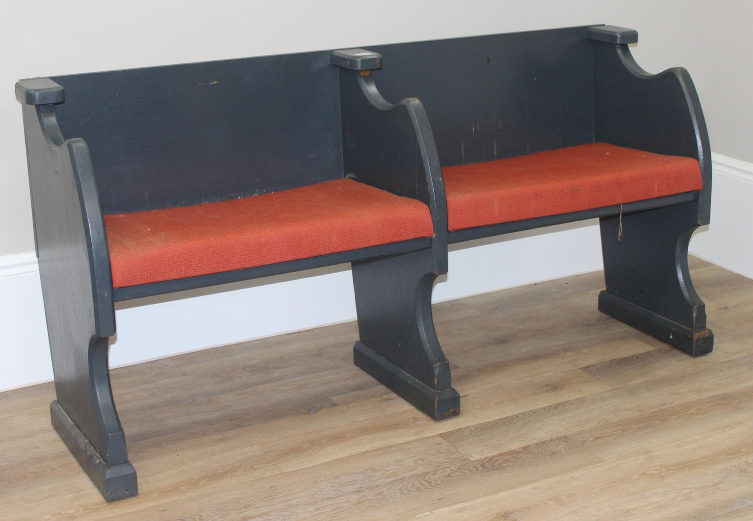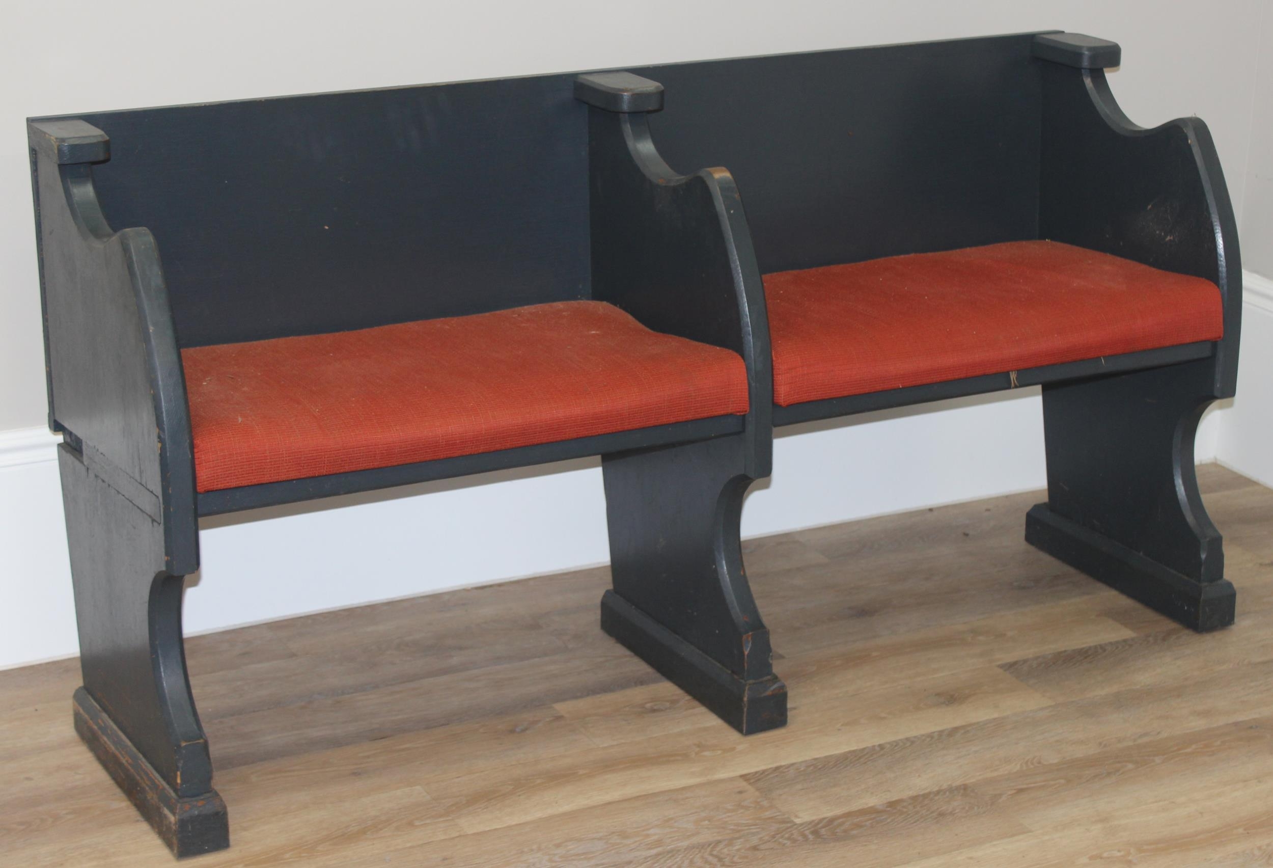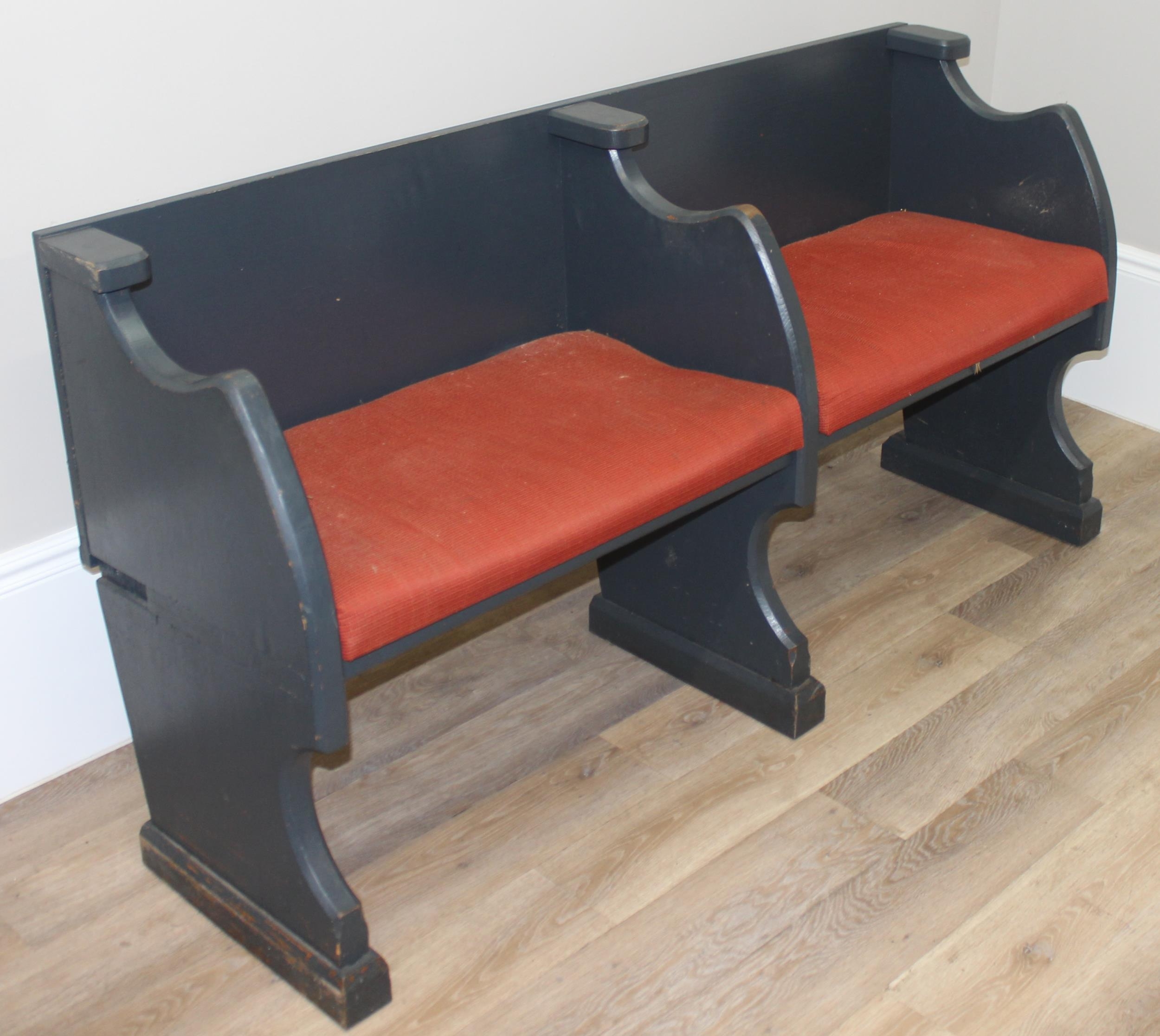 2 vintage double-seat painted oak benches or settles with cushioned seats, approx 170cm wide x 48cm deep x 83cm tall