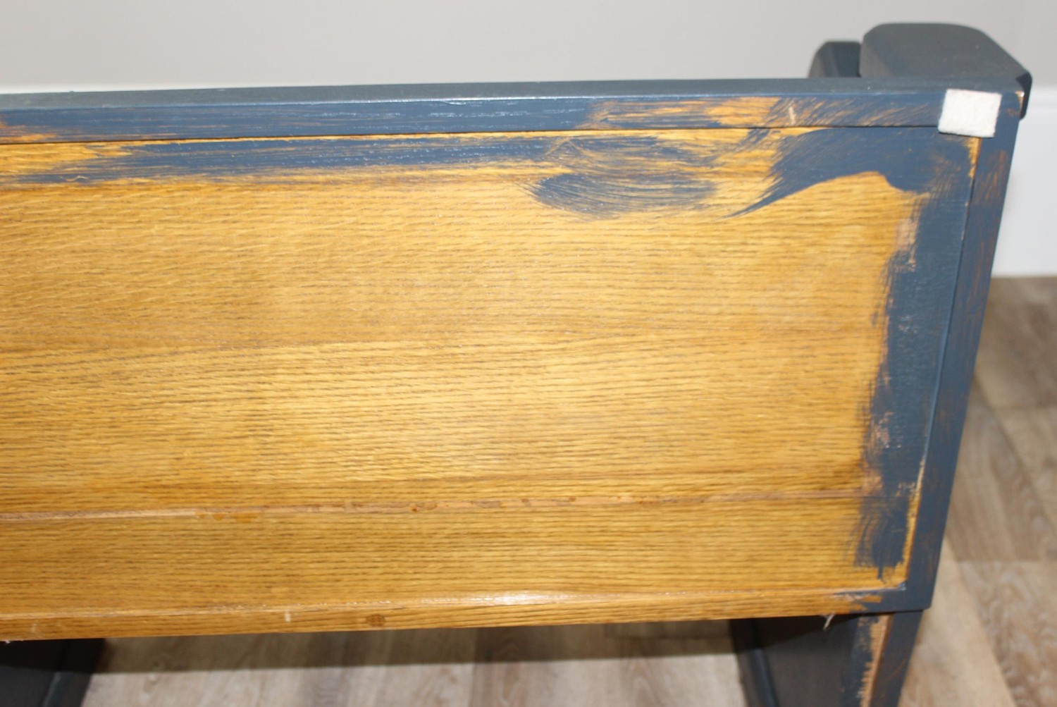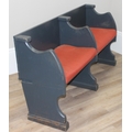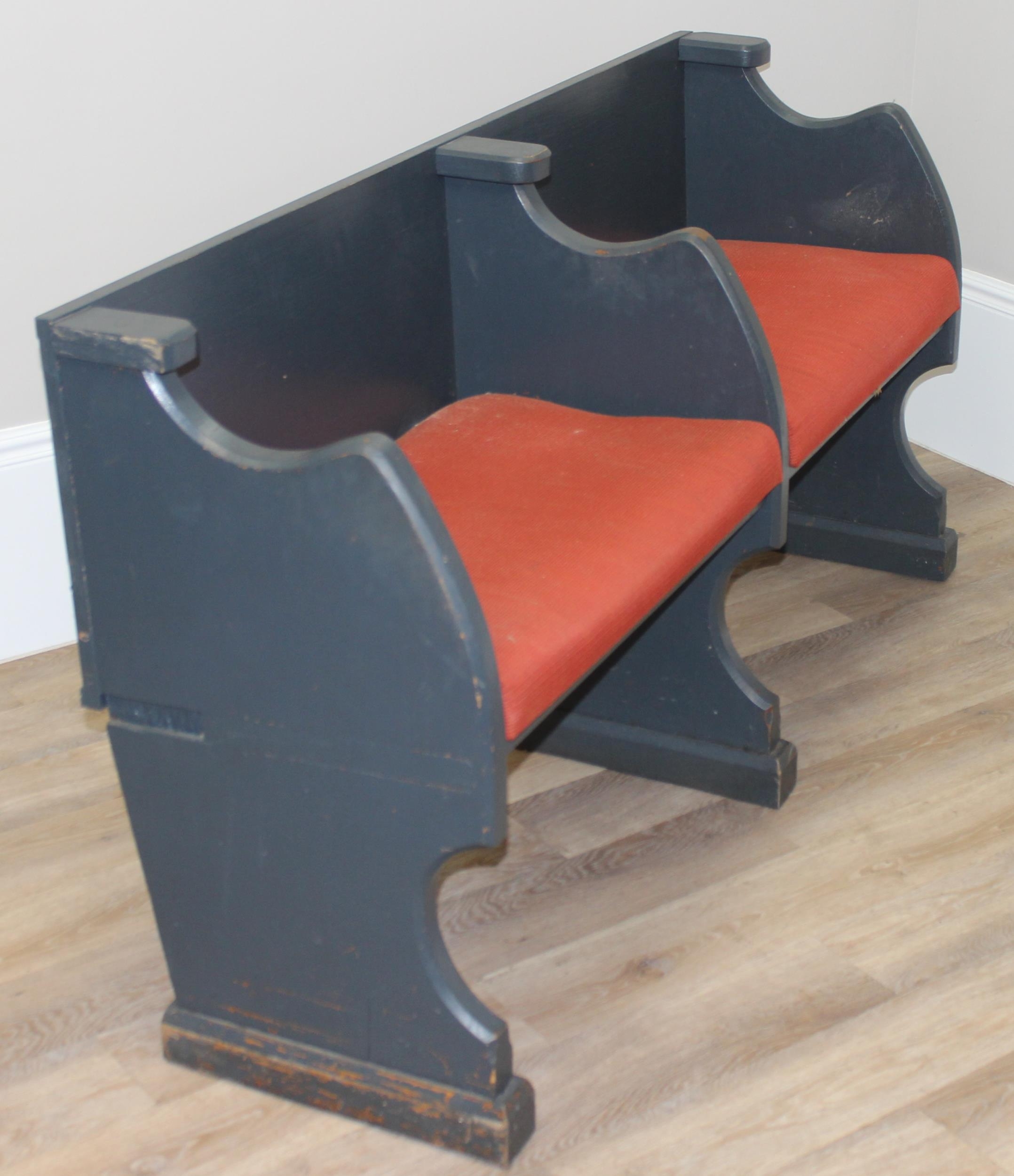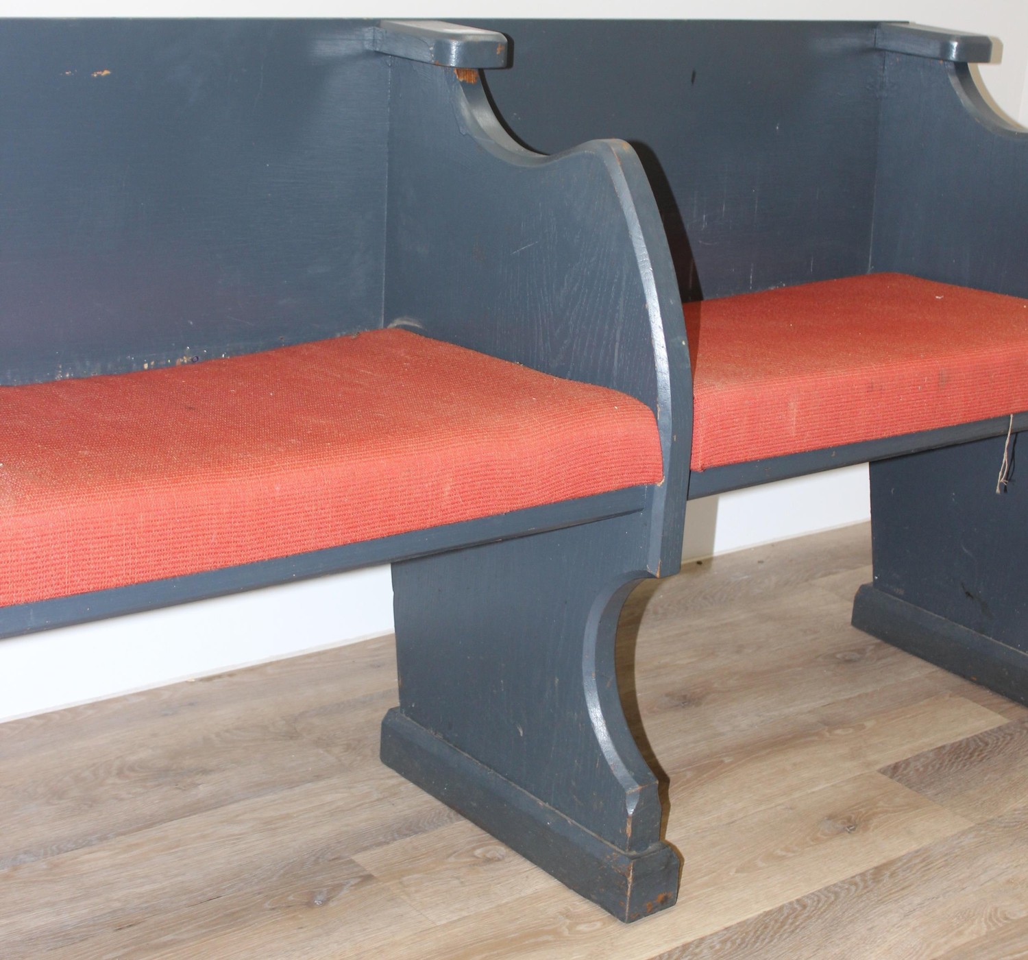 2 vintage double-seat painted oak benches or settles with cushioned seats, approx 170cm wide x 48cm deep x 83cm tall